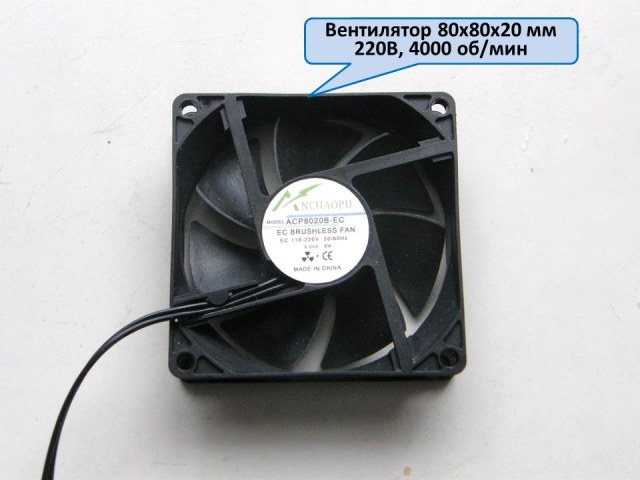 На Алиэкспресс приобрел вентилятор 80х80х20 мм с питанием от 220 вольт и скоростью вращения 4000 об/мин, который по расстоянию между отверстиями для крепления идеально подходит к корпусу компрессора.