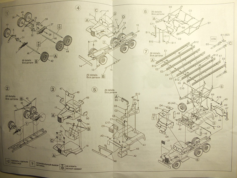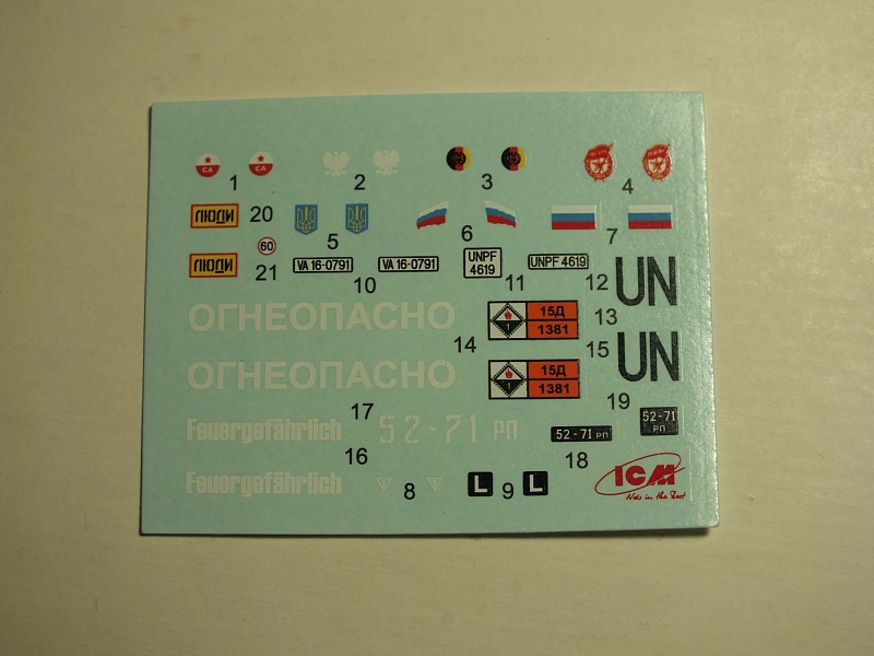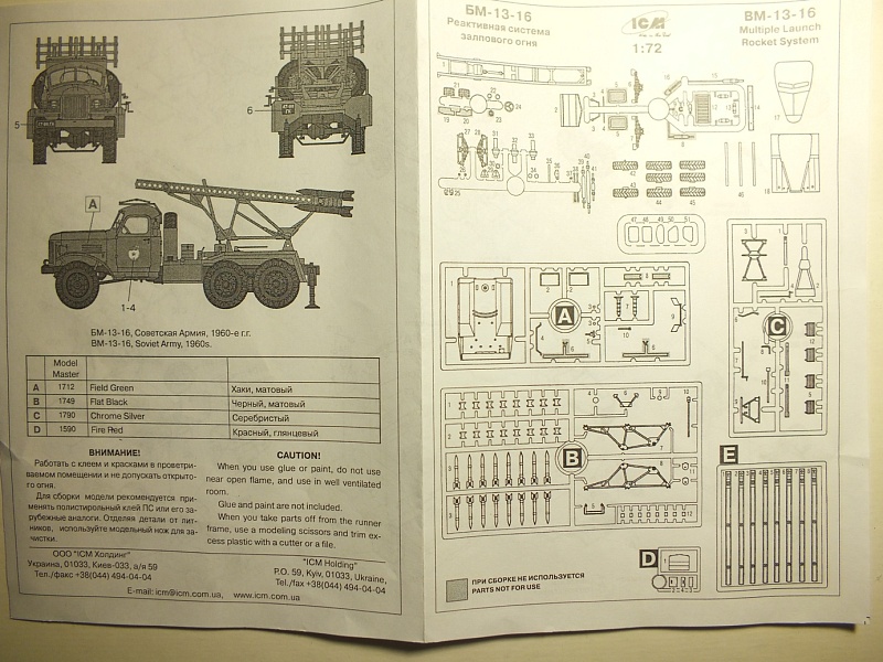 | Доброго дня коллеги! Не нашел на Каропке обзора на данный кит и решил исправить этот момент. ПЕРВЫЙ ВЗГЛЯД: Небольшая коробка с верхней загрузкой и красочным бокс-артом. Сняв верхнюю часть коробки вы увидите под ней открывающуюся вторую часть. Внутри добротно упакованы в целлофан 5 литников светло-серого цвета, три литника черного цвета, восемь колес черного цвета (в отдельном целлофане), кабина. Инструкция представляет собой бумажку формата А4 сложенную пополам. Декаль, как я понял стандартная для ICM. Пластик довольно хрупкий и ломкий. Так на литнике для сборки собственно направляющих у меня нашлось два перелома. Облой присутствует, но не критичный. Почему-то сам набор с первого взгляда создал благоприятные впечатления и желание собрать его по-быстрому не вдаваясь в матчасть, но не тут-то было, но об этом позже. Присутствуют сдвиги пресс-форм, в целом не сильные, но на ракетах, весьма заметные и неприятные. А вот качество шин порадовало, но я не спец, может так и должно быть? СБОРКА: Первое на что я обратил внимание при сборке, это неудобство инструкции. На схеме все пронумеровано, на литниках - нет...Ну ладно, решил я и приступил к сборке. Для меня, собирающего БТТ, доставило много неудобств разобраться и собрать правильно элементы карданного вала и подвески. В инструкции ни пса не видно, использовал интернет. Детали под номером 46 (оси) я думал упаковщица забыла положить. В инструкции они отдельно, по факту на черном литнике! Как новичка вогнала в ступор информация что детали А8 не используются, тем не менее на схеме сборки они применяются. То же с деталями А6. Отдельно остановлюсь на стыковке. Если элементы подвески встали нормально (для рессор есть углубления что б не промахнуться), то впервые с проблемами я столкнулся при установке запасных колес и этих деталей А8 и А6. Не при каких раскладах борта не становились вертикально! Пришлось убрать "ласточкин хвост" на А6 и сильно подточить шины. Тем не менее сборка пусковой установки прошла без проблем, что удивило. А вот со стыковкой внутрянки кабины с кабиной пришлось повозиться, но и с этим справился. И вот все покрашено в базу, осталось установить саму кабину и тут меня ждал самый неприятный сюрприз. Стыковка 0! То есть что б установить кабину без проблем надо было не ставить передние рессоры в пазы а выносить их на 2-3 мм вперед! В итоге пришлось точить запаски, заднюю стену кабины, арки задних колес...Но в итоге все худо-бедно сложилось. Декали, перевелись без проблем. РЕЗЮМЕ: Для новичка в сборке автотехники набор сложен. Приятная деталировка и невысокая цена, несомненно в плюс. Инструкция и сходимость жуть! Что получилось у меня можно увидеть ТУТ |