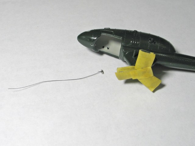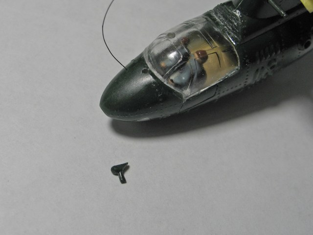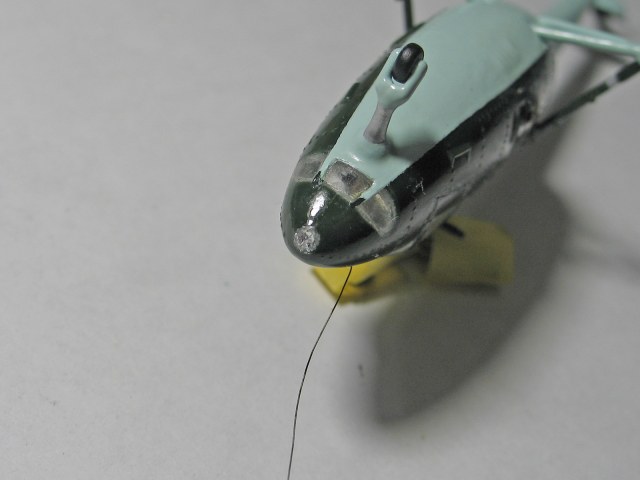 Далее, заранее закрепил тросовую антенну, пропустив через просверленное ранее отверстие. Изнутри зафиксировал кусочком литника и клеем. Штатная леска была "немасштабно" толстая, поэтому заменил её мононитью для бисера.