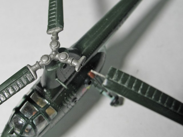 После этого настал черёд несущего винта. Лопасти в комплекте уже отлиты с провисом, так что оставалось только приклеить их на намеченные заранее места: