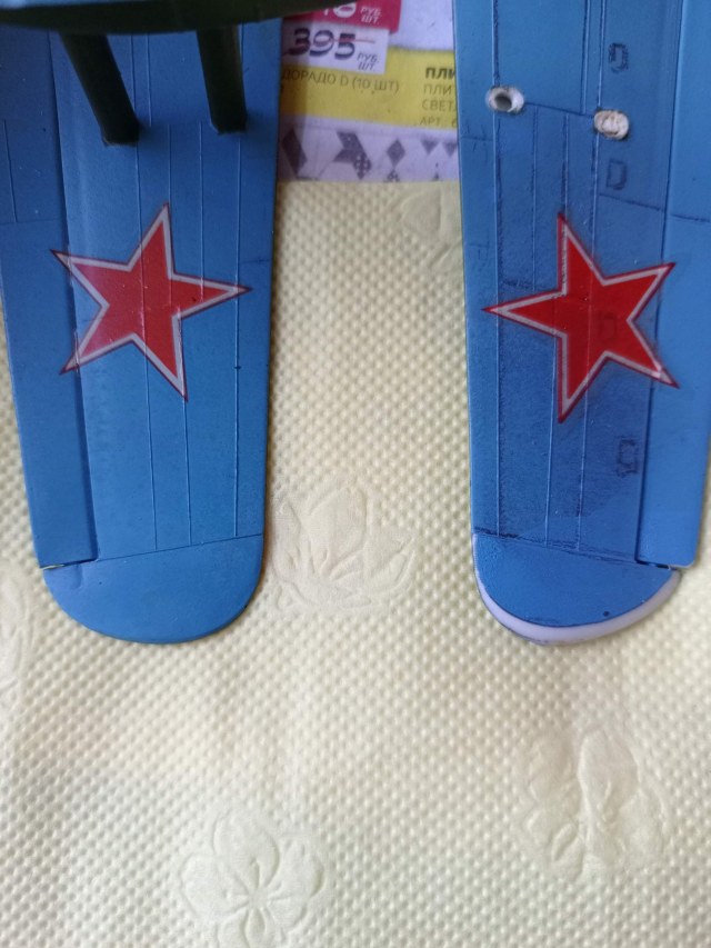 Приветствую всех ! Процесс неспешно продолжается. Смотря как у других сделано, внезапно решил отклонить закрыли на взлёт. Сначала хотел на родной подставке делать, теперь заделал отверстие - будет на прозрачных кильблоках на взлёте, может даже решусь залить эпоксидкой море. Сделал выхлоп из стержня от пасты, закончил расшивку, сделал топливосливы, бомбодержатели - может еще добавлю