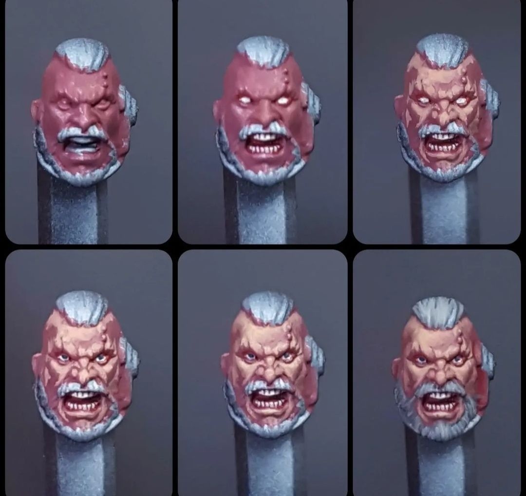 Лицо всё ещё проблема, но судя по количеству слоёв краски на нём, вы не сдаётесь. И это правильно. Попробуйте для начала только 2 банки краски, красно-коричневый и светлый телесный. Взаимным смешиванием получите на палитре 4 оттенка и этого хватит для начала. Из аэра дуем всё самым тёмным и далее кистью поэтапно высветляем постепенно уменьшая область. За плавностью переходов пока не гонитесь, это тоже придет.Тени не рисуем, их просто оставляем не закрашенными. Для прикола, можно выкрашенную полностью в один тон светло-телесную гололову пролить коричневой смывкой. Если скульпт нормальный, всё станет очевидно.