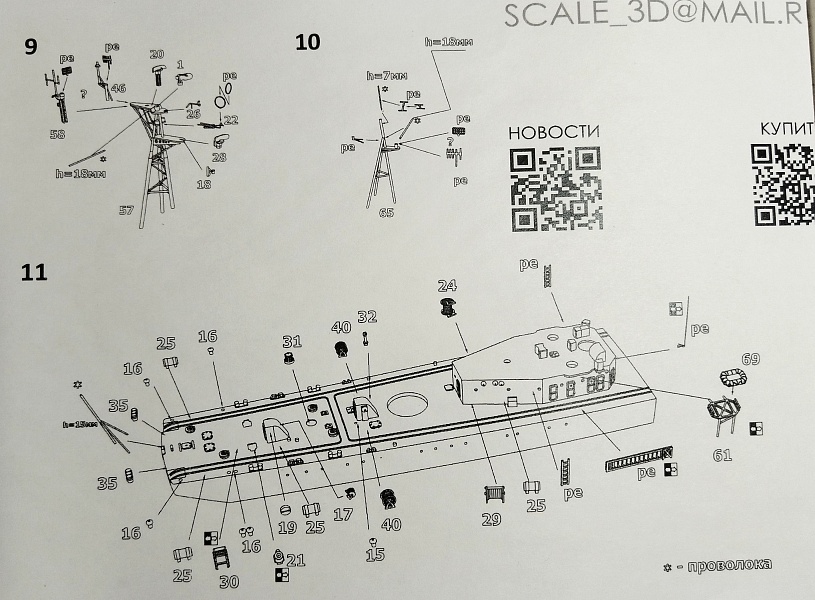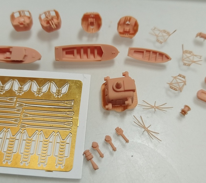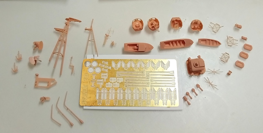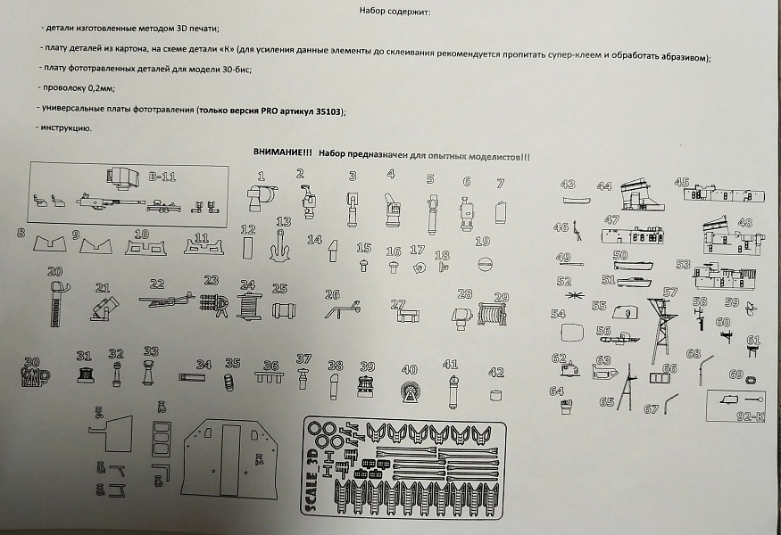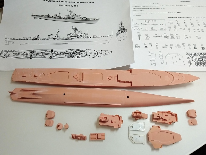 Головной ЭМ пр. 30бис "Смелый" был заложен в Ленинграде в 1948 году. В основном проект повторял довоенный пр.30, но корпус был переработан - уширен для повышения остойчивости и увеличена толщина обшивки. Конструкции проектировались под сварку и под секционную сборку. Корпус набирался только по продольной системе. Значительно поднят полубак к форштевню. Гребные валы сделали как на лидерах пр. 1 - в "штанах". Из вооружения поменялись по сравнению с довоенными торпедные аппараты - теперь они стали пятитрубными. Изначальные 37-мм автоматы 70-К уже при эксплуатации заменяли на В-11. Замысел был по-Сталински скромным - построить 188 эсминцев. Осилили всего 70, но и из них одновременно в строю было примерно 20 - остальные сохранялись в консервации... Модель от Scale 3D являет собой образец добросовестного подхода к разработке и печати. Множество деталей отпечатаны ювелирно, умно размещены на поддержках. "Ступеньки" немного есть только на полубаке, но вообще конечно каждую деталь надо аккуратно шкурить. В комплекте приложена фирменная плата травления, в наборе "профи" он дороже - есть типовые платы от Микродизайна. Проблему я обнаружил только одну - стволы главного калибра надо менять на точёные. ( А ещё - надо тщательно выбирать прототип - двух одинаковых 30бис не найти))). Вывод - очень хорошая модель и своих денег она стоит.