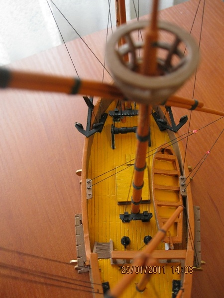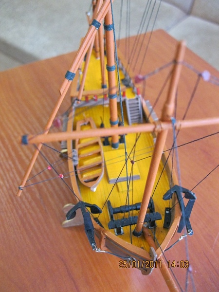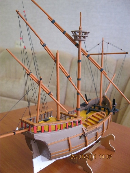 Модель склеена из бумаги, за исключением мачт и рей, по материалам польского журнала "Моделяр" 70 какого то года. Для придания жесткости модели между шпангоутами вклеен пенопласт. Модель окрашена кистью, такелаж собран не полностью (нет лестницы на мачту) срезал перед съемкой, т.к. не понравились на первых фото, буду переделывать.