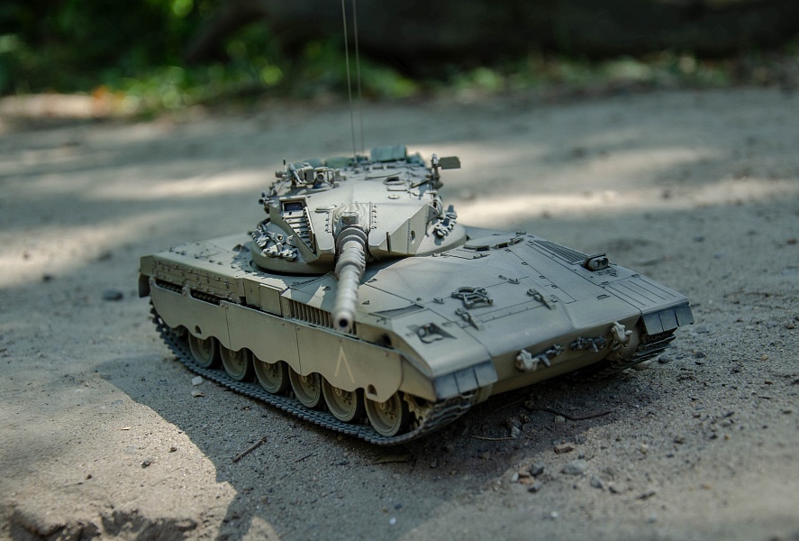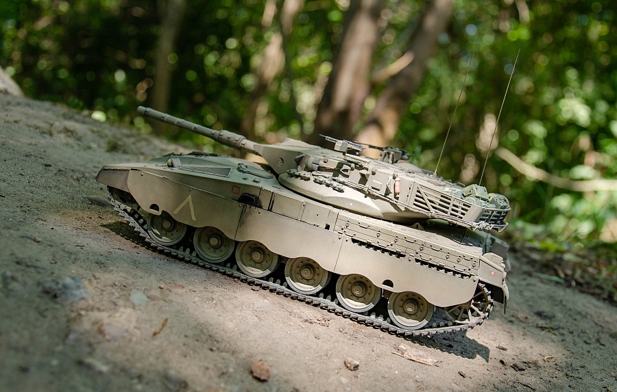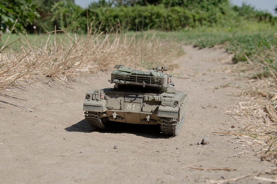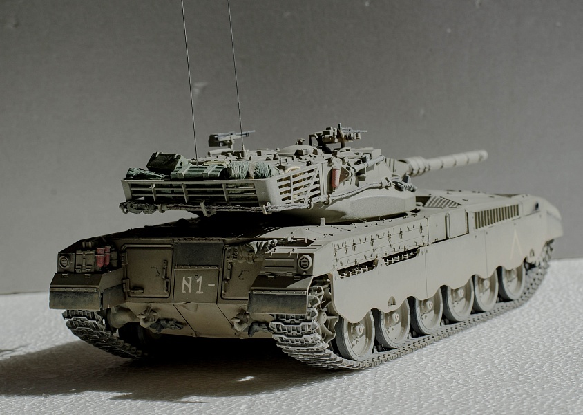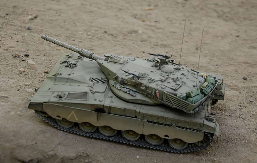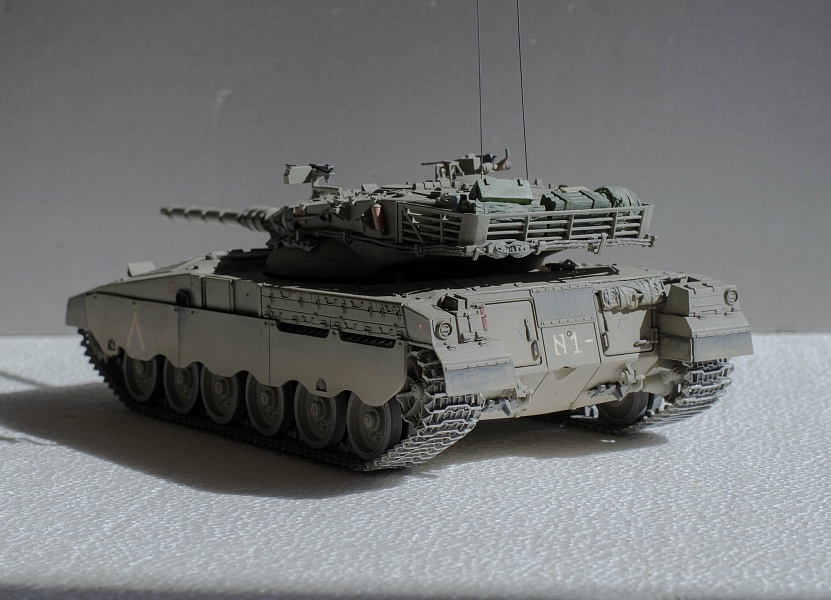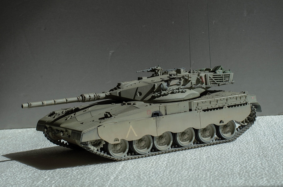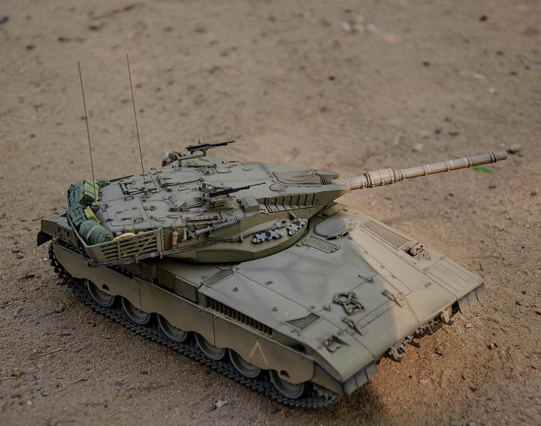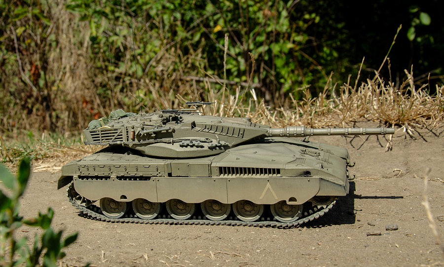 Всем привет. Решил выставить свою относительно новую модель... частично восстановил и собрал ее в прошлом году, а вот отфоткать получилось только этим жарким летом. История "жизни" этого набора очень насыщенная и интересная. Прошлый владелец купил данный кит очень давно, чутка подсобрал корпус с ходовкой и башней, и все покрасил с помощью фломастеров (сам корпус был выкрашен в желтый, все "резиновые" элементы в черный) и забросил... Данный набор, я купил за 500 рублей, на одном известном сайте (не буду рекламировать каком), в печальном состоянии. Помимо того что окраска фломастерами, так еще и хранение на балконе. Было много пыли на/в коробке, цвет литников и самой модели почти бетонный (кстати, пыль очень хорошо въелась в пластик, пальцем снималась лишь чуть-чуть. Я еще тогда подумал что это такой оттенок краски, и что какой молодец бывший владелец, покрасил Меркаву в почти правильный цвет, в любом случае, я планировал купать модель в Кроте), сама коробка выцвела, но благо все детали и декали на месте... Купил не раздумывая, по причине, того что мне очень нравятся Меркавы, а тут такое предложение, от которого было сложно отказаться. Планировал открыть для себя сказку о постройке, но лень пересилила, и занимался Меркавой в свободное время. Первым делом, все литники, корпус, башня и гусеницы отправились купаться в мыльный раствор с щеткой, именно тогда увидел покраску фломастерами. После просушки, я везде прошелся жидкостью для снятия лака с ногтей... и начал исправлять косяки. Сначала аккуратно оторвал верхнюю часть корпуса от нижней (благо они были очень плохо склеены), чтобы было проще застеклить триплексы с помощью DVD диска. Заклеил, зашпаклевал и вышкурил все дырки на днище корпуса (модель древняя, рассчитана под моторчик с батарейками). После всех манипуляций, занялся матчастью, а именно: прорезал брызговики спереди и сзади (сзади один закосячил, щель больше необходимой); из литников выточил выхлопные трубы, и вклеил их в корпус; на ведущих звездочках прорезал отверстия (Тамия давала их монолитными); приклеил всю мелочовку. Рукоятки на кормовых люках и башне - проволока. С башней все в разы сложнее... там все было в клею, разделить верх и низ без последствий не представлялось возможным, поэтому, с помощью пинцета, я застеклил прицел и триплекс, используя DVD диск. Прицел, конечно можно было бы закрыть шторкой, приклеив с обратной стороны маленький кусочек диска, но так не интересно... плюс из проволоки сделал направляющую для шторки прицела. После с помощью звездовского клея и грубой кисточки, я сымитировал фактуру литой брони на скулах башни; рассверлил гранатомет; на командирский люк, из проволоки установил ручки; заменил буксировочные тросы (уложил их не правильно, знаю), делал их из тонко жильной проволоки, которую скрутил с помощью дрели, коуши родные, стопоры на коушах - толстая медная проволока; антенны - гитарная струна; также добавил в забашенную корзину всякой всячины... скатки (сам делал из туалетной бумаги), один ящичек (делал из литников), нитка для имитаций веревки, остальное барахлишко, все что нашел в модельных запасах. Грунтовка от фирмы Kudo, белого цвета. Красил Тамией. Чтобы получить подобие цвета Sinai Grey, краски бодяжил на глаз, точные пропорции не скажу. Основной оттенок XF-66, в него добавлял XF-62, после капля XF-04, капелька XF-26, и закрепил ре