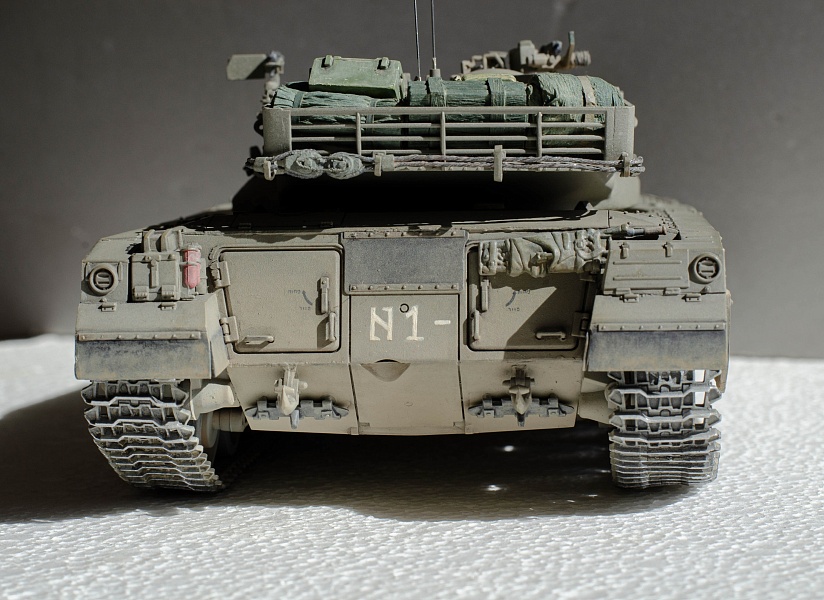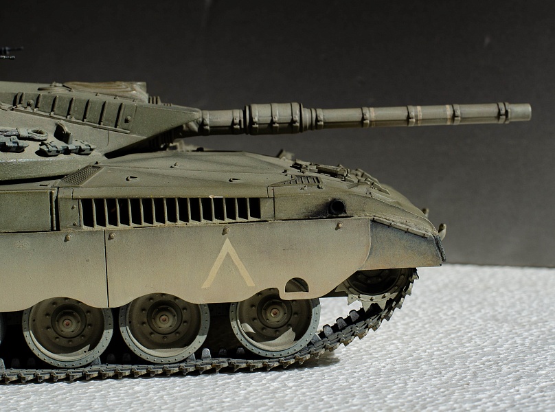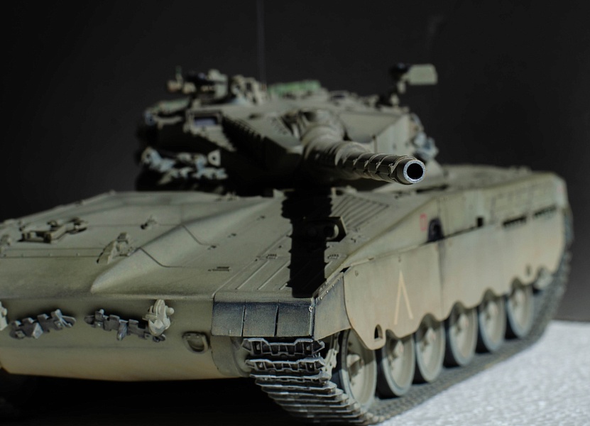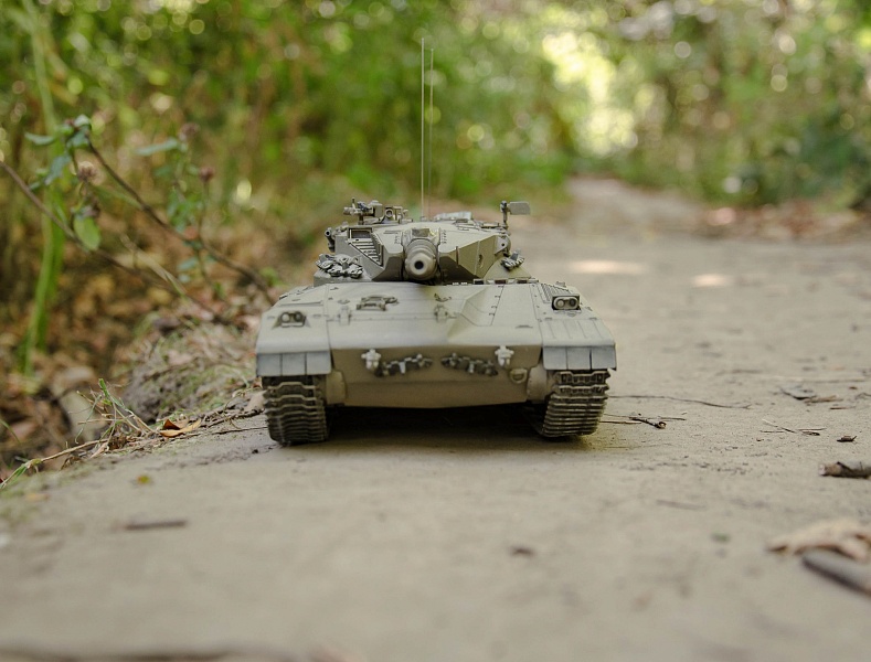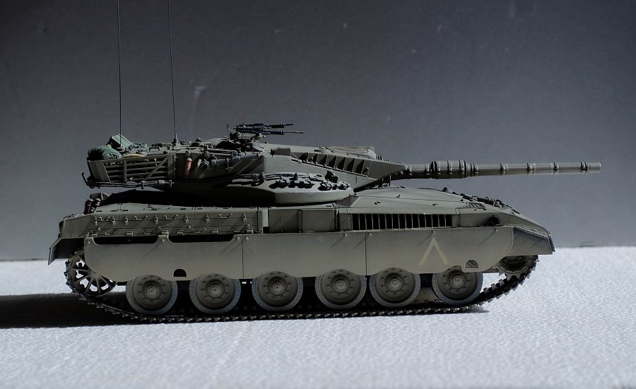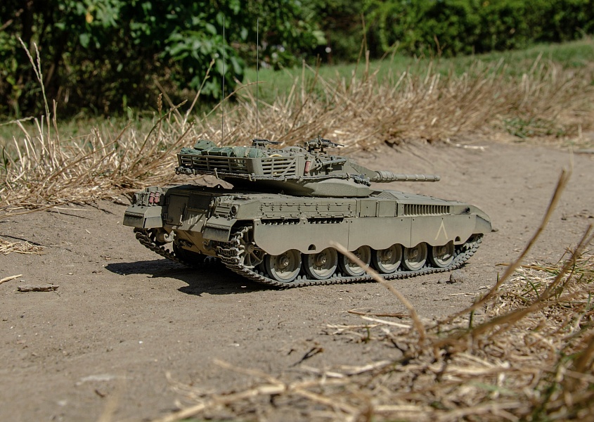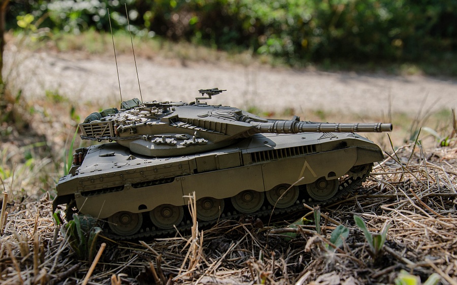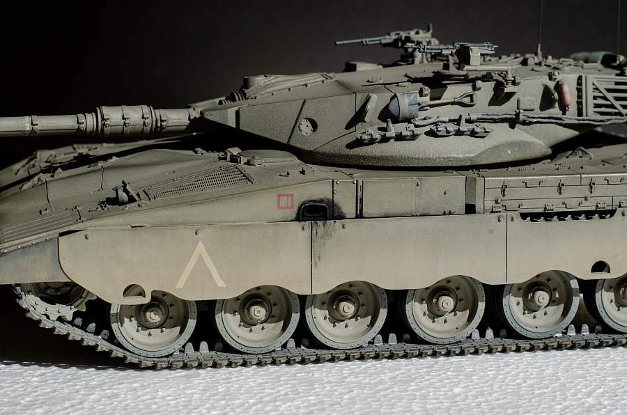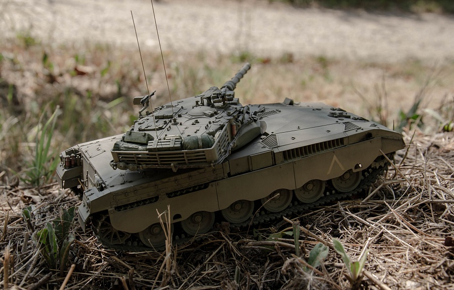 Всем привет. Решил выставить свою относительно новую модель... частично восстановил и собрал ее в прошлом году, а вот отфоткать получилось только этим жарким летом. История "жизни" этого набора очень насыщенная и интересная. Прошлый владелец купил данный кит очень давно, чутка подсобрал корпус с ходовкой и башней, и все покрасил с помощью фломастеров (сам корпус был выкрашен в желтый, все "резиновые" элементы в черный) и забросил... Данный набор, я купил за 500 рублей, на одном известном сайте (не буду рекламировать каком), в печальном состоянии. Помимо того что окраска фломастерами, так еще и хранение на балконе. Было много пыли на/в коробке, цвет литников и самой модели почти бетонный (кстати, пыль очень хорошо въелась в пластик, пальцем снималась лишь чуть-чуть. Я еще тогда подумал что это такой оттенок краски, и что какой молодец бывший владелец, покрасил Меркаву в почти правильный цвет, в любом случае, я планировал купать модель в Кроте), сама коробка выцвела, но благо все детали и декали на месте... Купил не раздумывая, по причине, того что мне очень нравятся Меркавы, а тут такое предложение, от которого было сложно отказаться. Планировал открыть для себя сказку о постройке, но лень пересилила, и занимался Меркавой в свободное время. Первым делом, все литники, корпус, башня и гусеницы отправились купаться в мыльный раствор с щеткой, именно тогда увидел покраску фломастерами. После просушки, я везде прошелся жидкостью для снятия лака с ногтей... и начал исправлять косяки. Сначала аккуратно оторвал верхнюю часть корпуса от нижней (благо они были очень плохо склеены), чтобы было проще застеклить триплексы с помощью DVD диска. Заклеил, зашпаклевал и вышкурил все дырки на днище корпуса (модель древняя, рассчитана под моторчик с батарейками). После всех манипуляций, занялся матчастью, а именно: прорезал брызговики спереди и сзади (сзади один закосячил, щель больше необходимой); из литников выточил выхлопные трубы, и вклеил их в корпус; на ведущих звездочках прорезал отверстия (Тамия давала их монолитными); приклеил всю мелочовку. Рукоятки на кормовых люках и башне - проволока. С башней все в разы сложнее... там все было в клею, разделить верх и низ без последствий не представлялось возможным, поэтому, с помощью пинцета, я застеклил прицел и триплекс, используя DVD диск. Прицел, конечно можно было бы закрыть шторкой, приклеив с обратной стороны маленький кусочек диска, но так не интересно... плюс из проволоки сделал направляющую для шторки прицела. После с помощью звездовского клея и грубой кисточки, я сымитировал фактуру литой брони на скулах башни; рассверлил гранатомет; на командирский люк, из проволоки установил ручки; заменил буксировочные тросы (уложил их не правильно, знаю), делал их из тонко жильной проволоки, которую скрутил с помощью дрели, коуши родные, стопоры на коушах - толстая медная проволока; антенны - гитарная струна; также добавил в забашенную корзину всякой всячины... скатки (сам делал из туалетной бумаги), один ящичек (делал из литников), нитка для имитаций веревки, остальное барахлишко, все что нашел в модельных запасах. Грунтовка от фирмы Kudo, белого цвета. Красил Тамией. Чтобы получить подобие цвета Sinai Grey, краски бодяжил на глаз, точные пропорции не скажу. Основной оттенок XF-66, в него добавлял XF-62, после капля XF-04, капелька XF-26, и закрепил ре