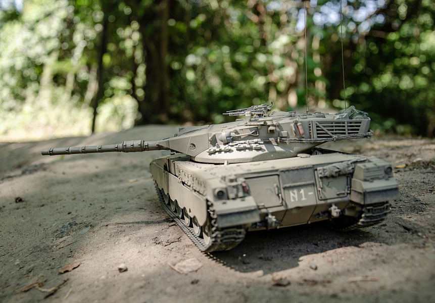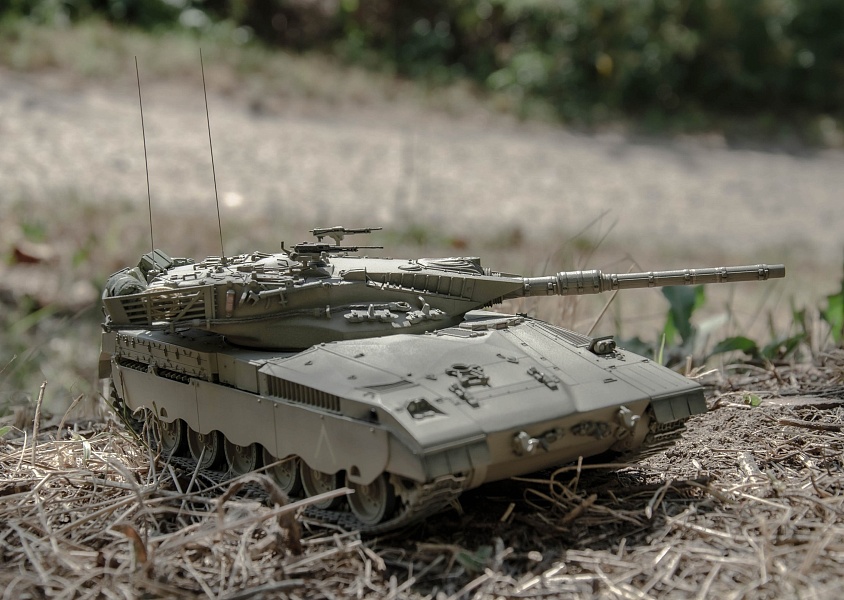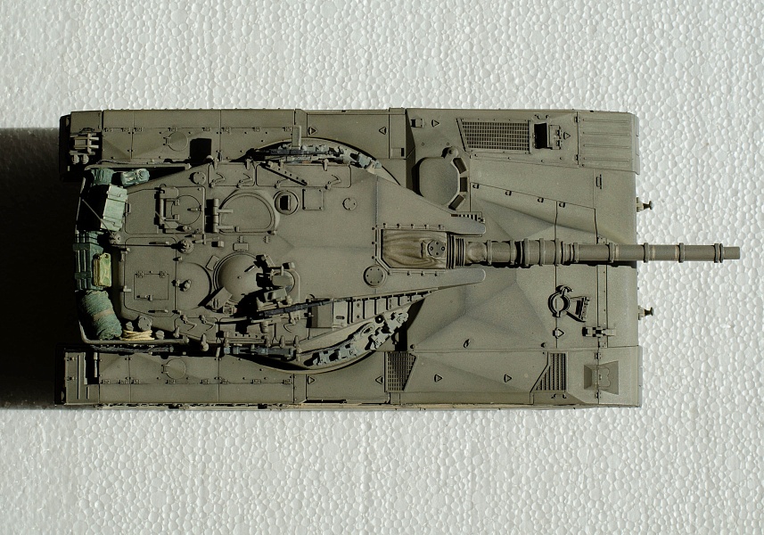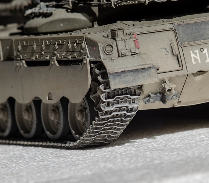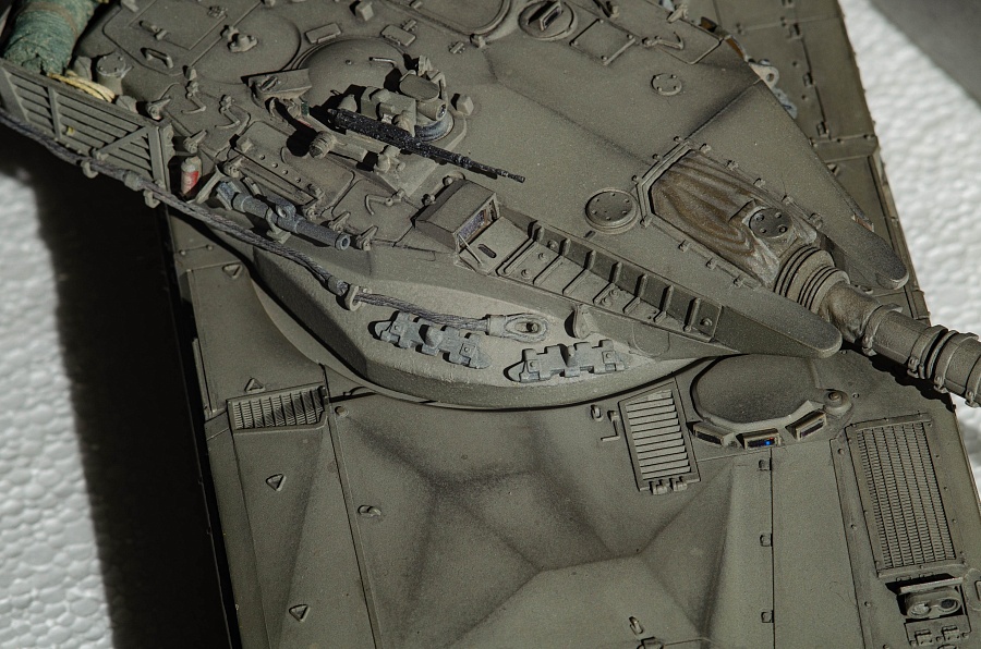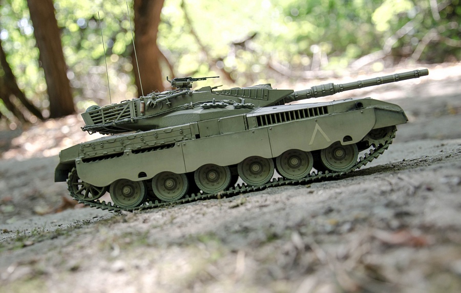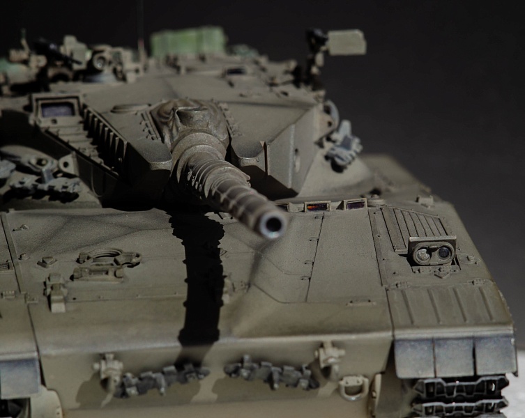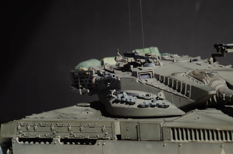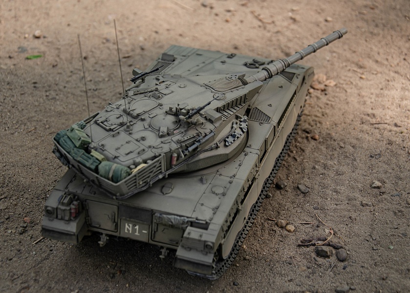 Всем привет. Решил выставить свою относительно новую модель... частично восстановил и собрал ее в прошлом году, а вот отфоткать получилось только этим жарким летом. История "жизни" этого набора очень насыщенная и интересная. Прошлый владелец купил данный кит очень давно, чутка подсобрал корпус с ходовкой и башней, и все покрасил с помощью фломастеров (сам корпус был выкрашен в желтый, все "резиновые" элементы в черный) и забросил... Данный набор, я купил за 500 рублей, на одном известном сайте (не буду рекламировать каком), в печальном состоянии. Помимо того что окраска фломастерами, так еще и хранение на балконе. Было много пыли на/в коробке, цвет литников и самой модели почти бетонный (кстати, пыль очень хорошо въелась в пластик, пальцем снималась лишь чуть-чуть. Я еще тогда подумал что это такой оттенок краски, и что какой молодец бывший владелец, покрасил Меркаву в почти правильный цвет, в любом случае, я планировал купать модель в Кроте), сама коробка выцвела, но благо все детали и декали на месте... Купил не раздумывая, по причине, того что мне очень нравятся Меркавы, а тут такое предложение, от которого было сложно отказаться. Планировал открыть для себя сказку о постройке, но лень пересилила, и занимался Меркавой в свободное время. Первым делом, все литники, корпус, башня и гусеницы отправились купаться в мыльный раствор с щеткой, именно тогда увидел покраску фломастерами. После просушки, я везде прошелся жидкостью для снятия лака с ногтей... и начал исправлять косяки. Сначала аккуратно оторвал верхнюю часть корпуса от нижней (благо они были очень плохо склеены), чтобы было проще застеклить триплексы с помощью DVD диска. Заклеил, зашпаклевал и вышкурил все дырки на днище корпуса (модель древняя, рассчитана под моторчик с батарейками). После всех манипуляций, занялся матчастью, а именно: прорезал брызговики спереди и сзади (сзади один закосячил, щель больше необходимой); из литников выточил выхлопные трубы, и вклеил их в корпус; на ведущих звездочках прорезал отверстия (Тамия давала их монолитными); приклеил всю мелочовку. Рукоятки на кормовых люках и башне - проволока. С башней все в разы сложнее... там все было в клею, разделить верх и низ без последствий не представлялось возможным, поэтому, с помощью пинцета, я застеклил прицел и триплекс, используя DVD диск. Прицел, конечно можно было бы закрыть шторкой, приклеив с обратной стороны маленький кусочек диска, но так не интересно... плюс из проволоки сделал направляющую для шторки прицела. После с помощью звездовского клея и грубой кисточки, я сымитировал фактуру литой брони на скулах башни; рассверлил гранатомет; на командирский люк, из проволоки установил ручки; заменил буксировочные тросы (уложил их не правильно, знаю), делал их из тонко жильной проволоки, которую скрутил с помощью дрели, коуши родные, стопоры на коушах - толстая медная проволока; антенны - гитарная струна; также добавил в забашенную корзину всякой всячины... скатки (сам делал из туалетной бумаги), один ящичек (делал из литников), нитка для имитаций веревки, остальное барахлишко, все что нашел в модельных запасах. Грунтовка от фирмы Kudo, белого цвета. Красил Тамией. Чтобы получить подобие цвета Sinai Grey, краски бодяжил на глаз, точные пропорции не скажу. Основной оттенок XF-66, в него добавлял XF-62, после капля XF-04, капелька XF-26, и закрепил ре