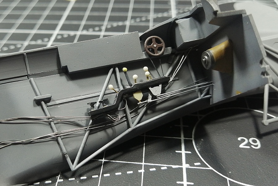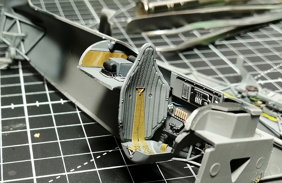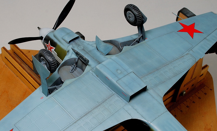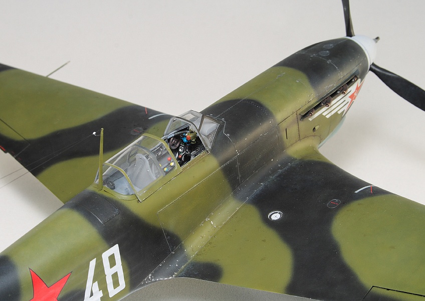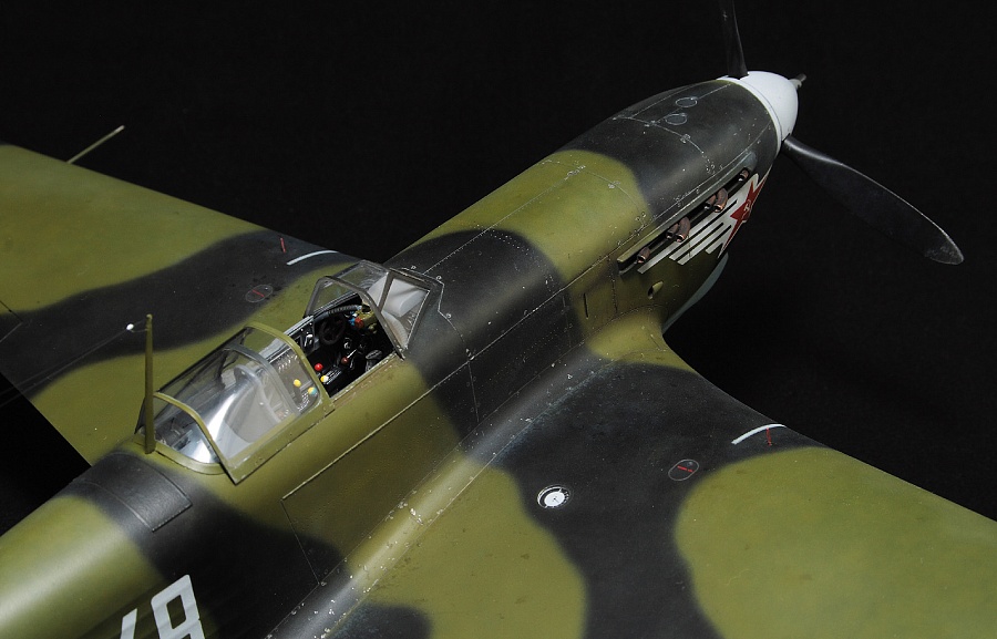 Здравствуйте коллеги! Еще один мой Як-9Т в 32 масштабе, который должен быть первым, но пришел к финишу вторым. Главное, что пришёл! ) Опишу основные моменты сборки. В наличии было немного доп. наборов. Большое спасибо Александру Трофимову за набор накладных панелей QP32014. Благодаря Алексею Андрианову ака "andrijan" получил некоторые дополнительные и нужные детальки отпечатанные по 3D технологии. За что ему тоже огромное спасибо! За прототип взят Як-9 Т Машенкина А.М. Читая воспоминания Алексея Михайловича показалось что история знакома. И совершенно случайно пересмотрел фильм 1961г. «Чистое небо» реж. Г. Чухрай. Где роль главного героя сыграл актёр Евгений Урбанский. Кинолента снималась во времена так называемой «хрущевской деСталинизации». Совершенно очевидно, имеет ярко выраженный уклон в сторону идеологии того времени. Мне неизвестно кто послужил прототипом главного героя фильма. Но многие факты судьбы А.М. Машенкина и героя фильма, которого так же звали Алексей, схожи. Возможно я ошибаюсь и это лишь моё личное восприятие фильма. Сборку начал с кабины пилота. Основная часть доработок пришлась именно на кабину. На доступных фотографиях прототипа стало очевидно, что в кабине нет бронестекла за креслом пилота, а установлена бронеспинка раннего типа как на Як-7. Отсутствует броня на лобовом остеклении. Для деталировки кабины использован набор декалей от Квинта. В кабине добавил тяги управления и проводку. Пластиковые ручки заменил на сплющенные из проволоки, а шарики для ручек "скатал" из ПВА. Верхнюю панель - декаль "квинта", перекрасил в цвет остальной кабины. И цвет кабины по декалям подбирать не стал. Так же замаскировал шкалы приборов и закрыл все матовым лаком. Это помогло убрать небольшой блеск и растр на декалях. Заднюю полку подогнал к печатной спинке, немного углубив изгиб. Развернул передатчик лицевой панелью к хвосту. Сделал имитацию брезентовой шторки на задней стенке полки. Рус поставил отпечатанный. Посадочное место для ракетницы пришлось передвинуть, ближе к чашке сиденья. Что бы она рукояткой не упиралась в самодельные рычаги под боковой панелькой. Пол в кабине опустил немного ниже. Так как чашка сиденья опустилась чуть ниже из-за замены бронеспинки. Показал воздушную заслонку на лобовом стекле. В задней нише добавил имитацию силового набора. Амортизатор задней стойки заменил на трубочку. На крыле убрал толщину кромки ниш основных стоек и створок. Переделал топливомеры. Вырезал сквозные отверстие и вставил круги из прозрачного пластика. Потом снизу подклеил шкалы приборов. Внутрь крыла «накидал» пластика и подогнал, что бы верхние половинки лежали плотно. Т.к. пластик мягкий, а внутреннее пространство крыла пустое. Если этого не сделать крыло будет «дышать», могут трескаться клеевые швы. Поставил распорки из литников в пустоты крыла и фюзеляжа. Теперь получилась уверенная конструкция, нигде ничего не болтается и не гуляет. Накатал клёп на стабилизаторах. Наклеил накладные панели Квинта. Впоследствии оставил накладки только на тормозных щитках снизу и лючок за кабиной. Остальное удалил. Но прежде чем удалить панели, использовал их в качестве шаблонов для переноса линий клёпки. Установил крыльевые АНО. На боковые панели фюзеляжа приклеил проволоку для имитации рояльной петли и накатал клёп. Расточил храповик и подобра