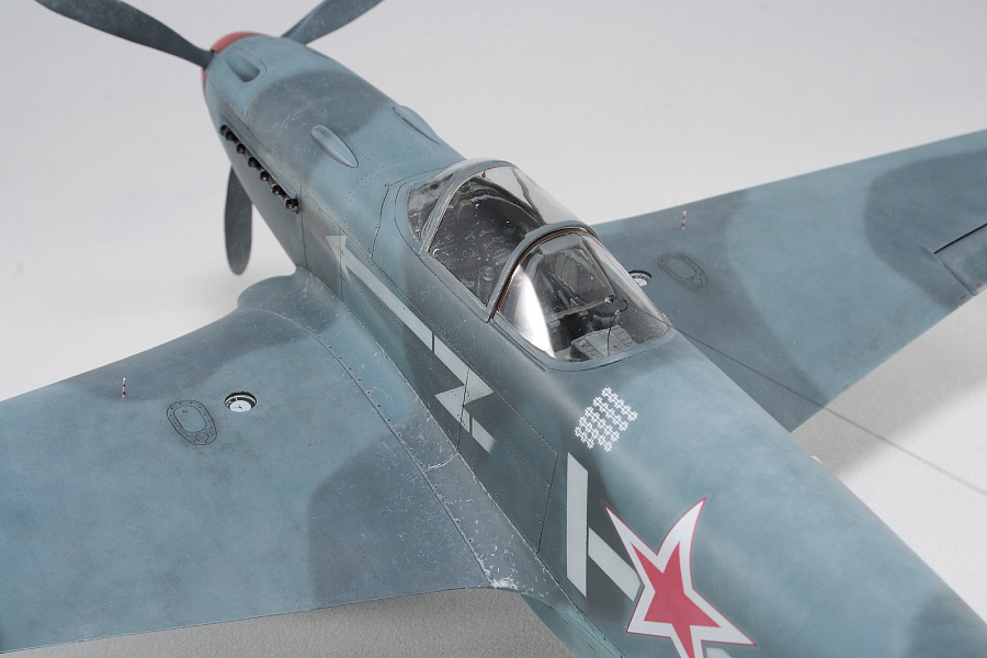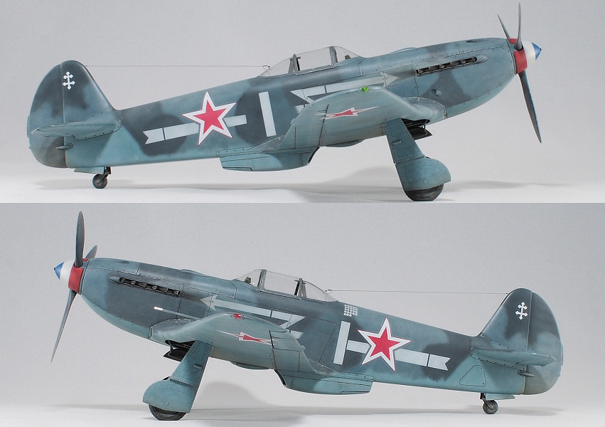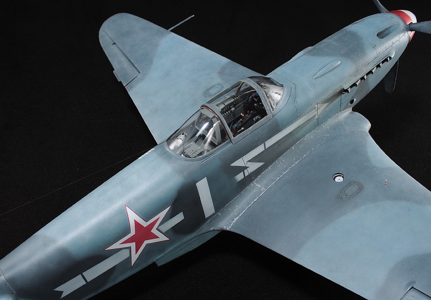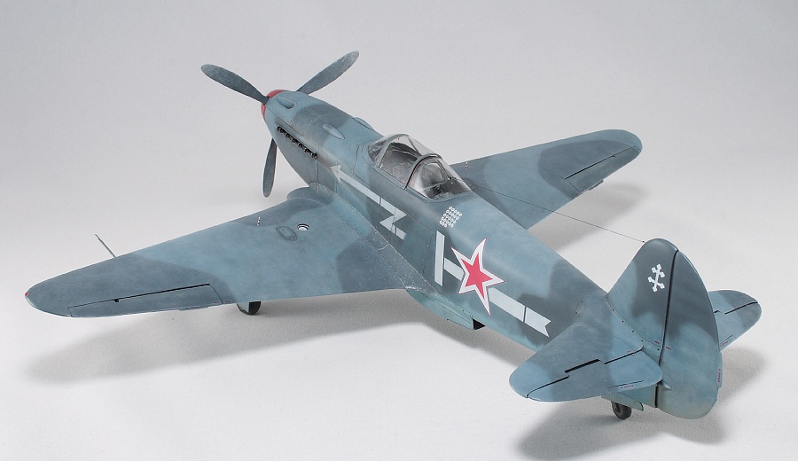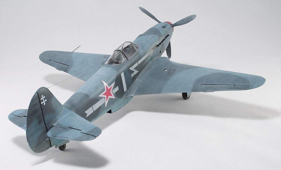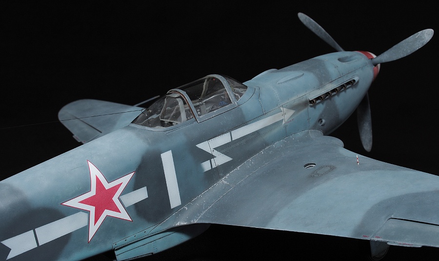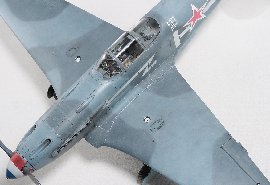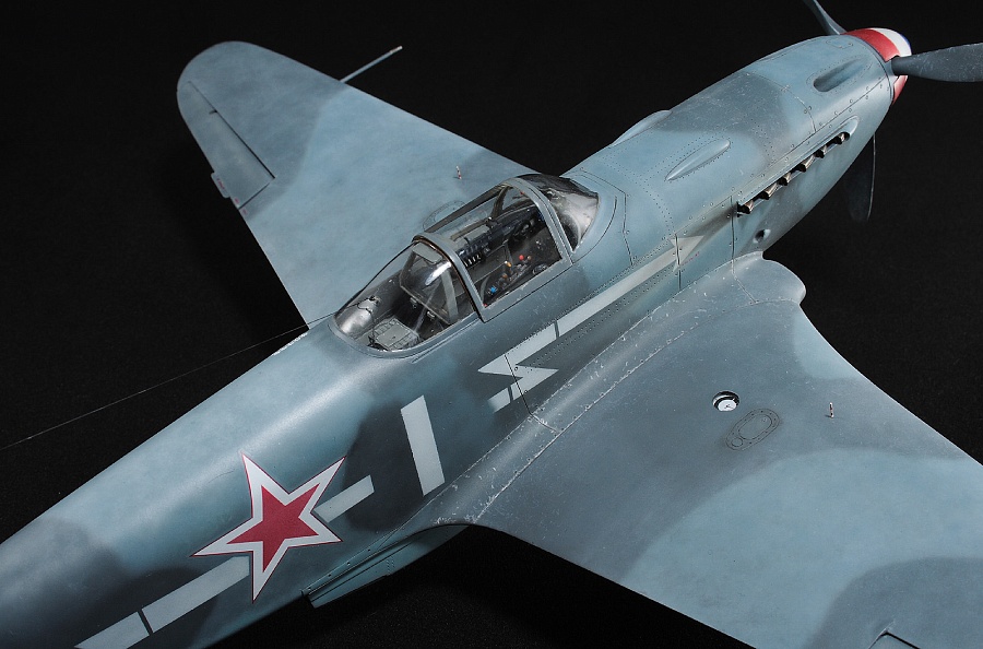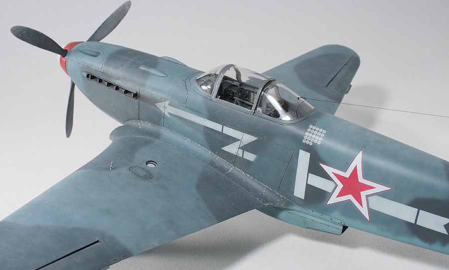 Здравствуйте, коллеги! Это не первая сборка модели Як-3 от SH. Модель попала ко мне на сборку не совсем комплектной. Некоторые пластиковые детали отсутствовали. Вместо них были в наличии детали из смолы. Была собрана смоляная кабина. Всё это пребывало не в лучшем состоянии. Поэтому сборку начал с разборки. Разобрал смоляную кабину, силовой набор кабины заменил пластиковым, оставшимся от предыдущих сборок. Поменял заднюю полку на пластик и установил смоляную радиостанцию РСИ-4 от СМК, добавил проводку. Смоляное кресло пришлось оставить. Т.к. привязные ремни отлиты в смоле, кромку чашки сиденья обтачивать не стал, заменить ее было нечем. После сборки и окраски кабины она была оклеена интерьерным набором Квинта. С приборной смоляной доски спилил кислородный прибор и наклеил его на приборную доску «Квинта». Стекло для прицела вырезал из тонкого прозрачного пластика. Далее была сборка крыла. Не самая простая установка ниш в пространство крыла. Все надо подгонять, натягивать с усилием иначе верхние и нижняя детали не сомкнутся. Установил топливомеры. Сточил заднюю кромку. Внутрь крыла «накидал» обрезки литников и подогнал, что бы верхние половинки лежали плотно. После склейки половинок крыла и просушки клеевого шва, придал форму воздухозаборникам, которые практически не читались. Прошпаклевал вз с внутренней стороны и вклеил перегородки. На крыле были отрезаны элероны. Подготовил посадочные места и установил на штифтах смоляные рулёвки. Цветным прозрачным пластиком сделал АНО. В ниши добавил проводку. Перед тем как склеить половинки фюзеляжа, поправил форму кромки обтекателя патрубков, сделав её из прямого угла, округлой. Наглухо с внутренней стороны заклеил места установки патрубков. Сами патрубки отделил от основания и расточил. Установил их уже после сборки и окраски. В местах для переноса хвостовой части сделал имитацию заклеек. Стыковка, практически, любого узла в этой модели требовала усилий. Шпаклевка применялась повсеместно. В своей ранней статье по сборке аналогичной модели я уже писал про проблемы сборки. В этот раз ничего не изменилось. Повторяться не буду. В верхней крышке капота рассверлил отверстия для имитации огневых труб и вклеил трубочки подходящего диаметра. Из фольги сделал обтекатели тяги на руль направления. Кок отпечатан по 3D технологии. Очередное спасибо Алексею Андрианову! Осталось только его слегка расточить и для имитации храповика вклеить латунные трубочки. Лопасти - смола. С установкой фонаря всё непросто. Садится на своё место он плохо. Если в прошлый раз использовал деталь остекления одной деталью. Сейчас поставил наборный фонарь. На фото видно, где пришлось снять толщину. На сдвижной части с внутренней стороны скальпелем сошкрябал толщину переплета. После отполировал и искупал в футуре. На внутренней стороне сдвижной части из проволоки сделал ручки и повесил тросик (вроде для сброса сдвижной части). Из двухкомпонентной шпаклёвки, сделал имитацию уплотнителя на задней части фонаря. Сделал и поставил зеркало заднего обзора. Но потом заметил на фото прототипа, что нет там зеркала. Пришлось оторвать. Сделал имитацию шлангов гидравлики на основные стойки шасси. Колёса - смола СМК. На задней стойке вырезал двухзвенник. Задний дутик – колесо из набора. Доработал проволокой механизм уборки створки н