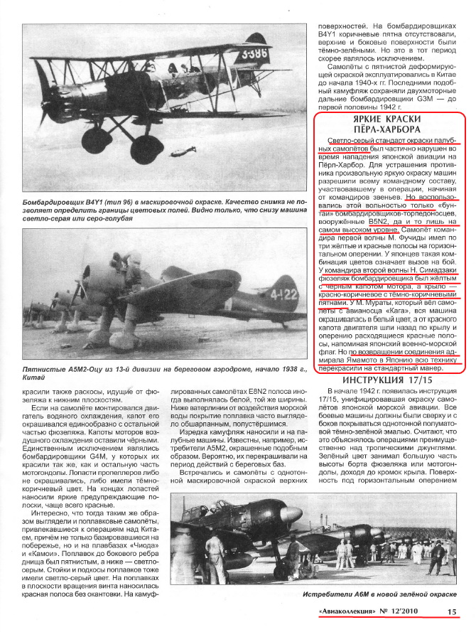 alten Ratten, полностью согласеннасчет модели, но интересно, что в статье, есть описание самолетов с Акаги, и Кага. А вот окраса самолетов с Сорю и Хирю, не говоря о Секаку и Дзуйкаку даже не упоминается. В запасах еще Aichi D3A в варианте раскраски от Хаси, надо будет пошукать литературу.