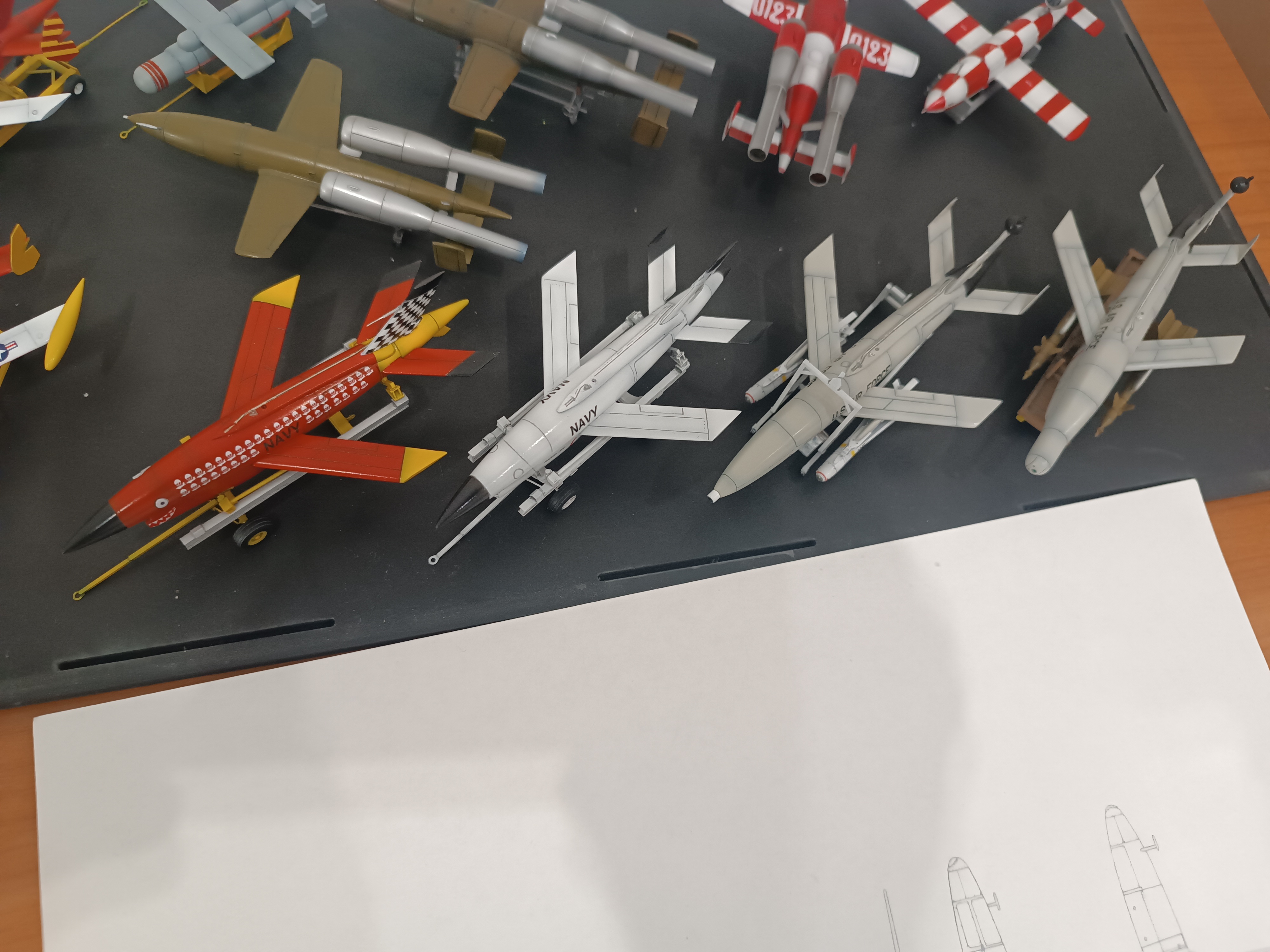 | Всем привет! Дополнил свою коллекцию БПЛА еще парой Firebee, ударными вариантами BGM-34B(Model 234A) и BGM34B Pathfinder. В качестве исходника использовал два наборов Plus model. На обоих БПЛА удлинил корпуса, вставками и доработал носовые части, двухкомпонентной шпатлевкой, для Pathfinderа использовал шариковую ручку. Удлинил крылья, сделал пилоны для подвесного вооружения, из доширака вырезал шайбы для стабилизаторов, большего размера. Вооружение использовал GBU-12, из АМКшного набора KFIR C2/C7 и AGM-65 Maverick от Eduard. Сделал ПВД, из тонкой проволоки и тянутой ватой палочки, сопла двигателей, из трубок, добавил фольги и нарезал крой. С нуля сделал телегу, для BGM-34B(с акуьей пастью),из пластикового прутка 1мм, квадратного сечения. Декали использовал родные, герб взял из ревелловского Скайрейдера, глаза и пасть надувал, зубы и контуры пасти обводил карандашом. Красил все Ганзой, лак футура, смывка и в конце полуматовый лак...стройка обоих Файрби здесь:https://karopka.ru/forum/forum189/topic32802/ | |
