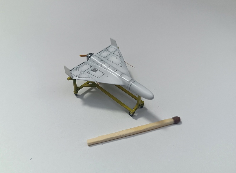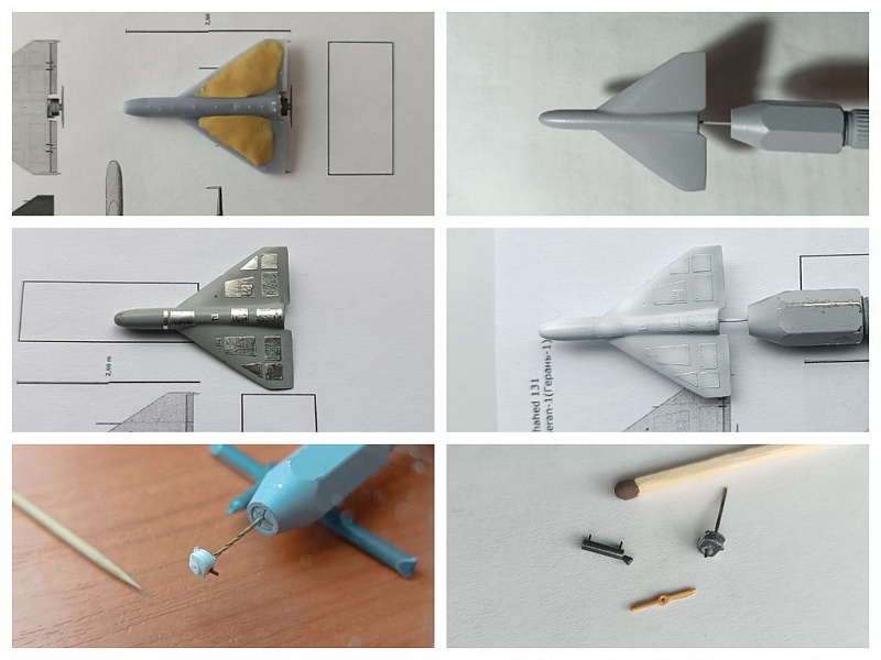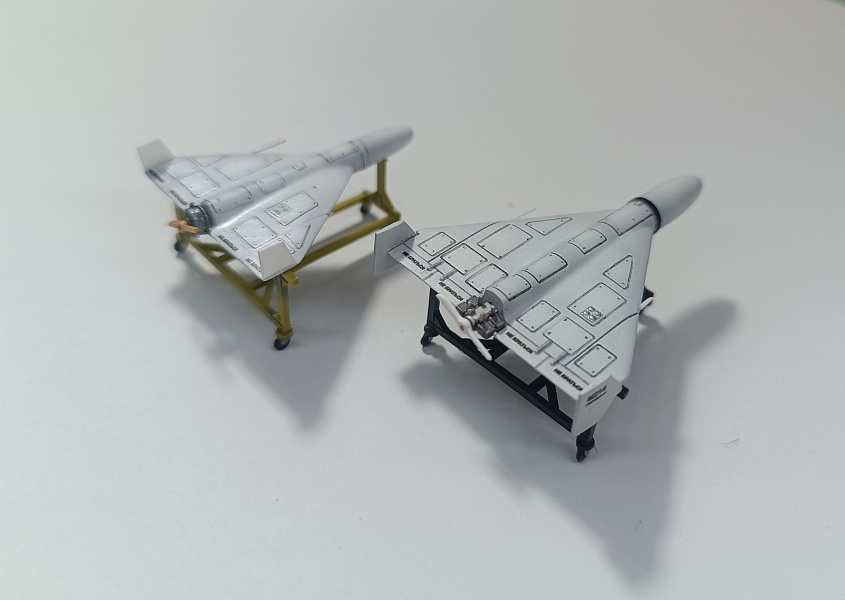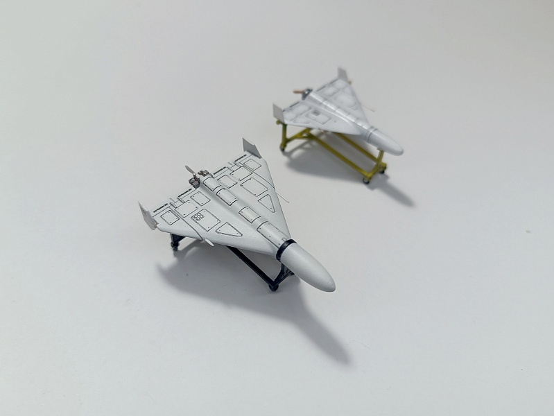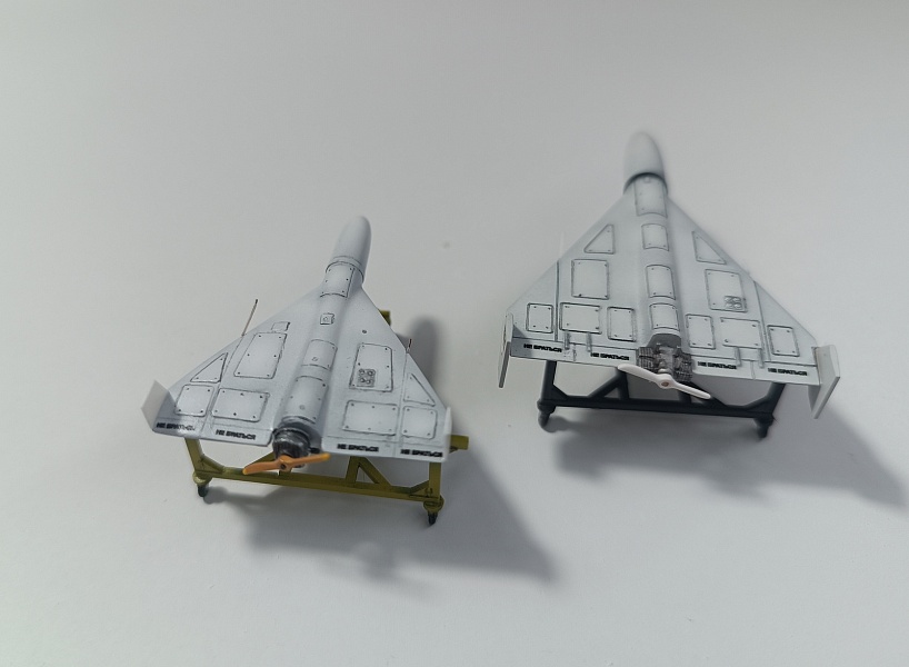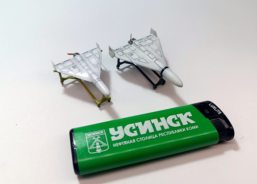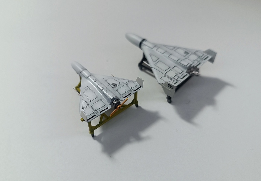 Приветствую уважаемые коллеги! Представляю вашему вниманию пару ударных БПЛА-камикадзе, Герань-1 и Герань-2(HESA Shahid-131, Shahid-136)...https://pikabu.ru/story/tekhnicheskiy_analiz_shahed_136_i_131_geran_2_i_1_9594020?ysclid=mg56ys9qhz845266461 Герань-2 от Planet Models, корпус модели отлит из смолы, небольшая рамка из пластика, с деталями для телеги и 3Д печатная мелочевка. Собрал в прошлом году без доработок, только добавил клепку, на лючках. А вот с Геренью-1 пришлось повозится... исходник, 3д печатная модель Геран-2 от DYV-Models, ужасного качества. Брал на Озоне, чисто из любопытства, хотелось сравнить с чешской Гранью от Planet Models . По длине заметно короче чешской модели, на крыльях были утяжины!?, кромки в районе рулей высоты были поведенные, крой практически отсутствовал. Решил выпилить из этого набора Герань-1(Shahid-131), она меньше по размеру, немного укоротил корпус и уменьшил размах крыльев. Двухкомпонентной тамией зашпатлевал утяжины, лючки имитировал фольгой, двигатель и пороховой ускоритель делал с нуля, воздушный винт брал из чешского набора(там их два:)), ПВД из тянутой ватной палочки и тонкой проволоки. Телегу взял(для фото) из еще одного набора Герани-2 от Plaet Models, покрашенной в желтый цвет(вторую Герань-2 планирую красить в черный)), от туда же брал декали. Красил как обычно Ганзой, футура, смывка и полуматовый лак:)
