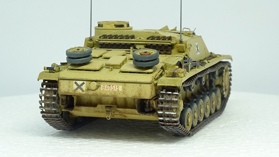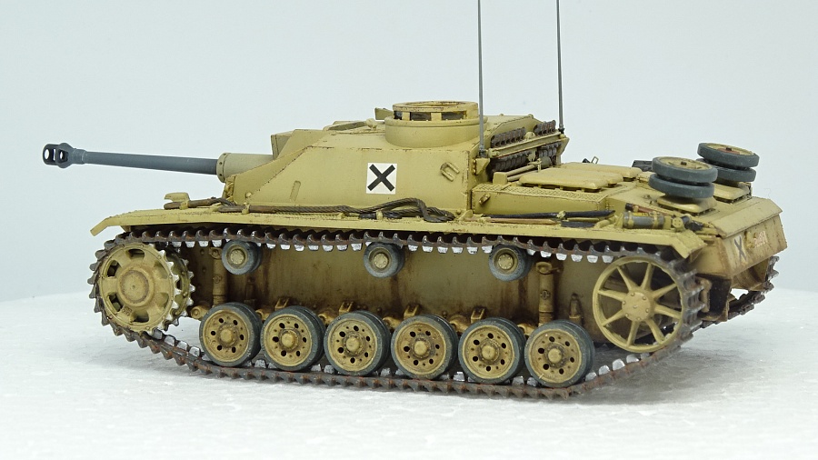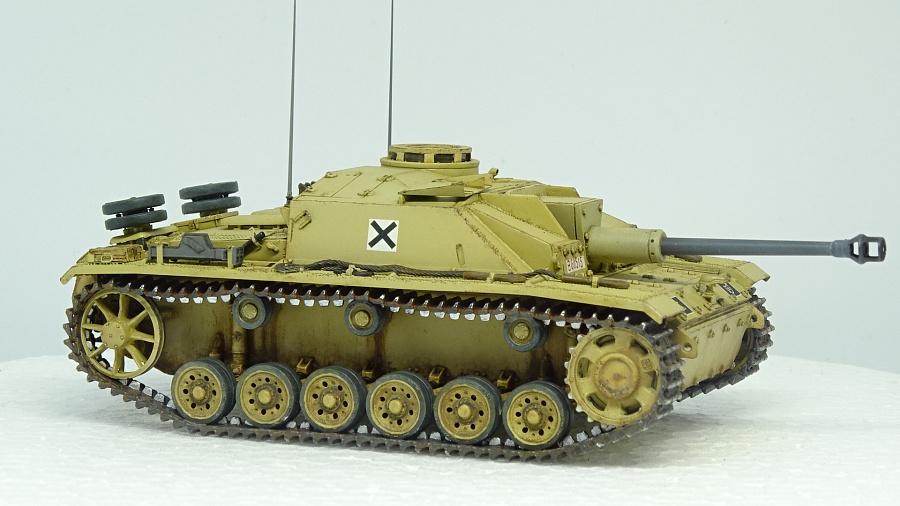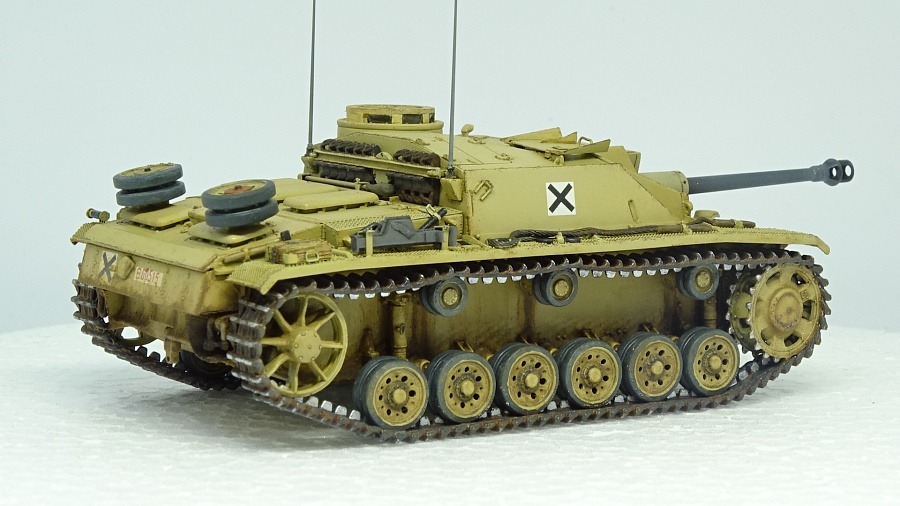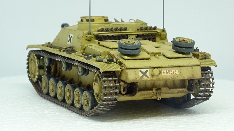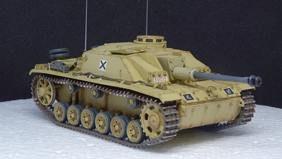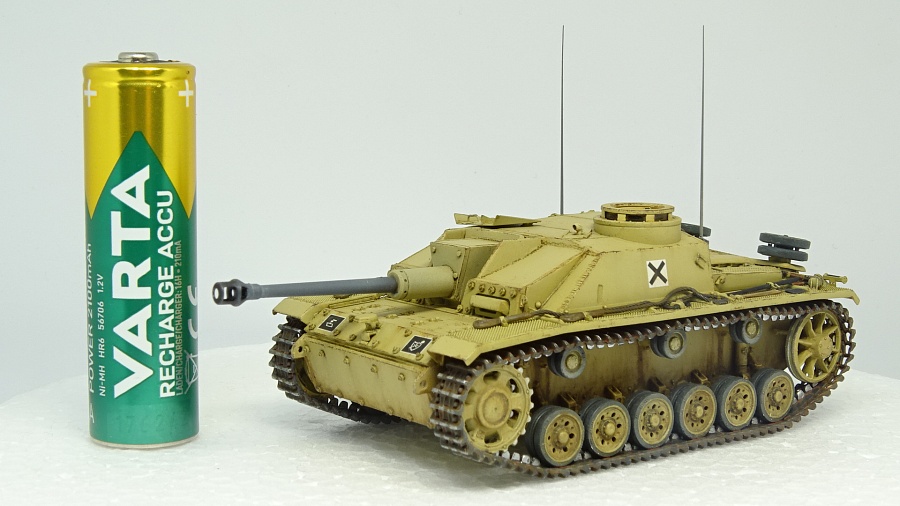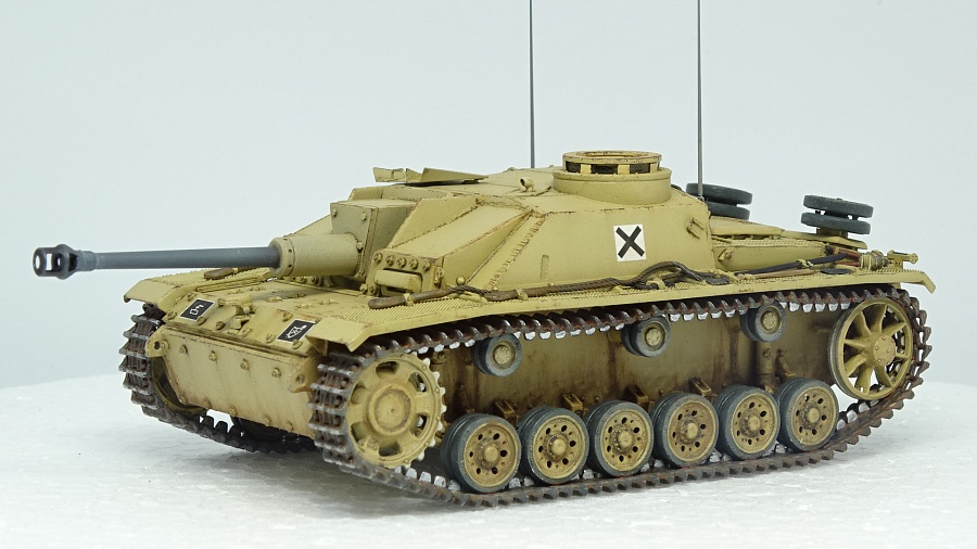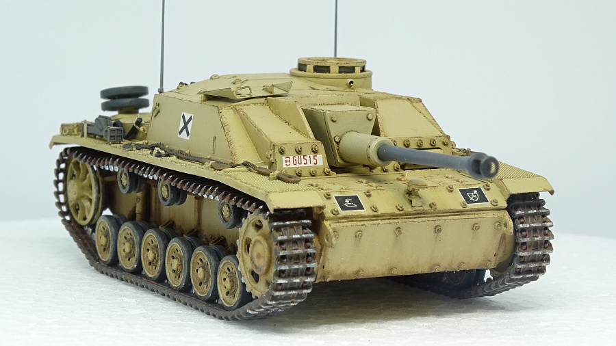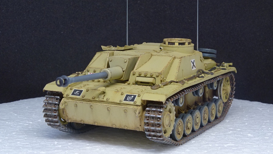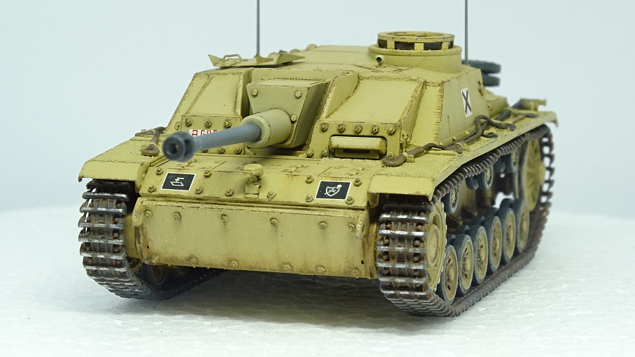 | Болгарская StuG. III Ausf. G первого батальона противотанковых самоходных орудий под номером В 60515 производства 43го года. Вероятно одна из 55 полученных Болгарами самоходок. Первые же две StuG. III G были получены ранее в 42м году. Видимо первые машины не подвергались каким либо модификациям как это делали например в Финлянции с теми же StuG. III Ausf. G (щиток пулемета для MG 42, а не MG 34, бревна по бортам, дополнительные бронеплиты по бортам, лобовое бронирование бетоном, замена пулемета на ДТ 29, собственный оригинальный камуфляж). Не наносился даже камуфляж. Все машины оставались в базовом желтом (dunkelgelb RAL 7028). Хотя можно найти фотографии тех же машин 1го батальона обвешанными траками и с установленными экранами. Более никаких модификаций мне обнаружить не удалось. Соответствующая модель от Mini Art в 72м масштабе наверное одна из лучших доступных моделей именно этой машины. Однако многое все равно требовало доработки и замены: антенны, изоляторы антенн, щиток пулемета, дульный тормоз, домкрат и пр. мелочи.Загрунтована собранная модель белым грунтом от АК. Окрашена в базовый цвет RAL 7028 (ранний вариант) от АММО MIG. В дальнейшем азимутальная схема выполнена с использованием более светлого (позднего) варианта того же 7028 от MIG. Окраска инструмента, ствола и гусениц выполнена акрилом от Vallejo, AK 3D generation и MIG. Окрашенная модель покрыта прозрачным лаком от Tamiya. После установки декалей покрыта тем же лаком от Tamiya и также слоем матового лака. Далее использован светло-коричневый фильтр от АК и коричневая смывка A.MIG-1000. В конечном итоге запыление нижней части корпуса сделано с помощью Buff от Tamiya и загрязнение - plaster base/AK080. |