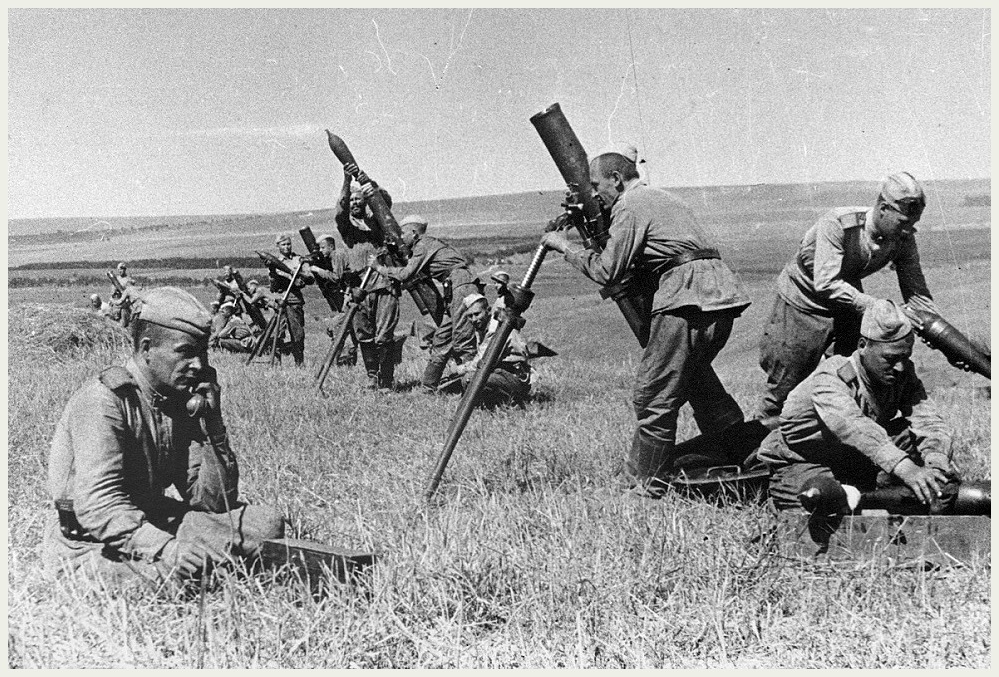 Батарея 120-мм полковых миномётов обр. 1938 г. (ПМ-38) 1-го дивизиона 290-го минометного полка ведет огонь по противнику во время Курской битвы.