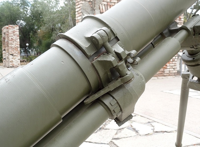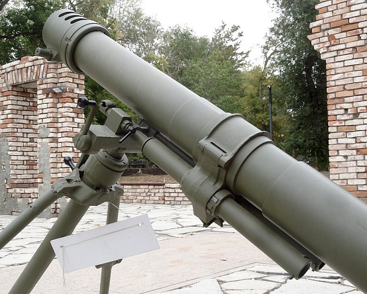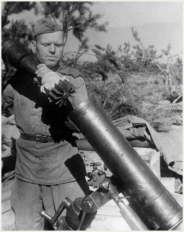 Советский миномётчик заряжает 120-мм полковой миномет обр. 1938 г. На снимке огонь ведется осколочно-фугасной чугунной миной ОФ-843А.