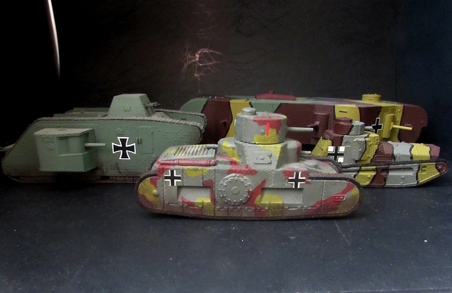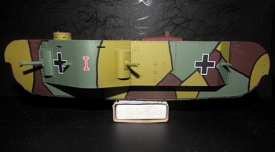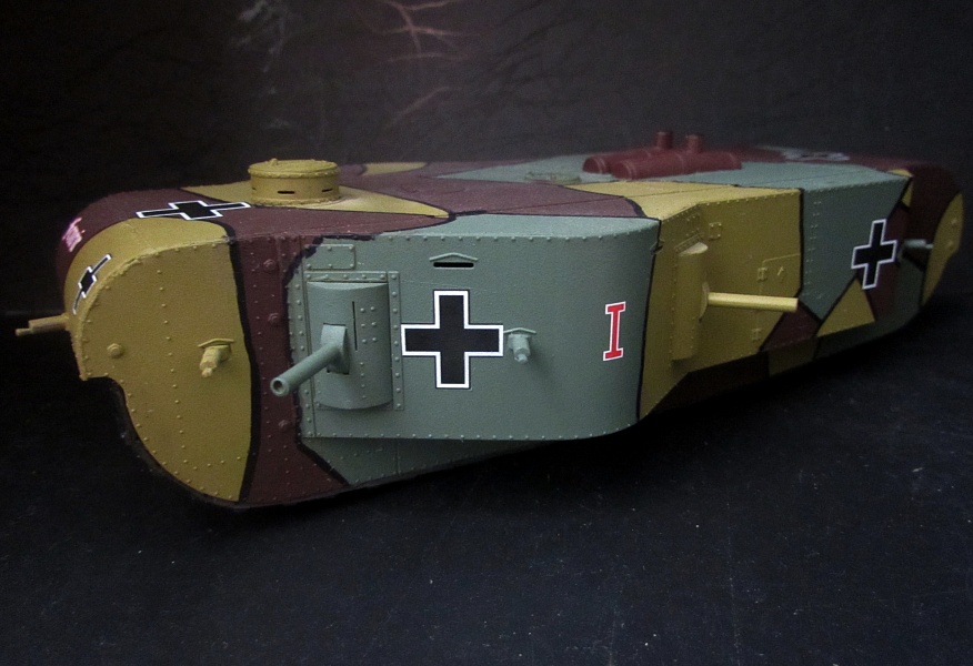 Доброго всем дня. Обзор на эту модель выкладывал два года назад. Если вкратце, то модель неплохая, на четверочку - но не для слабых духом и не для неопытных, с рядом весьма подлых моментов, способная доставить немало проблем даже опытному моделисту. Собственно, благодаря паре подлянок модели и паре собственных рукопопых моментов эта модель в любом случае для раздела "Песочница". Собиралась модель не особо долго, активная фаза сборки заняла около двух недель. По ходу сборки был обнаружен недолив боковины корпуса, который попытался заделать вставкой из листового пластика, но не проклепал (уж больно мелкая клёпка, даже и не думал пытаться восстановить, не мой уровень, увы). При склейке верха и и низа из-за невнимательности залил клеем клепку на НЛД, пришлось ее снести и налепить на готовую модель "Адамову голову" для оттягивания внимания. Грунтовка - баллон Primer Grey от Bosny. Очень хороший акрил, рекомендую, но перед использованием баллончик нужно нагреть на батарее и ли на улице на солнце, иначе есть риск шагрени. При окрашивании ориентировался на модель коллеги Антона Торопова, схема камуфляжа практически та же. Поскольку это был мой первый опыт рисовки камуфляжа преимущественно аэрографом с применением маскленты, посчитал этот вариант относительно простым. В принципе, ничего особо сложного, дольше и муторнее было нарезать маскленту. Активная фаза покраски заняла 2-4 дня, и то день добавился из-за головотяпства, пары перекрешенных участков из-за неплотно приложенной маски (отсюда и пара разводов на коричневом, если присмотреться) и ненароком поставленного отпечатка пальца, который пришлось замывать, замазывать и маскировать. Камуфляжные цвета - строго Тамия: 1. Базовый грязно-жёлтый намешан из желтого и, кажется, Olive Green из серии XF. 2. Коричневый - Flat Brown из серии XF. 3. Field Grau - одноименный баллончик серии TS, днище покрашено сцеженной краской из аэрографа, как и желтый с коричневым, пятна просто надуты баллончиком. Траки - Black Metal от Jim Scale, затем суперметаллик Dark Iron от Mr. Colour, затем снова Black Metal от Jim Scale (несмотря на название, неожиданно светлый и яркий оттенок, прошелся им по гребням траков). Канты - черный спиртовой маркер Centropen. Лак - баллончиковый матовый от Mr. Colour. Никакого "обгадинга" принципиально не делал, хотелось сделать практически "нулевый, с иголочки" танк, только покинувший завод. Если соберусь с духом и куплю еще один, только уже печатный, то попробую его подзагадить. Поскольку будь эта машина достроена, выехала бы с завода не ранее конца 1918 года, то не стал использовать опознавательные знаки от родной декали (они где-то до осени 1918 года), пришлось обратиться к Григорию Сушкову из "Народной Декали" ,за что ему огромное спасибо, декаль идеальная, чуть бликанул только передний крест на крыше, и то, возможно, из-за моего промедления. Из родного оставил имя и цифру машины, декали, кстати, отличные. Фото постарался чередовать со вспышкой и обычные. Как и говорил в обзоре, модель, может, не идеальная - но собранная и покрашенная, станет украшением любой коллекции по Первой Мировой войне.