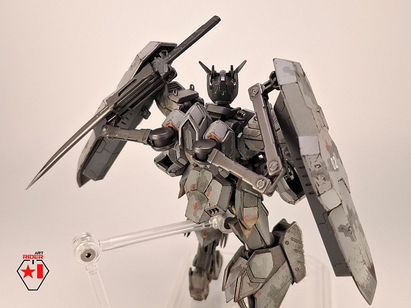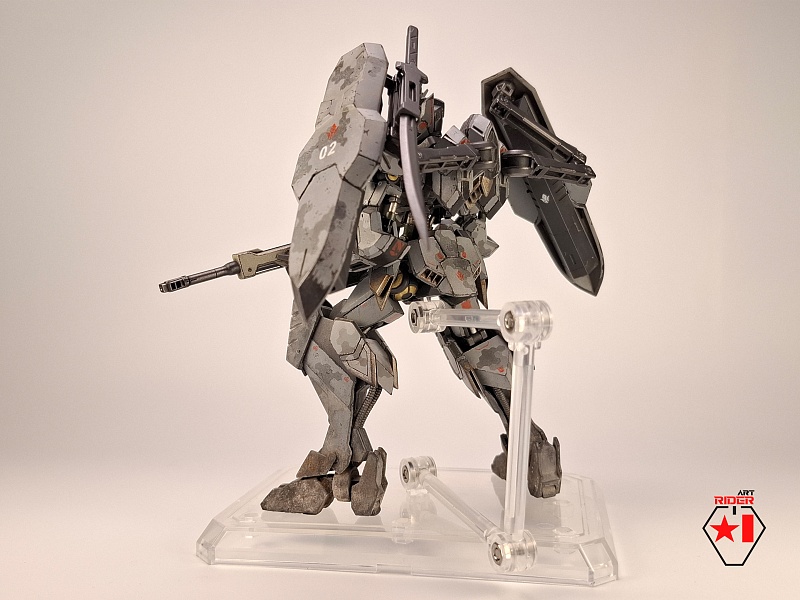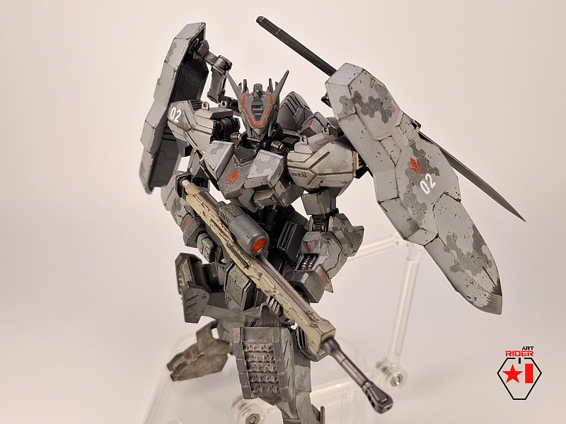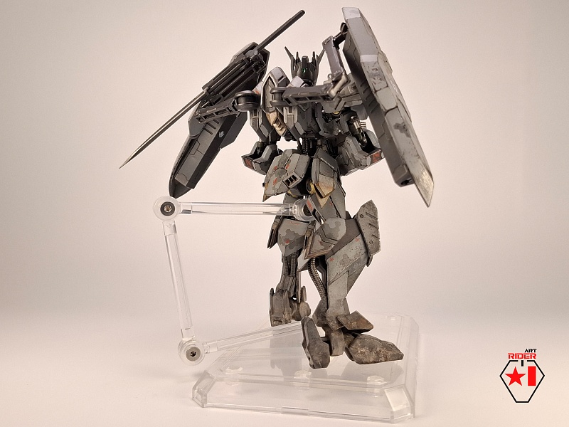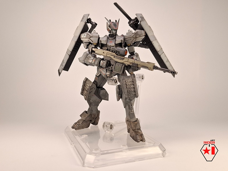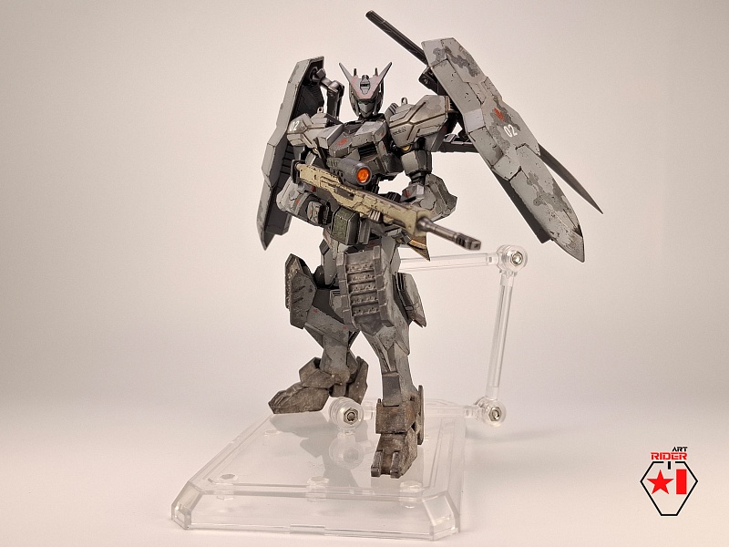 *Для постройки модели на запчасти были расканибалины три Бандаевких набора – ASW-G-08 Gundam Barbatos, ASW-G-66 Gundam Kimaris Vidar, ASW-G-ХХ Gundam Vidar. Заново были сделаны: броня голени и коленей, нагрудная броня, боковые реактивные двигатели на поясе. Частично переделаны, либо доработаны: элементы брони на голове, реактивный ранец, щиты и их манипуляторы, наплечники, броня плеч и предплечий, задний и передние элементы защитной юбки, ступни. Также переделки и доработке подверглось оружие ближнего и дальнего боя. В работе использован листовой пластик различной толщины, проволока медная / стальная. Высота готово модели примерно 12 сантиметров.
