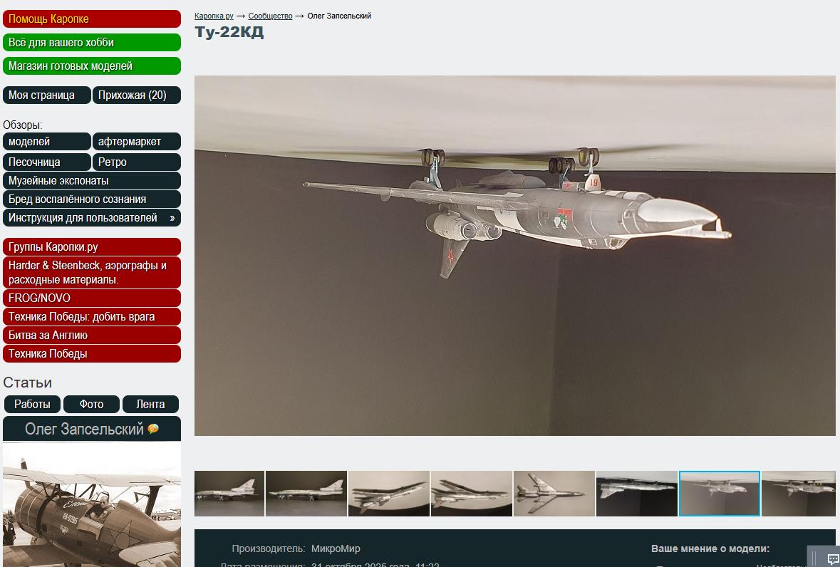 Приветствую коллег по цеху! Долго собирался построить модель Ту-22КД от MikroMir в 144 масштабе и вот –премьера. В частях у этого самолёта было прозвище «Людоед», наверное, оправдано. Из 311 построенных машин 70 потеряно в авариях и катастрофах, почти каждый 4й борт. Задумывалась модель как изкаробка, без укладывания в чертежи, общая форма и пропорции меня устроили. Когда я взял пластик в руки, первоначально он мне понравился – тонкие кромки, расшивка, куча мелких изящных деталей, но потом… Я бы назвал и модель этим прозвищем – Настоящий Людоед для моделиста. Щели при подгонке с миллиметр, со всех прямых плоскостей как бы снята фаска, литьё смещёное, детали без маркировки и их приходится опознавать по схеме, которая не совсем соответствует литникам. Есть недоливы, утяжины, поломанные детали, стыкуемость…. Да нету этой самой стыкуемости! Для работы понадобятся напильник и шпатлёвка в неограниченных количествах, «быстрой засыпайки» не получится, а нужна кропотливая работа по доводке, шлифовке, подгонке и еще раз шпатлёвке и обработке. Есть детали, которые по умолчанию не становятся в предназначенные посадочные места! Самый большой геморрой в окончательной сборке – шасси. Если приклеить согласно инструкции – будьте готовы, что они в плоскость не станут НИКОГДА! А в конце сборки они не становятся в посадочные места – нельзя большее впихнуть в меньшее! Все детали тончайшие, микроскопические и надо, что называется «подковать блоху» Тем более я радуюсь результату, который у меня получился. Красил грунтами и краской от Tamiya и Mr.Hobby, тонировал прешейдингом, весь «металл» на модели от АК EXTREME METALL Из доработок : - Сделал открывающиеся люки командира и штурмана - Сделал подвижными катапультные кресла - Сделал выдвинутые носовые входные аппараты - Сделал взлётно-посадочные фары - Сделал и установил стеклоочиститель на фонаре командира - Установил пушку из самой тонкой иглы Декаль из коробки еще СССРовская схема окраски и нанесения знаков опознавания. Смотрите, читайте описание и решайте для себя – нужен ли вам набор с такой головной болью. Последняя серия фотографий прикрепилась перевёрнутыми - вопрос к Админу - что это и как изменить? |