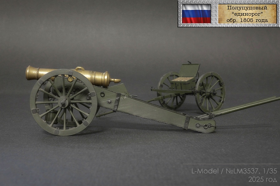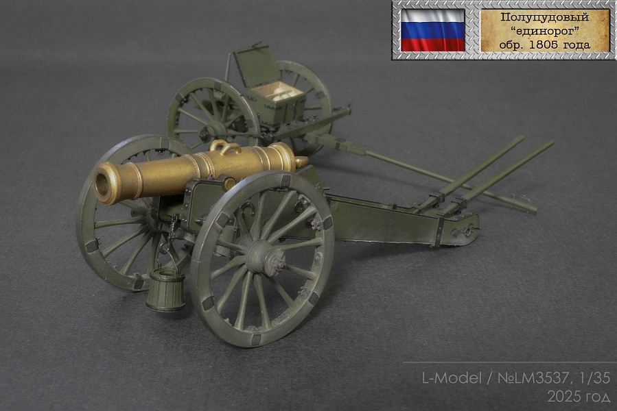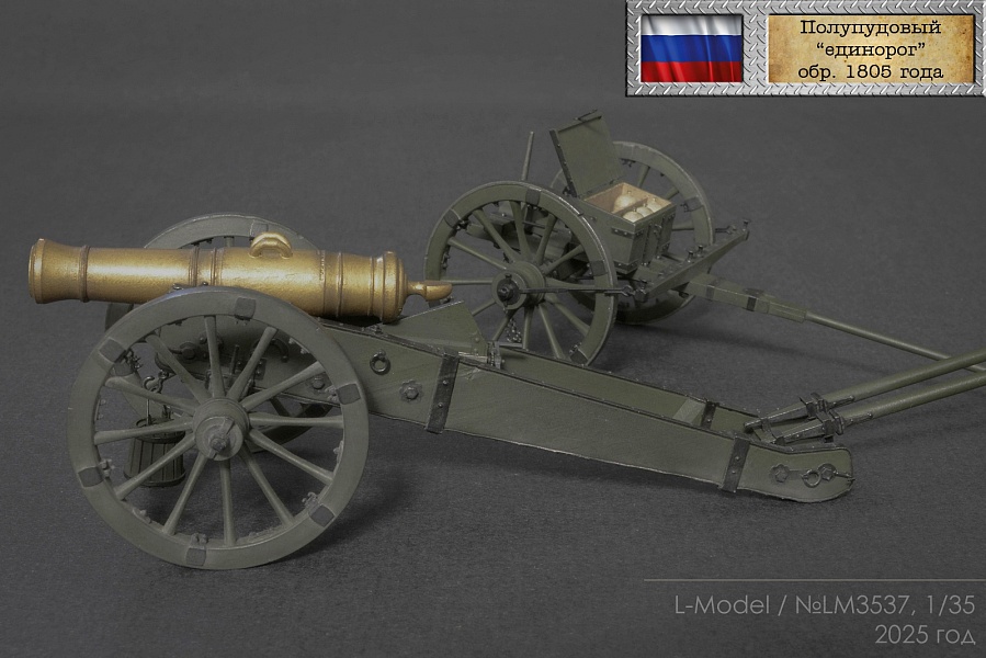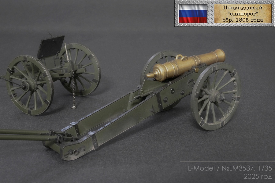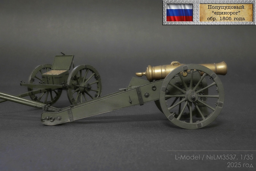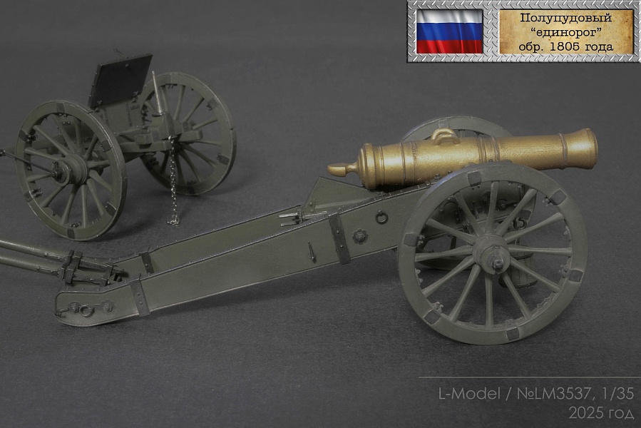 Еще немного прошелся по русской полевой артиллерии начала 19 века и собрал модель русского полупудового единорога образца 1805 года. Это было универсальное орудие, занимавшее промежуточное положение между пушками и гаубицами. Из него можно было стрелять и ядрами, и картечью, и гранатами, и бомбами. А возможность, хоть и сильно меньшая чем у гаубиц, вести огонь по навесной траектории, на что не были способны пушки, позволяла единорогам поддерживать наступление своей пехоты и кавалерии, стреляя по противнику поверх их голов.