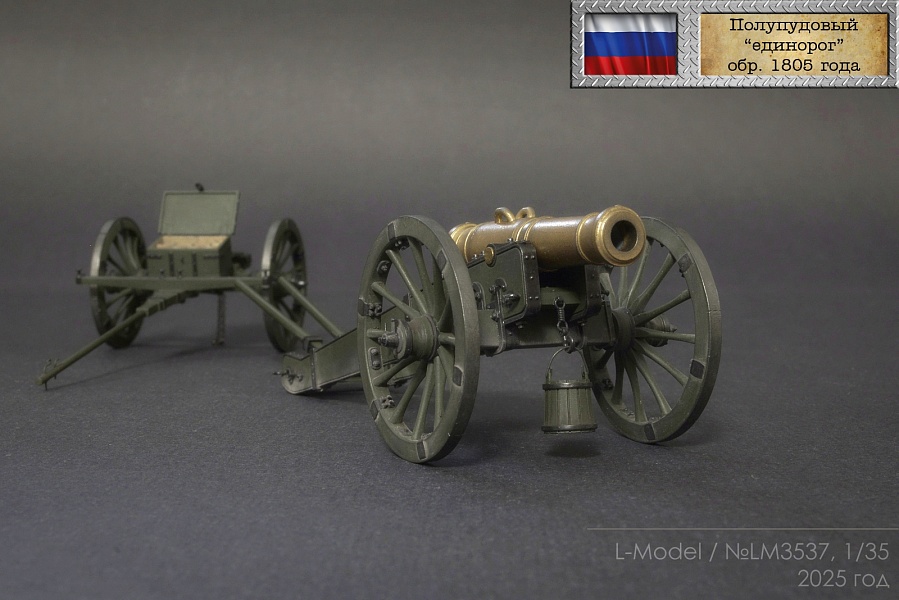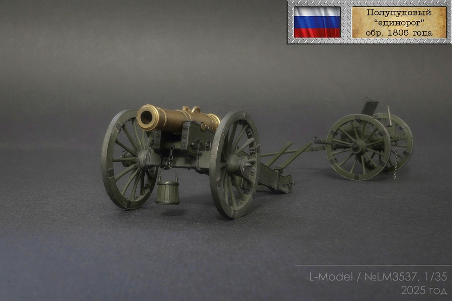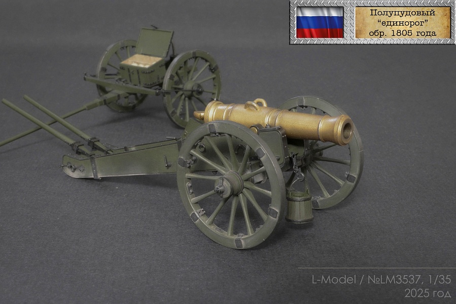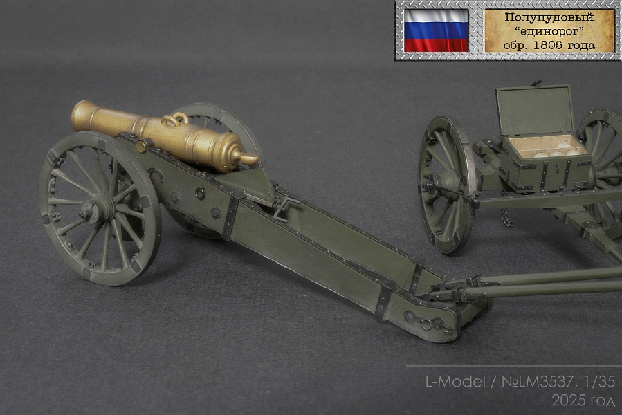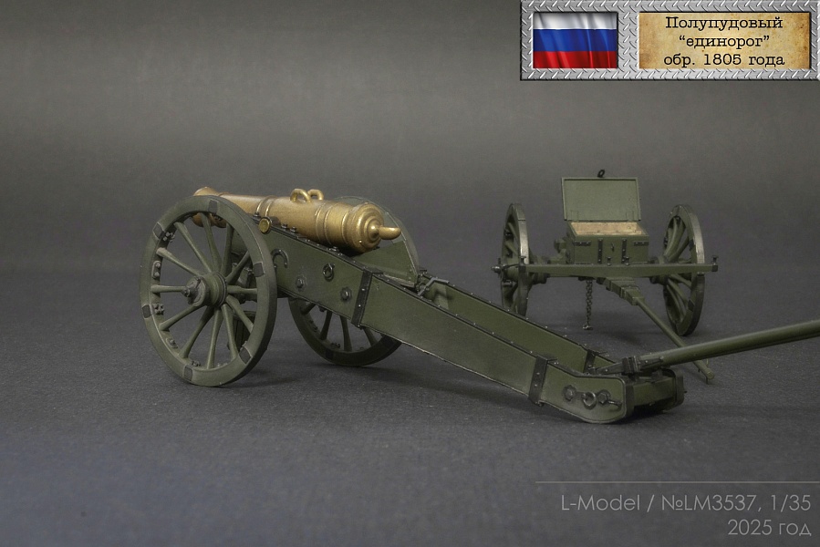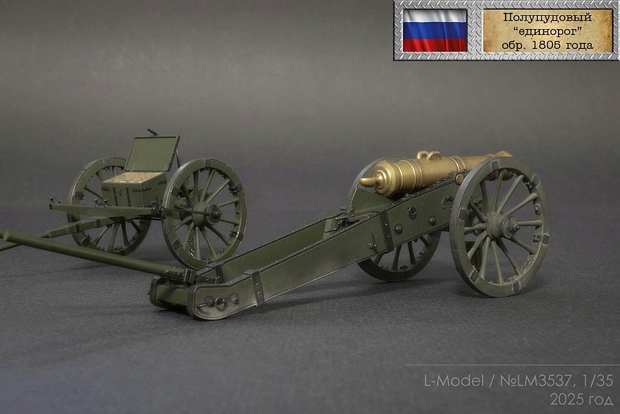 Еще немного прошелся по русской полевой артиллерии начала 19 века и собрал модель русского полупудового единорога образца 1805 года. Это было универсальное орудие, занимавшее промежуточное положение между пушками и гаубицами. Из него можно было стрелять и ядрами, и картечью, и гранатами, и бомбами. А возможность, хоть и сильно меньшая чем у гаубиц, вести огонь по навесной траектории, на что не были способны пушки, позволяла единорогам поддерживать наступление своей пехоты и кавалерии, стреляя по противнику поверх их голов.