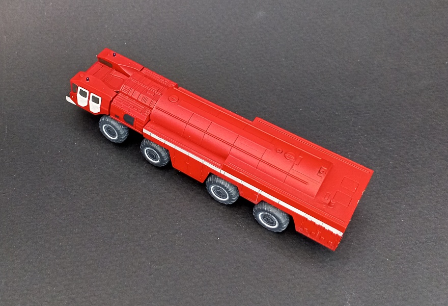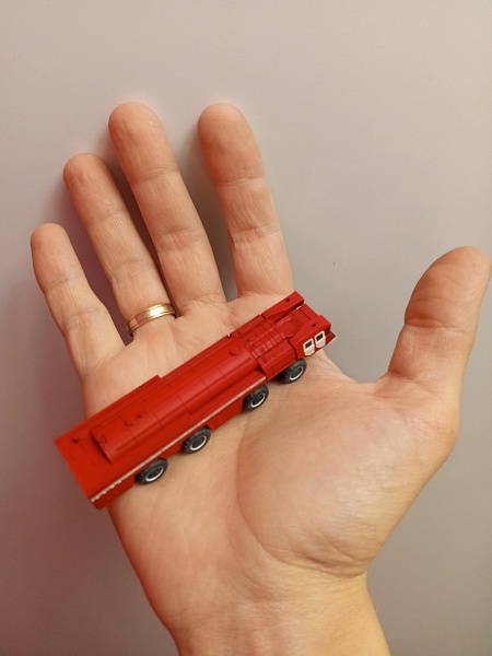 Похоже колёса слегка переразмерены или высота шасси маловата. Да и отсутствие мелкой деталировки создаёт ощущение "красного кирпича".