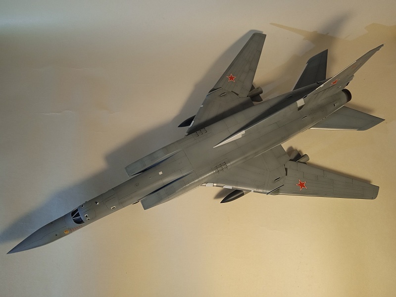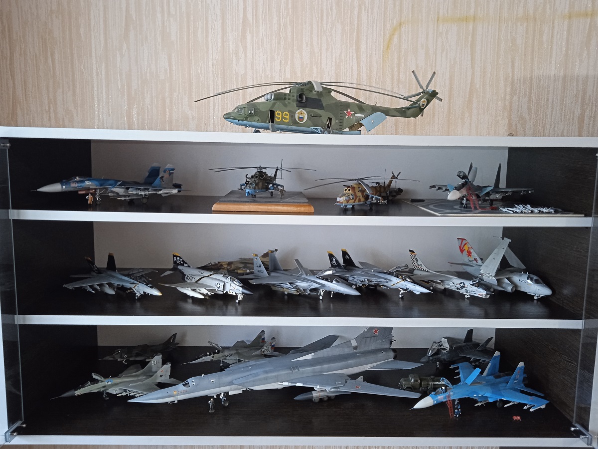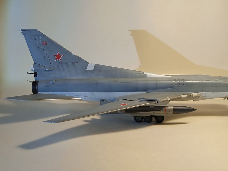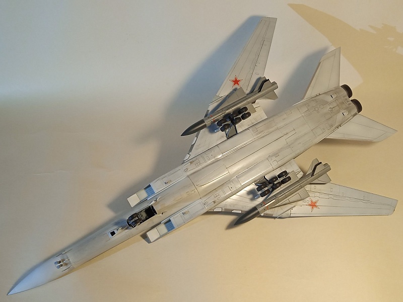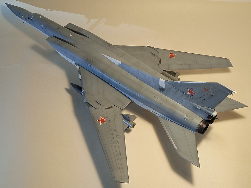 Фото конечно не айс, желтят. Видно, что модель сделана довольно аккуратно. И да она у Трумпетера косячная и сложная, но другого в этом масштабе нет и не предвидится. Жаль нет фото воздухозаборников, написали, что сделали клинья, а хотелось бы и глянуть). Про два момента поворчу - упростили себе задачу, покрасив однотонно металлические элементы в корне сдвижной части крыла. Они там играют цветом прямоугольников заметно. Модель от этого только выиграет. И шов в корне киля надо было убрать.
