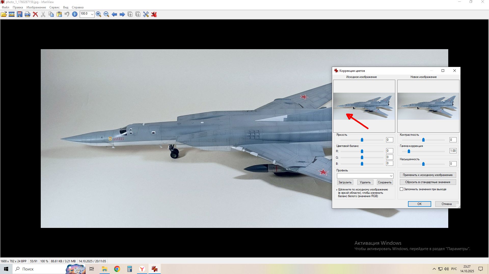 Открыл в редакторе IrfanView. Там есть подменю Изображение-Коррекция цветов. Открывается окошко коррекции. Слева окно с картинкой исходной, справа просмотр того, что получается при правке. Тыкаете курсором в пустое поле рядом с моделью (отметил красной стрелкой), смотрите справа как поменялась цветовая температура. Потом справа же ползунками регулируете ползунки контрастности, гамма-коррекции и насыщенность. Я сперва гамма-коррекцию вытягиваю, что бы поярче сделать, потом добавляю контрастности по чуть чуть. Убираю насыщенность, что бы цвета не резали глаза. Ну там по исходному фото ориентируюсь. Потом не забыть сохранить готовое. Редактор простой, бесплатный. Функционал ограничен, все таки не фотошоп. Но для таких манипуляций - само то. Ну и обрезать фото легко (обычно это самое первое делаю, что бы модель располагалась как надо), в подменю правка. Просто курсор зажимаете левой кнопкой мыши и выделяете прямоугольник, который надо получить. И обрезаете пунктом "обрезать по выделению". Там вообще много еще функций интересных. Включая разные простые эффекты и пр.