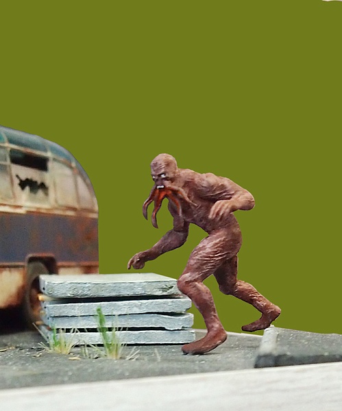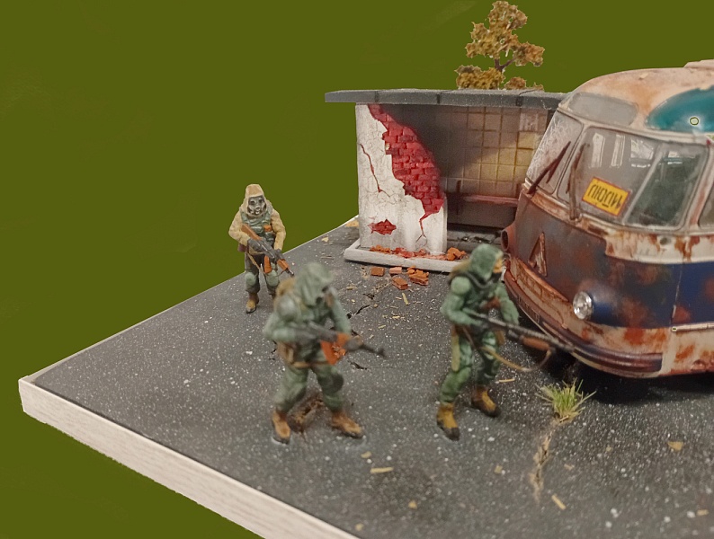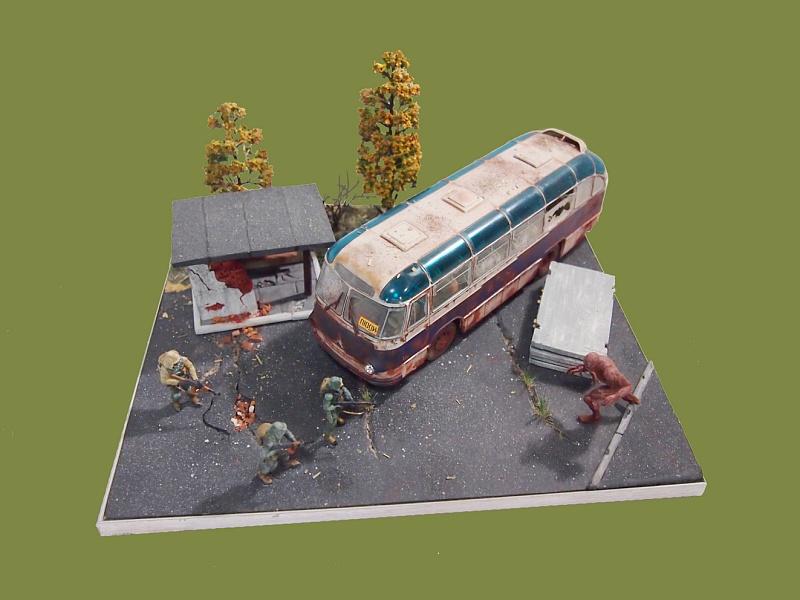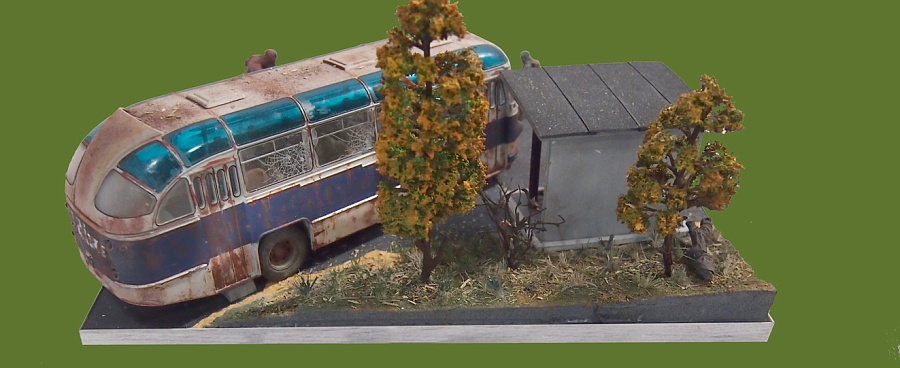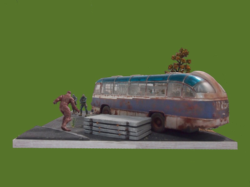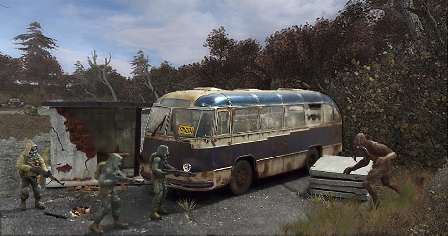Случайно досталась коллекционная китайская модель автобуса ЛАЗ-695 в сильно убитом состоянии масштаб 1:43.Было решено не отходить от традиций и сделать диораму по игре S.T.A.L.K.E.R.Сама модель только подкрашивалась в ободранных местах,вставлялись стекла,наносилась ржавчина.Остановка,основание,бетонные плиты пенопласт.Сталкеры и кровосос с ОЗОНА,деревья с какого-то архитектурного макета(давно лежали).Краски звезда,пигменты ZIP.