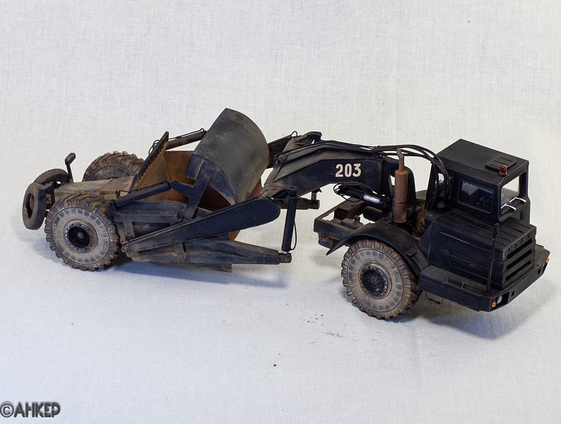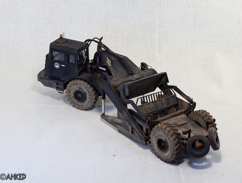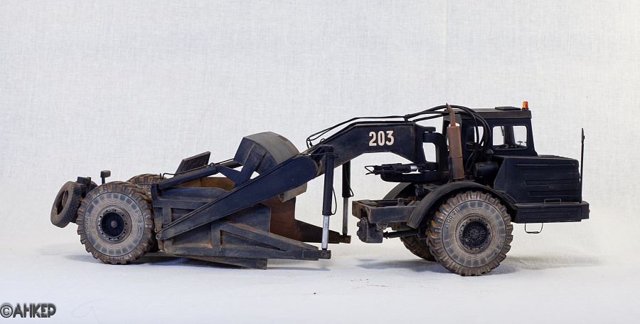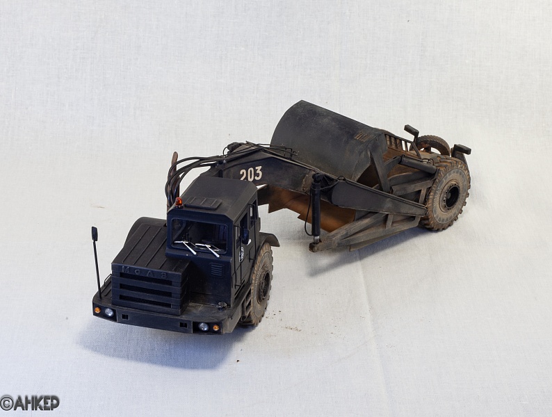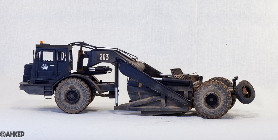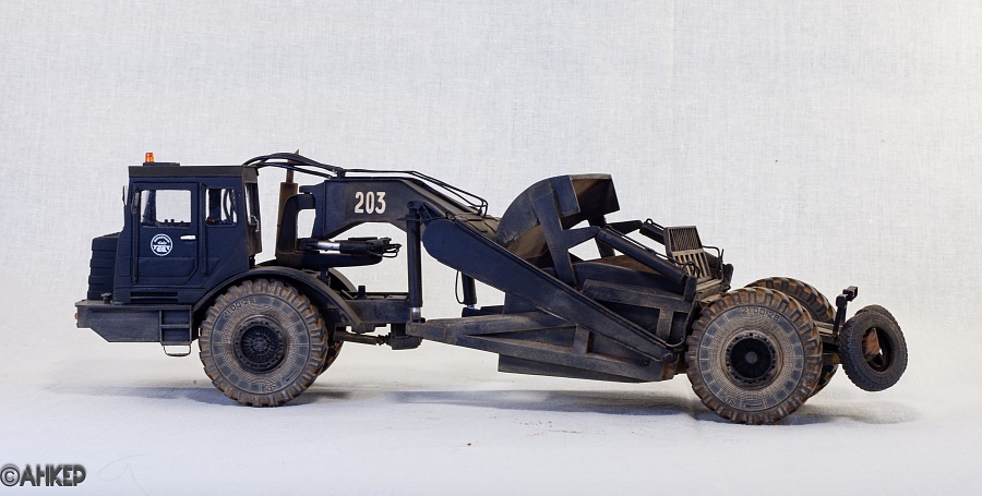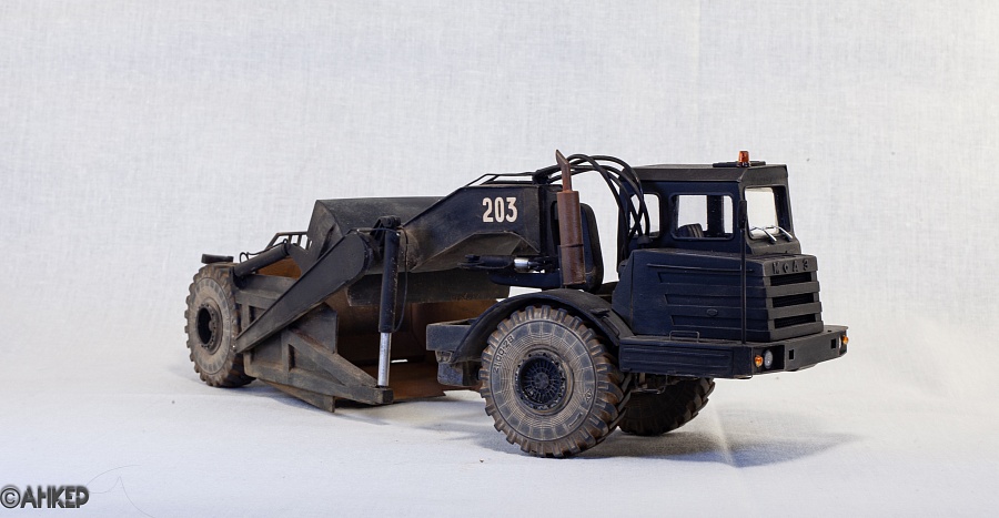 Модель получилась как и предыдущая полностью подвижной. Т.е. скрепер поднимается-опускается. Поворот(хоть и не на все заявленные 85 градусов, но все же) осуществляется. Из всяких мелочей: добавил подножку слева у кабины, ручки управления в кабину, вход для шлангов под кабиной. Заменил гидроцилиндры(родные в целом представляют из себя пару трубочек и рабочими их сделать мягко говоря проблематично), новый глушитель и воздушный фильтр. В движок не лез, все равно не видно =) Новая оптика(под задние засамопалил "кронштейны" как на некоторых фото), дворники. ручка на кабину. Поручни из проволоки. Новые колеса. Отрисованы мной. Сделал крутящимися) Вроде ничего не забыл...