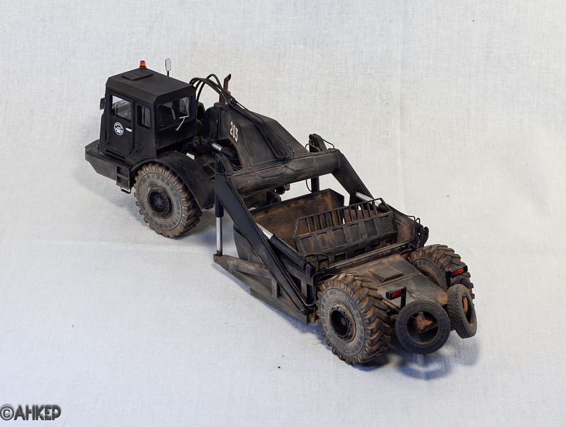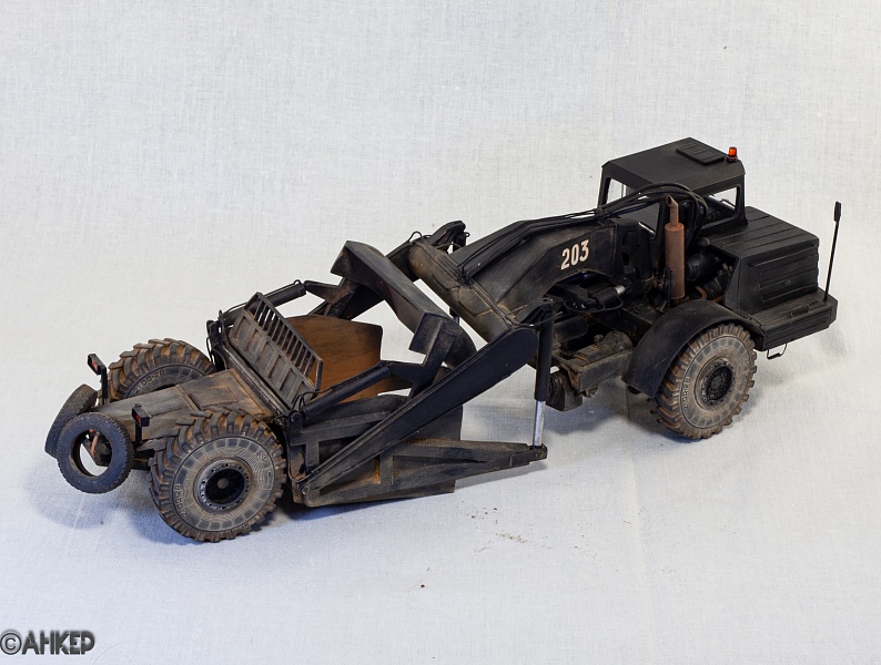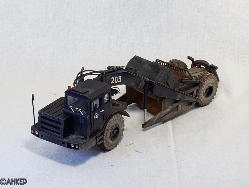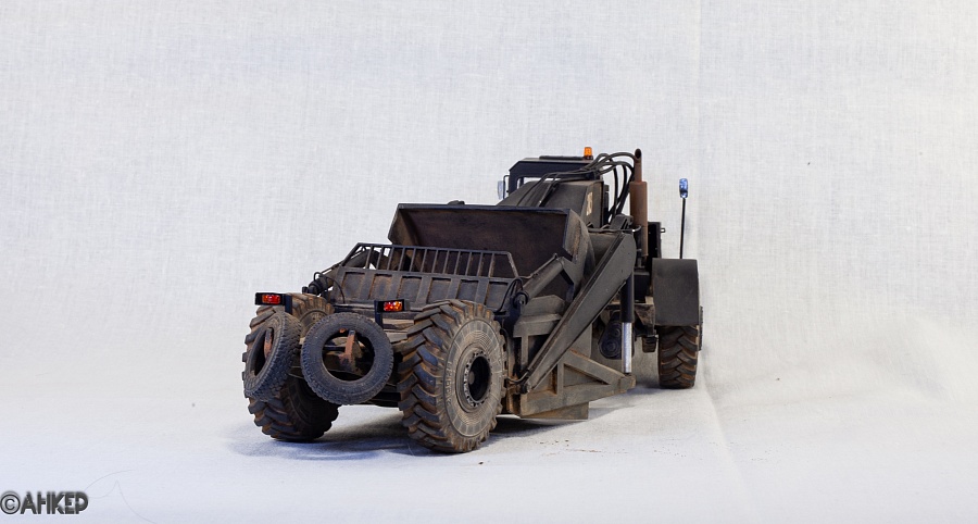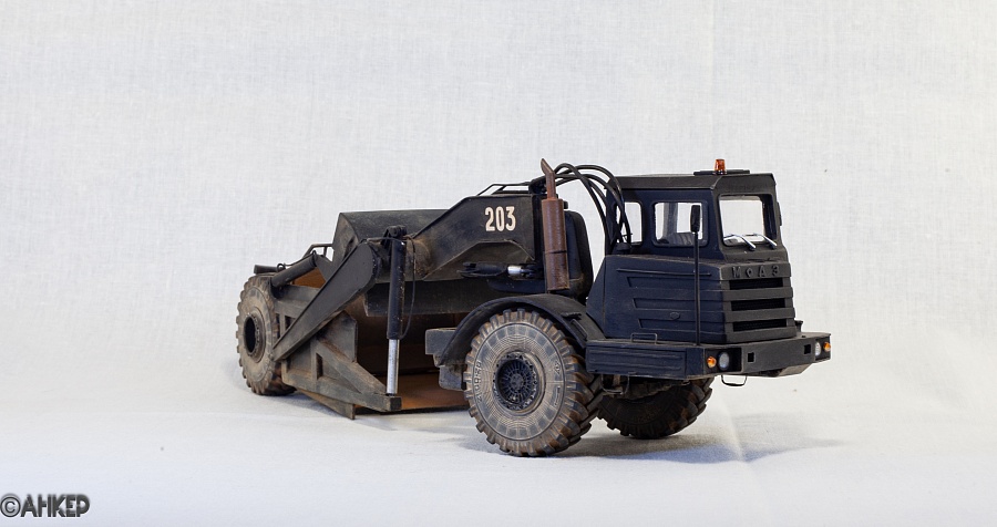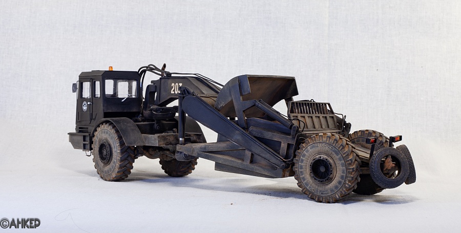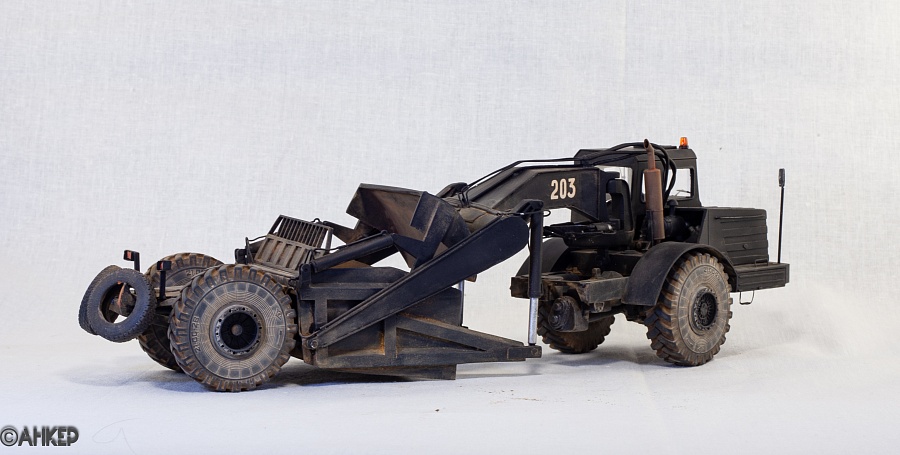Модель получилась как и предыдущая полностью подвижной. Т.е. скрепер поднимается-опускается. Поворот(хоть и не на все заявленные 85 градусов, но все же) осуществляется. Из всяких мелочей: добавил подножку слева у кабины, ручки управления в кабину, вход для шлангов под кабиной. Заменил гидроцилиндры(родные в целом представляют из себя пару трубочек и рабочими их сделать мягко говоря проблематично), новый глушитель и воздушный фильтр. В движок не лез, все равно не видно =) Новая оптика(под задние засамопалил "кронштейны" как на некоторых фото), дворники. ручка на кабину. Поручни из проволоки. Новые колеса. Отрисованы мной. Сделал крутящимися) Вроде ничего не забыл...