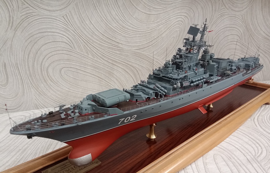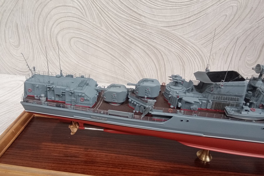 · С 19.02.1987 г. по 09.07.1993 г. на Прибалтийском ССЗ “Янтарь” в Калининграде модернизирован по проекту 11352, после чего корабль был возвращен в состав Балтийского флота. · 26.07.1992 г. сменил Военно-морской флаг СССР на Андреевский. · В 1998 г. завоевал приз ГК ВМФ по противолодочной подготовке (в составе КПУГ). · Исключен из списков флота 12.10.2012 г. О МОДЕЛИ Строился макет «Пылкого» по гибридной схеме. Корпус был выращен на фотополимерном принтере, надстройки мачты – все из латуни. Исключение составляет комовая надстройка помещения буксируемой гидроакустической станции, она, как и артиллерийские башни, пушки-сорокапятки, торпедные аппараты, баркас и шлюпка были изготовлены на принтере. Все остальное было либо литье в резине либо сделано на ЧПУ и дорабатывалось вручную. Леера – фототравление. Еще одной "фишкой" данной модели стал винтажный подмакетник и витрина изготовленные из дуба, что придало модели старообрядный музейный стиль... Вот как бы и все, что хотел сказать по данной модели и ее прототипе. С уважением, Александр