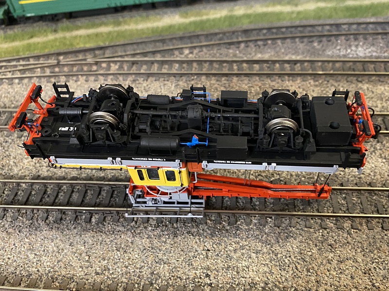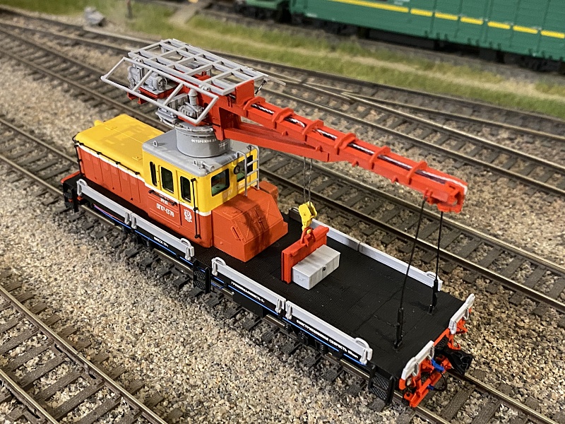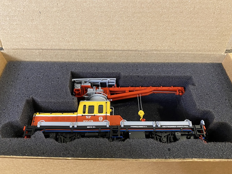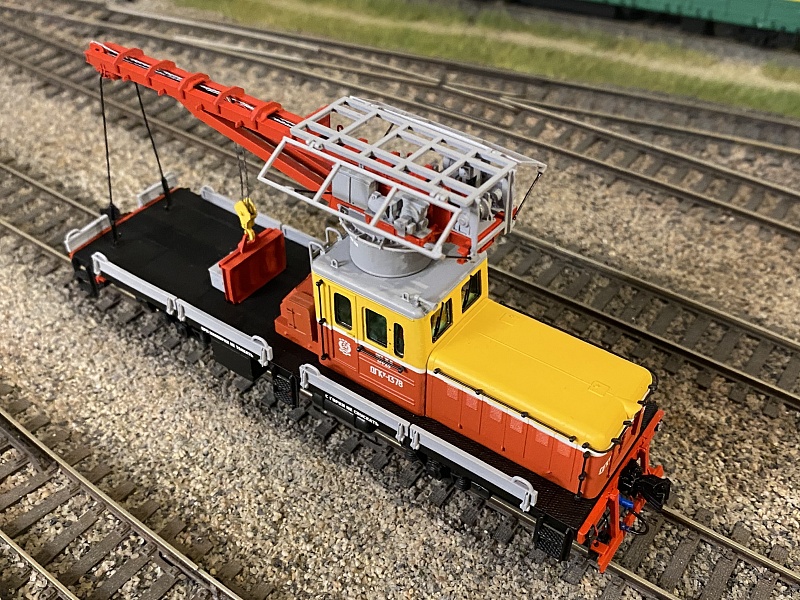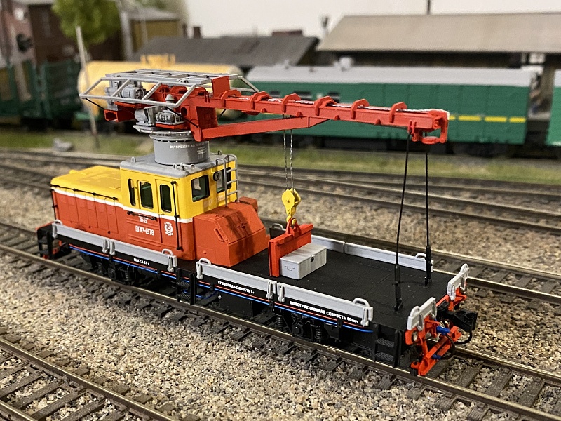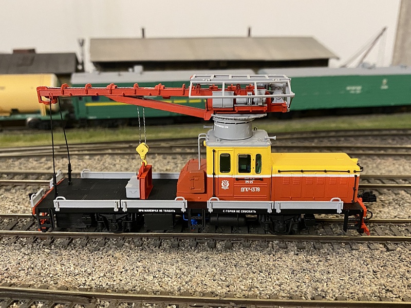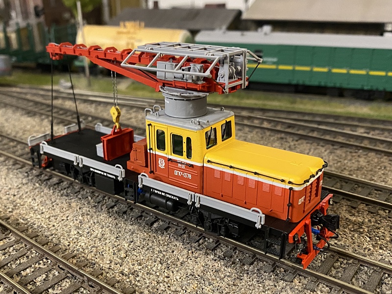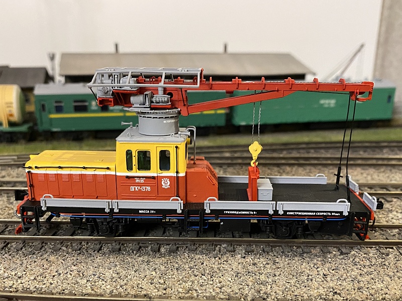 | Модель крановой дрезины ДГКу-1378 в масштабе 1:87, изготовленная в масштабе 1:87 из набора для самостоятельной сборки производства студии SalivanGreen. Модель строилась по мотивам, без привязки к конкретному прототипу, номер был взят из имеющихся в наборе декалей. Фотографий настоящей машины с номером 1378, к сожалению, не сохранилось. По типу машина относится к средним производственным сериям и имеет классический и наиболее типичный и распространенный внешний вид: округлый капот, новую крановую установку с лебедкой. От ранее построенных моделей эта отличается поддерживающими балками стрелы: крупные швеллерного типа вместо более привычных и компактных трубчатых. Модель стендовая, имеет металлические колпары и хорошо катается. Но не сама. Сцепки СА3 можно заменить на Kadee #17 или накидную петлю. Для этого в комплекте есть сменная деталь топливного бака с интегрированной NEM-шахтой и дополнительная NEM-шахта для другого торца платформы. Модель получила классические для ДГКу желто-оранжевый окрас с разделяющей белой полосой, с платформой черного цвета и серыми бортами. Декали, как было сказано выше, взяты из набора. |