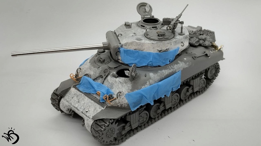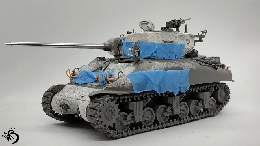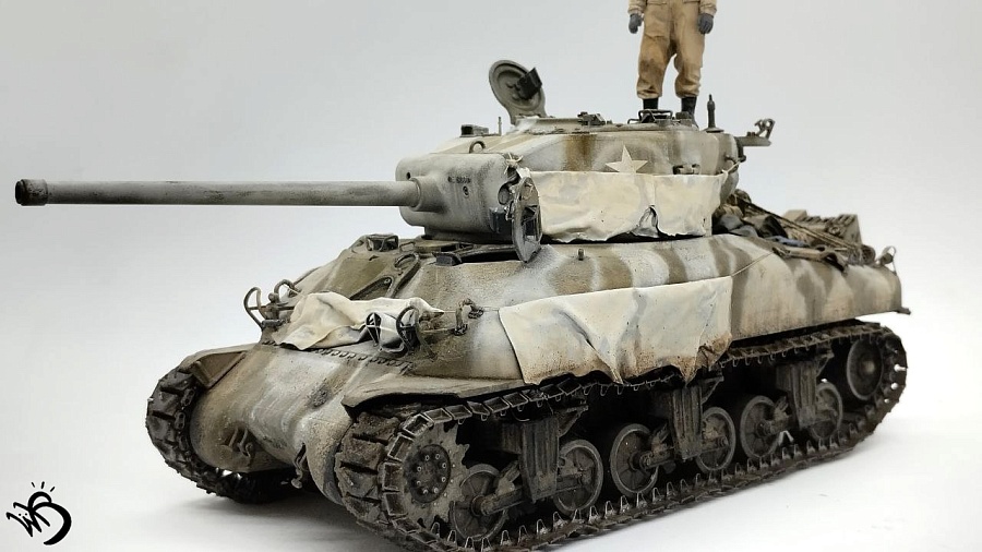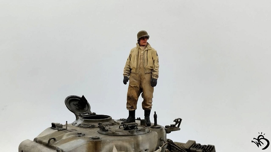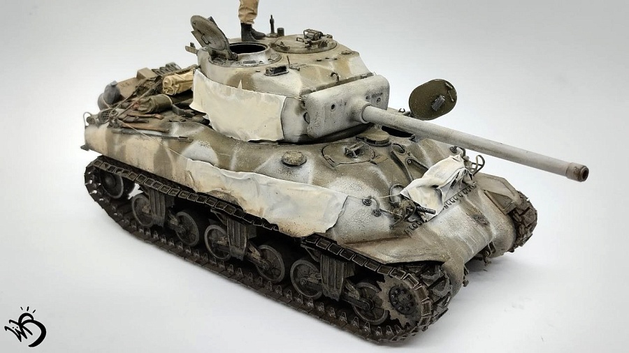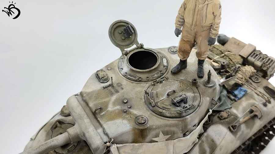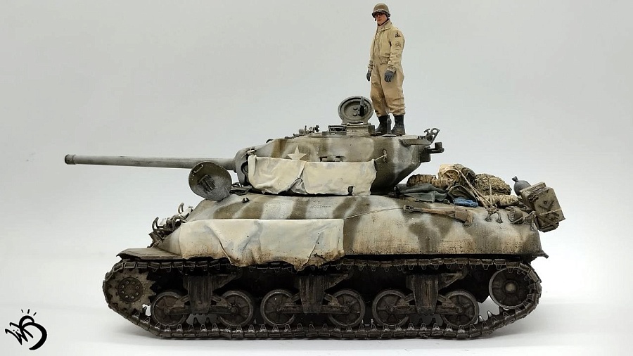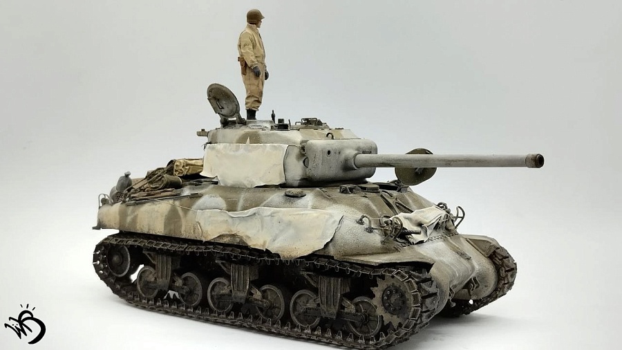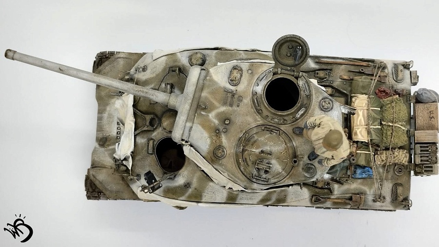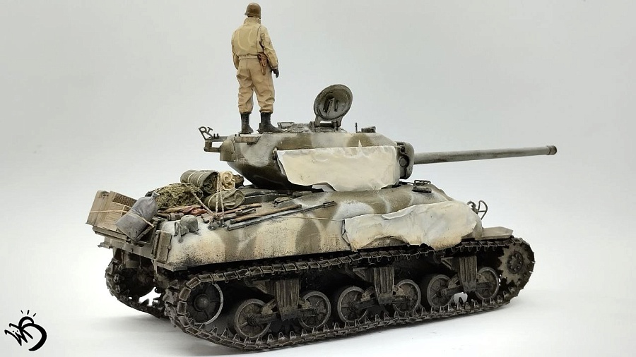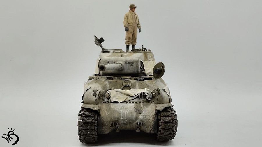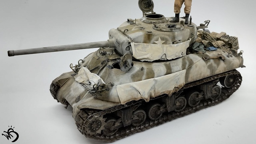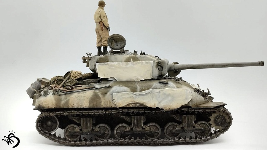 По окрасу, изначально хотел сделать простенький зелененький Шерман, обвешанный белыми тряпками, но в процессе покраски поглядев на все это, посчитал что выглядит это все немного скучновато, отчего намалювал зимний камо и на самом Уильяме Текумсевиче. Ну а дальше по классике - масло, сколы, ржавчина и грязюка. Краски - старые добрые акрилы от АК/Ammo Mig, Jim Scale, Звезда и другие. Гадинг - пигменты и эмали от AK/Ammo и Vallejo. Барахло на МТО - часть из набора, часть из запасов. Миниатюра с Алиэкспресса также окрашена акрилом.