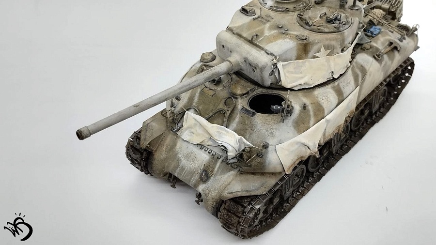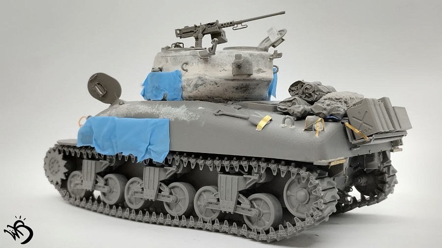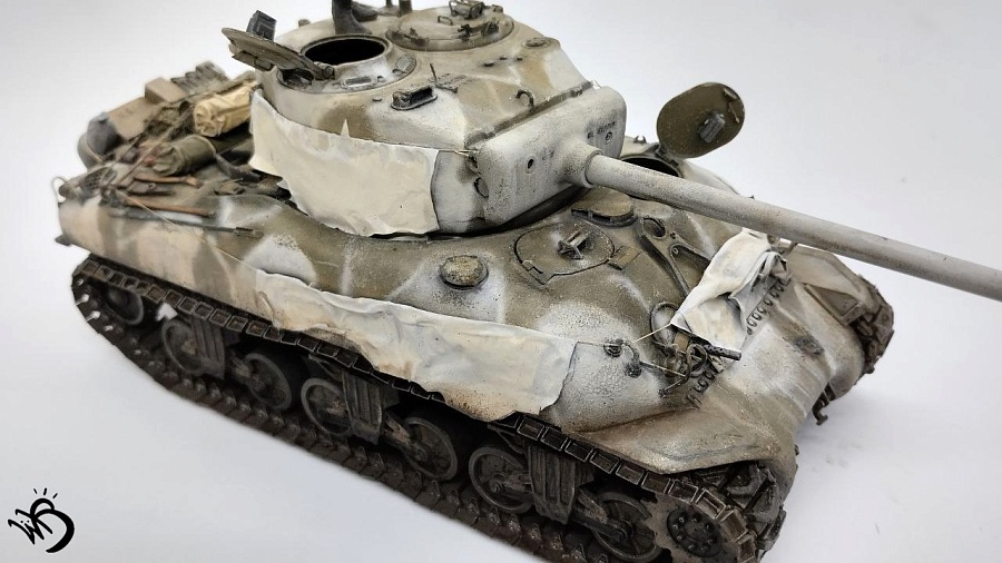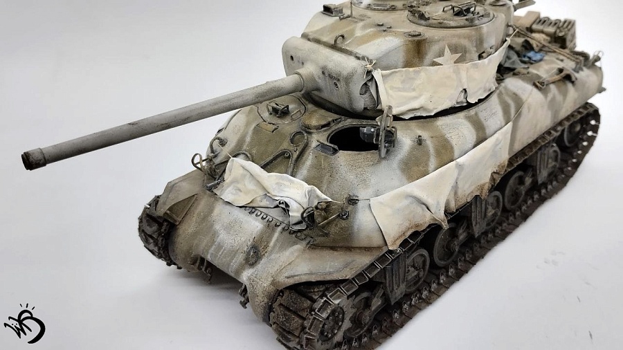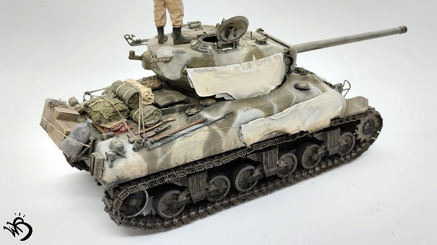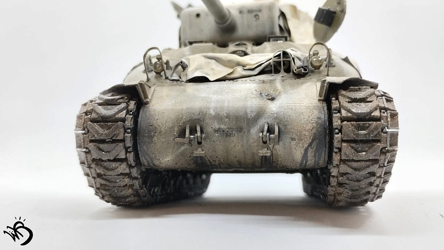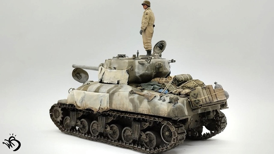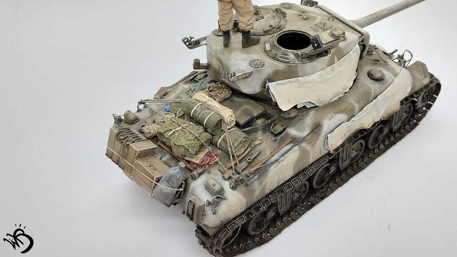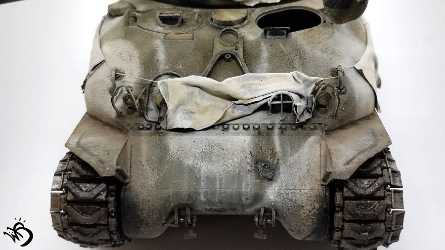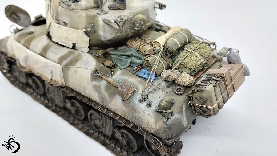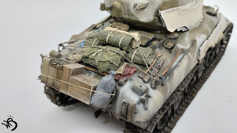 Да, Шерманы у этой фирмы в сборке не айс. Простыни - видимо, на каких-то машинах и были, но смотрятся прикольно. Смущает послевоенная телефонная коробка сзади справа на кормовой части. Браунинг потерялся или спрятан в глубине машины, - бывало. Крепеж шанца тоже бы не помешал. Но в целом понравился !