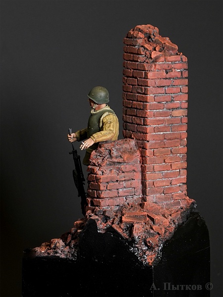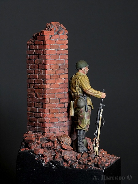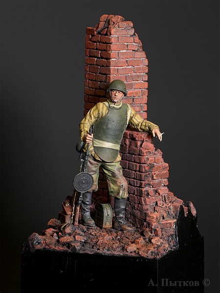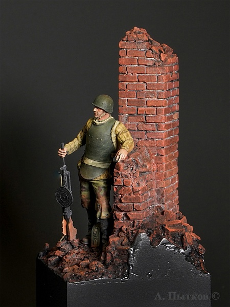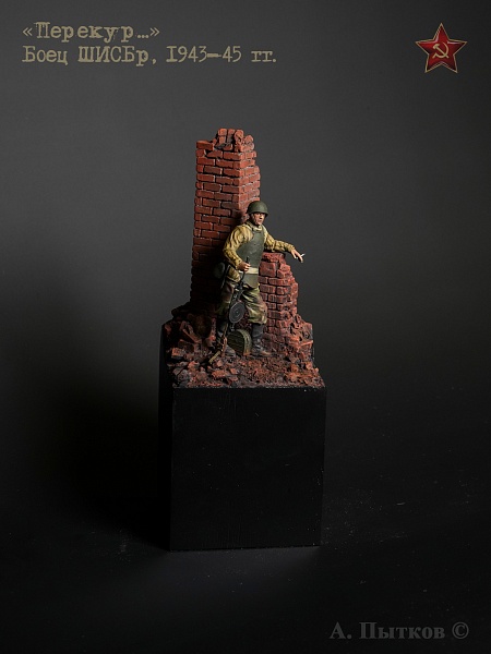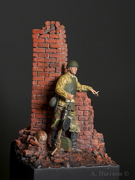 Фигура пулеметчика ШИСБр от Soga Miniatures. Масштаб: 1/35 Вот и еще один тяжелый бой позади. Живой. Устало прислонился к развалинам. Трофейная сигаретка, которой угостил командир, пришлась очень кстати. Приятно вот так постоять, вдыхая сладковатый табачный дым... За плечами немало сотен километров пройденных дорог, смерть товарищей, тяжелые бои, бессонные ночи... Ну ничего… Еще немного, еще чуть-чуть… Вот сейчас докурю… И пойдем, пойдем дальше давить фашистскую гадину…