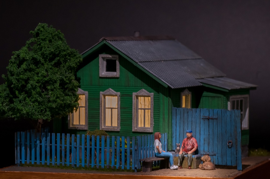 Продолжаю серию уютной деревенской милоты в 72 масштабе. На ваш суд вот такая незатейливая композиция. Начал с домика - зацепился за него взглядом на Озоне. К нему так и просился палисадник, а там и лавочка. Ну какая лавочка без душевных посиделок родных людей, которые так редко видятся. Как водится у нормального деревенского жителя есть собака и пара-тройка кошек. Домик из картона, очень аккуратно вырезан лазером. Его я купил на Озоне в магазинчике "Аксессуары для диорам" (Соколова Т.М.).Дерево тоже с Озона от "Деревьев для макетов и диорам", сам заморочился за кустики.Фигурки нашел на развалах интернета и напечатал на смоляном принтере.Качество 3Д моделей конечно ужасное, только собака более-менее проработана. Успокаивает исключительно то, что обычным глазом детали не видно))) Покраска в основном Пасифик88 и Звезда. Внутрь заведена подсветка из китайской гирлянды от батареек-таблеток. Приятного просмотра.