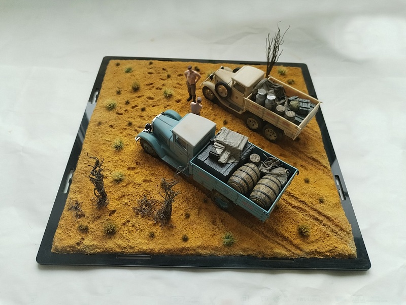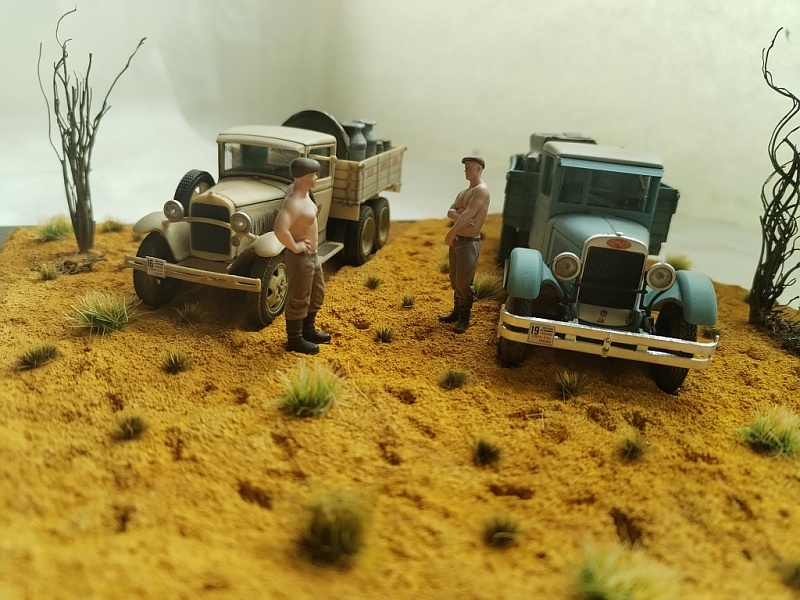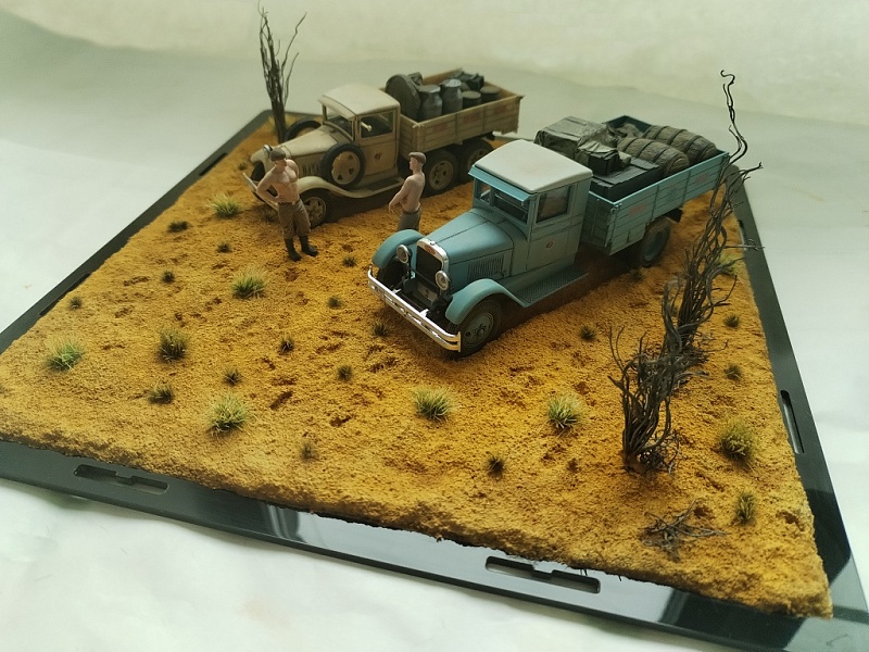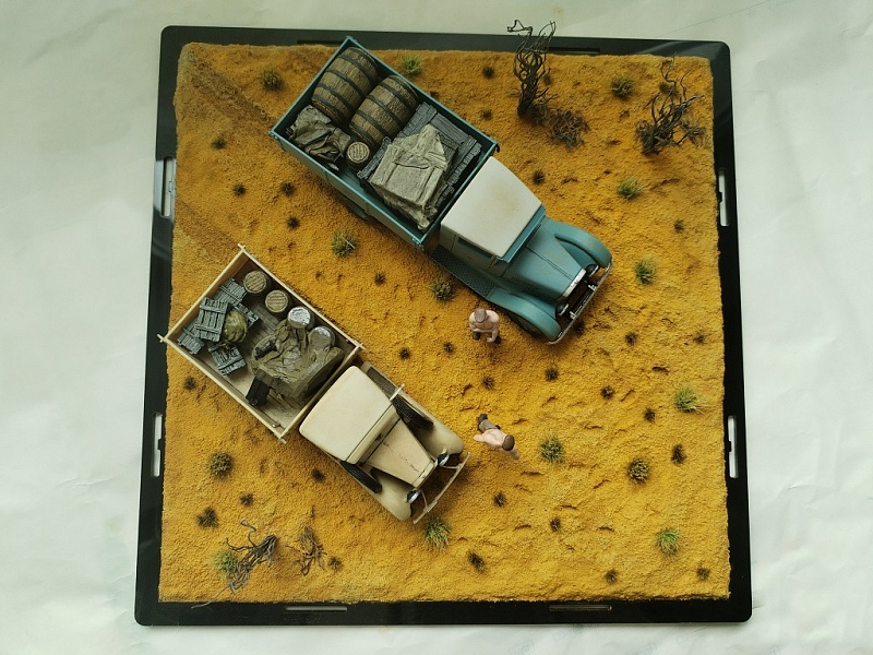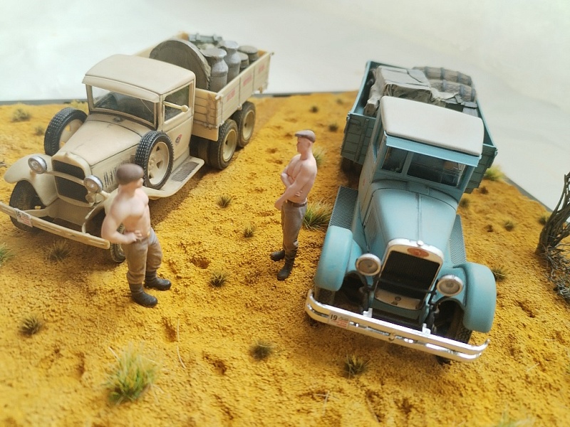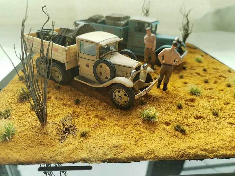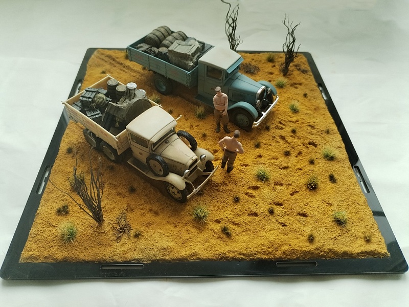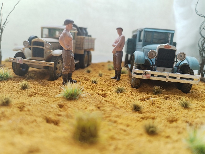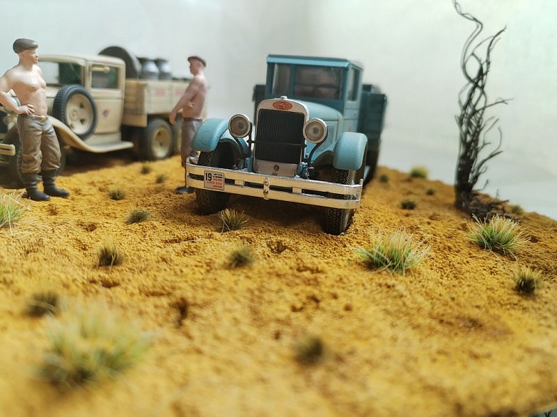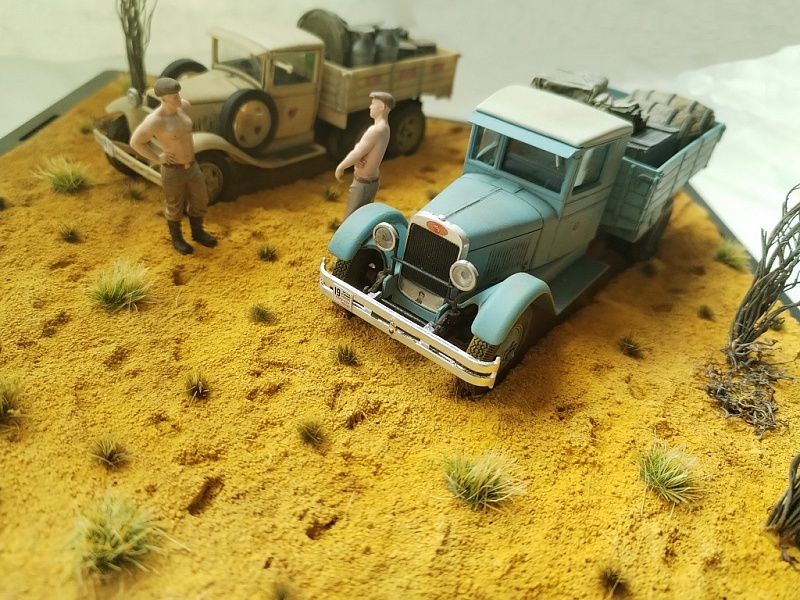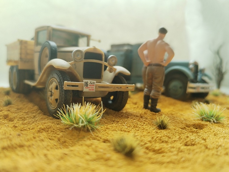 | Здравствуйте форумчане! Идеей создания этой диорамы послужил достаточно известный автопробег, который проходил в СССР с 6 июля по 30 сентября 1933 года.Основанием для диорамы служит нижняя часть прозрачного футляра (кораба 250x250x120). В качестве структурной пасты, кварцевый песок смешанный с клеем ПВА, окрашенный в “песчаные” тона “Звездовским” акрилом, и затем затертый пигментом “желтый песок” от “Zip maket”. Кусты сделаны из метелки, травяные кочки с “Алиэкспресса”. Модели старые, известны всем. Фигурки от фирмы “АМформа”, приобретались уже окрашенными. Из дополнений: Покрышки и диски “Харьковская резина”, груз в кузове: “Zip maket”, 3d печать с “Озона” и “Алиэкспресс”. Декали от "Zebrano" под 72-ой масштаб. |