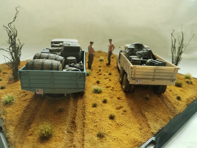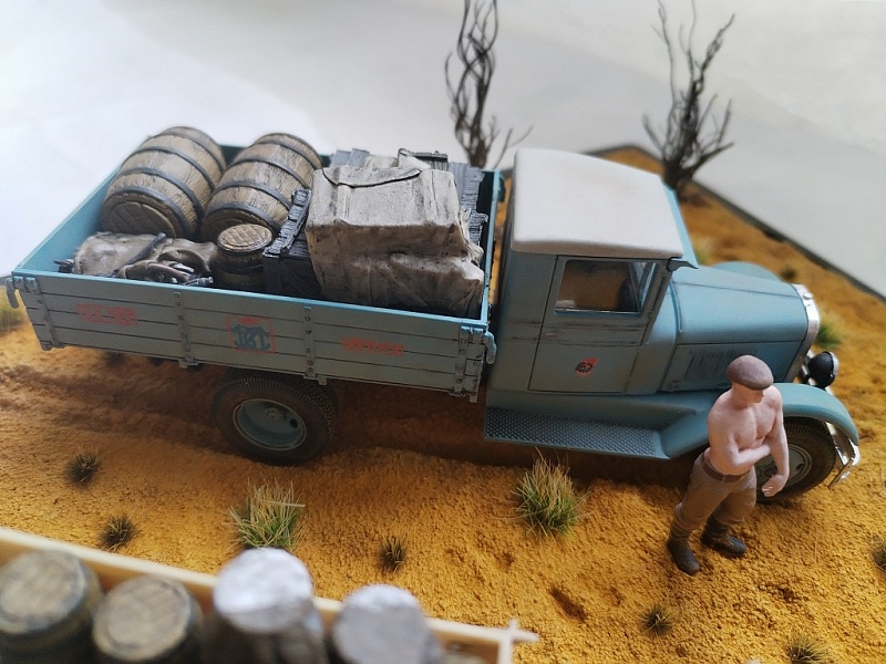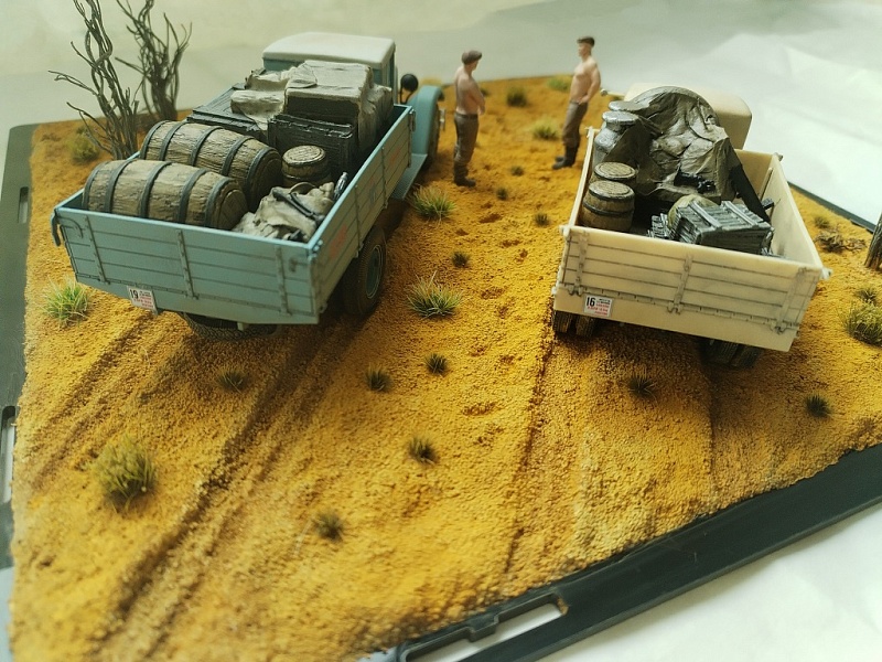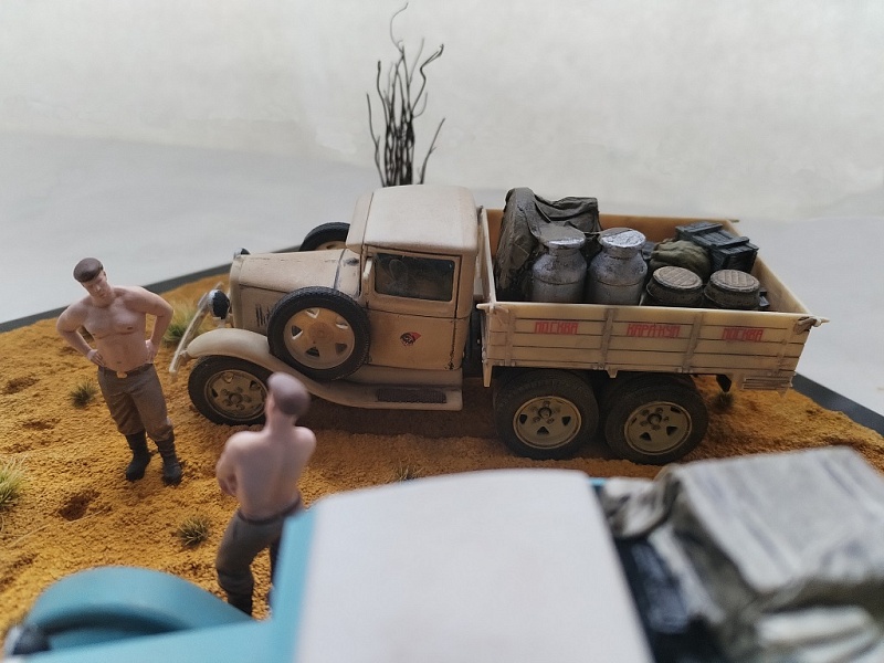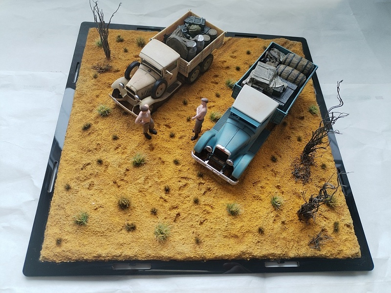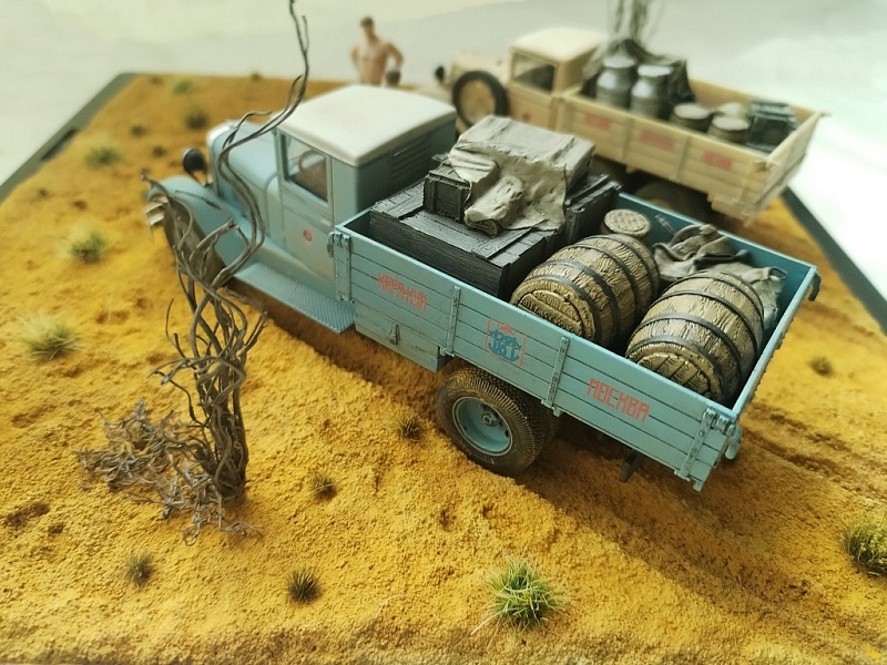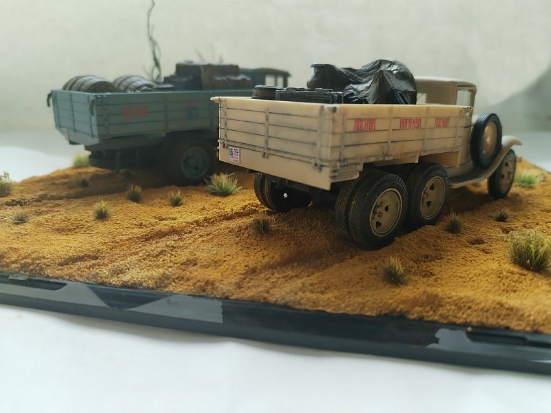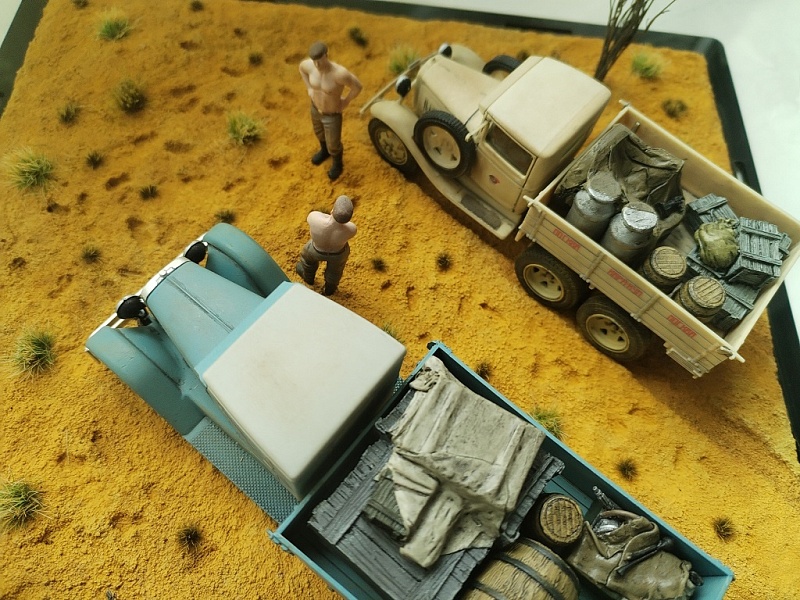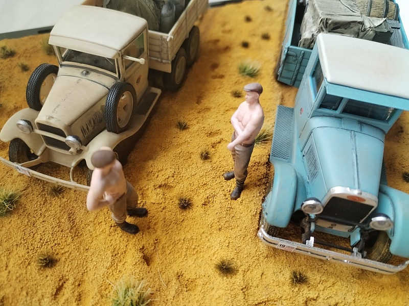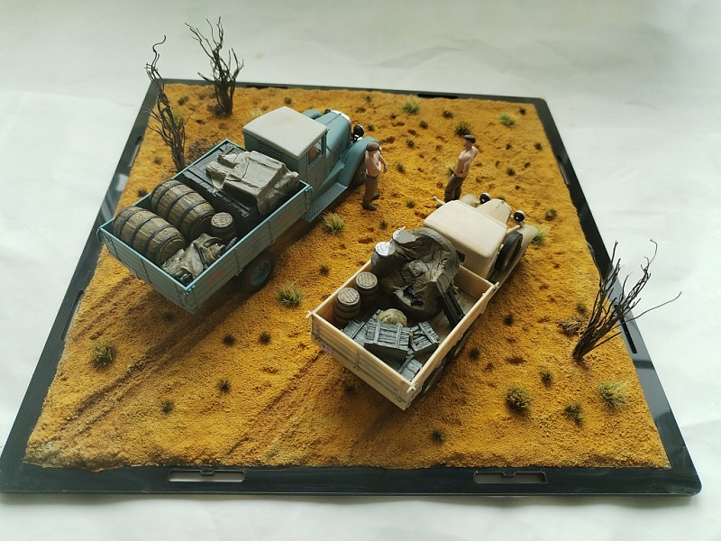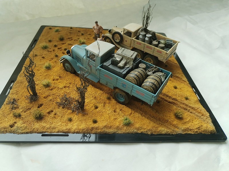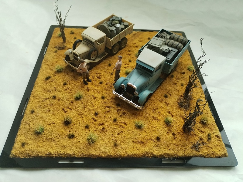 | Здравствуйте форумчане! Идеей создания этой диорамы послужил достаточно известный автопробег, который проходил в СССР с 6 июля по 30 сентября 1933 года.Основанием для диорамы служит нижняя часть прозрачного футляра (кораба 250x250x120). В качестве структурной пасты, кварцевый песок смешанный с клеем ПВА, окрашенный в “песчаные” тона “Звездовским” акрилом, и затем затертый пигментом “желтый песок” от “Zip maket”. Кусты сделаны из метелки, травяные кочки с “Алиэкспресса”. Модели старые, известны всем. Фигурки от фирмы “АМформа”, приобретались уже окрашенными. Из дополнений: Покрышки и диски “Харьковская резина”, груз в кузове: “Zip maket”, 3d печать с “Озона” и “Алиэкспресс”. Декали от "Zebrano" под 72-ой масштаб. |