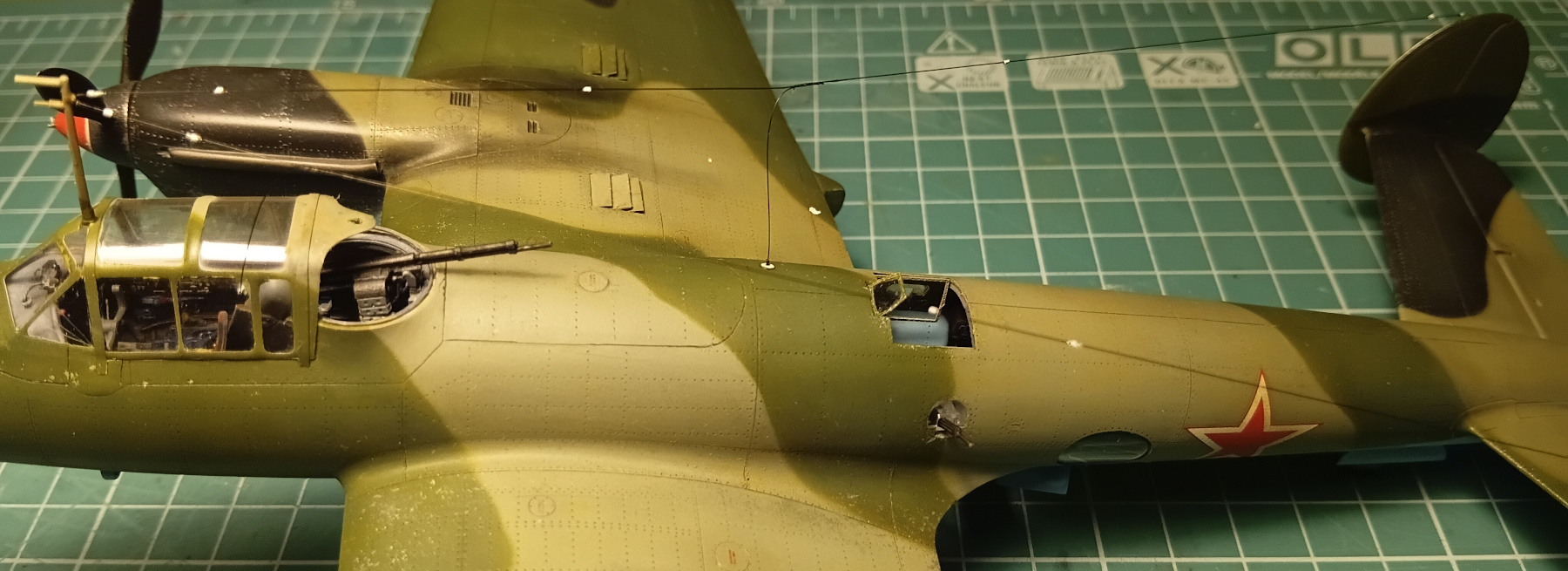 | Эта коробочка Пе-2 лежала у меня довольно давно, все не мог к ней подступиться. Потихоньку закупался допами: - 3 набора фототравления Микродизайн - 3D декаль и фонарь Quinta Studio - декаль Бегемот Долго курил разные источники, в итоге основой для доработок стало описание конструкции Пе-2 1945 года и гора фотографий. Интерьер. Запилил интерьер, это сплошной суслик, зато было интересно разбираться в "Описании..." Пе-2 и доступных фотографиях. Из крупных изменений: - Выбросил кресло стрелка-радиста. В "Описании..." оно не упоминается, да и на фото не видно. - Выпилил нижний люк стрелка-радиста. - Распилил бронеспинку летчика, сделал ее в откинутом положении. - Откинул сиденье штурмана, правильно повесил ремни. Их обычно вешают на сиденье, но по "Описанию..." они висят на станине пулемета и даже на монинской Пешке там есть места крепления. Окрашивал интерьер по табличке цветов интерьера. Почему-то многие красят интерьер как в монинской Пешке, часть элементов в зеленый, но я не понимаю, зачем это бы делалось в условиях войны - поэтому все что можно, покрашено в серый. Кроме того, я поискал на сайте Тризна найденные элементы разбившихся Пешек и там детали, которые в музейной Пешке покрашены в зеленый, имеют серый цвет. В доработке использовал смесь Квинты, Микродизайна и самодела. Экстерьер. Исправил ступеньку между носком крыла и остальной частью, для этого пришлось детали носка распилить на верхнюю и нижнюю половины и приклеивать к верхним и нижним поверхностям крыла, в потом шпаклевать в районе носка. По-другому у меня не выходило аккуратно выставить детали. Исправил неточности геометрии в районе крышки над фюзеляжным баком и зализы крыла в задней части в районе окон. Переделал створки воздуховодов водорадиаторов. Доработал фару, вытянул отражатель из фольги, лампочка - бисеринка. Немного изменил расшивку в районе центроплана. Вообще, расшивку сильно не трогал, исправив самые крупные неточности. И я уверен, что точно забыл часть лючков и еще чего-нибудь доделать и перенести. Полностью переделал по фото бомбодержатели на поздние, утопленные. Звезда дает только пару ранних. Доработал ниши шасси, они довольно плоские в наборе и травление не исправляет этот недостаток. Сделал смотровые лючки и глазки в хвостовом оперении, на горизонтальном - только сверху, так как не нашел фотографии снизу. Фонарь использовал вакушный от Квинты, родной был гнутый, да и вакушный прозрачнее. Но вот нижнее остекление и мелкие окошки стоят родные, так как вакушные слишком дутые и смотрелись некрасиво. Кстати, у прототипа на фотографии не просматривается фонаря, я его и не поставил. Окраска. Грунтовку попробовал спиртовую Jim Scale v3 - понравилась больше предыдущего варианта. Красил водянками Jim Scale (светло-коричневый) и Pacific88 (все остальное). Лаки спиртовые Jim Sacale. Сильно ушатанные самолеты я не люблю, поэтому чуток пошарпал металликами и нанес маслом выхлоп + чуток потеков. Декали из набора от Begemot на самолет 2 БАК ВВС РККА, 1944 год |