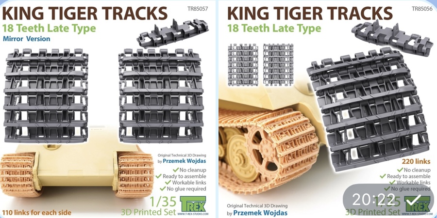 Автор пишет Траки KGS 73/800 от T-Rex,а согласно таблице приведенной им с тигрового угла их ставили сначала марта 1945 года, на очень поздние кинги. На ранних стояли другие.