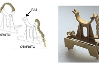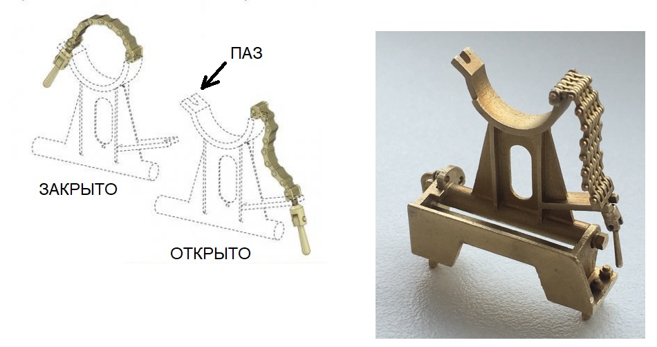 И хотел бы здесь разместить на примере картинки от набора дополнения памятку по характерной ошибке, которую допускают собирающие наборы от RFM: положение ручки-закрутки на цепи фиксатора орудия в походное положение - она может быть или вместе с цепью справа, или в пазу слева. Одновременно и там, и там - закрутка быть не может. Также на картинке немного схематичный, но но для понимания принципа вид фиксатора, это хоть и модель, но просто наглядно крупным планом.