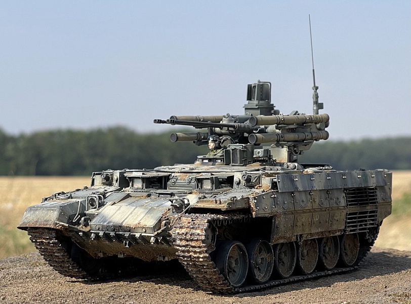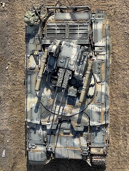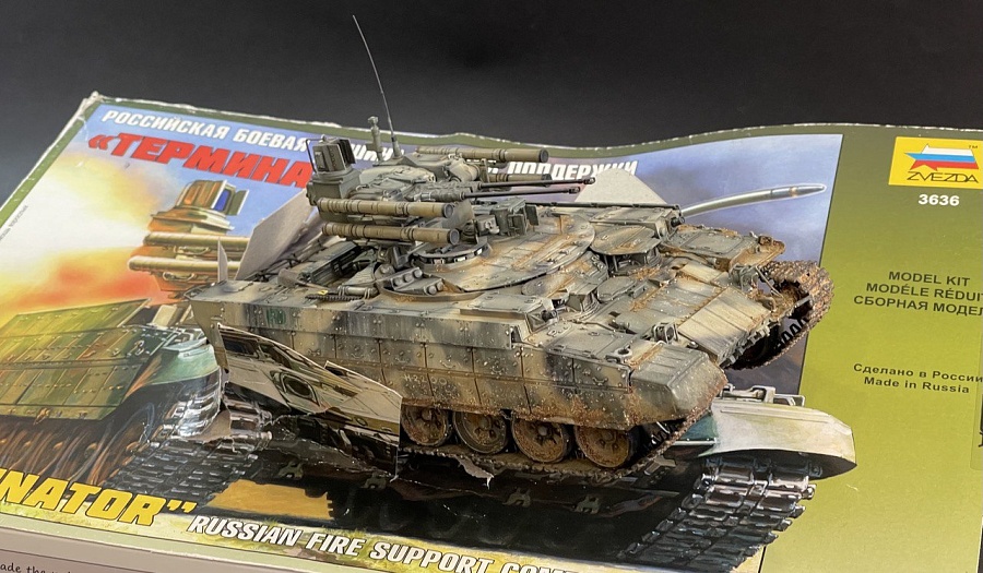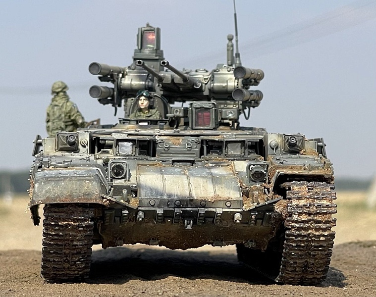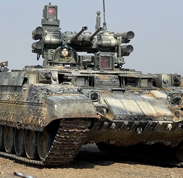 | Модель Российской БМПТ «Терминатор» в масштабе 1/35 от отечественного производителя «Звезда» (3636).Набор удовлетворительный, чувствуется усталость пресс-форм, имеются облои и утюжены, в общем шпаклевка и вытекающие инструменты пригодятся. Строился тоже своеобразно и с особенностями, например, членение траков не для слабонервных в целом стыкуемость ходовой вызвало ряд затруднений. Так же по ходовой в сборе с траками пришлось повозиться, перед окрасом всей модели, сначала был окрашен низ модели после приклеены боковые экраны. Всё было замаскировано и потом уже окрас верхней части (данная манипуляция была проделана ввиду того, что как по мне очень рискованно было клеить экраны ужа на окрашенные крепления юбок, был риск испортить краску клеем). Противокамулятивные решетки на карме то же немного доработал, была аналогичная проблема в части возможности запачкать посадочные места клеем после покраски или неудобного подхода к окрасу корпуса через решётки, поэтому переделал крепления и уже после окраски всей модели и решёток все стало отлично. Производитель предлагает установить вращающую башню основного вооружение раз и навсегда путем фиксации её к корпусу снизу. Такой вариант лично меня не устраивал и пришлось переделать в съёмную башню по классической модельной схеме. Далее в целом стандартные доработки: -трос заменен на медный, -некоторые из люков сделал рабочими, -триплекса и осветительные приборы СD, фольгированный скотч, пленка, -использован базовый набор фототравления от МД (очень понравился добротный набор), -электропроводка медная проволока, -ящики, трос и прочее оборудование и мелочевка на броне афтемаркет, -подпилена толщина подкрылков, -антенна из щетины кисти+шприц, -нанесена имитация литья метала, -имитация грязи (гипс/песок/пва), -высверлил ствол пулемета. Модель построена без привязки к конкретному прототипу и носит собирательный образ. Роспись: -Tamiya, Zvezda, Revell, масло "Гамма", эффекты и пигменты ZIP maket. С уважением, приятного просмотра! |