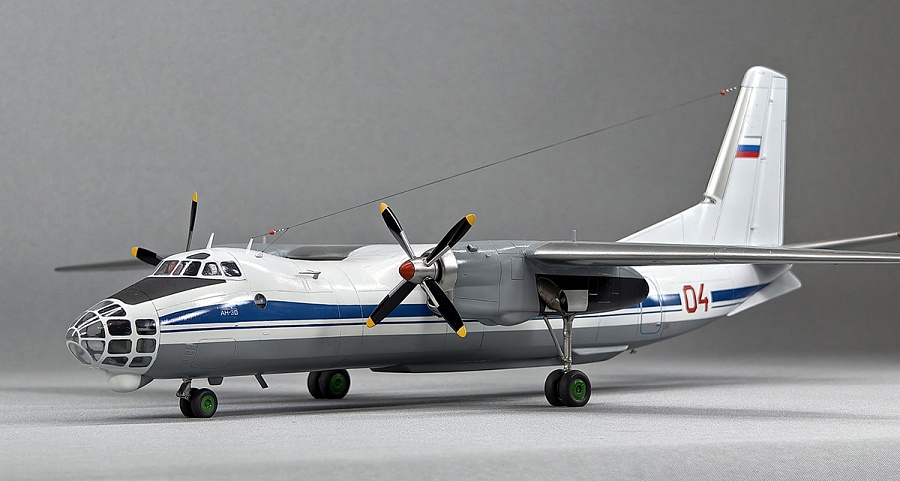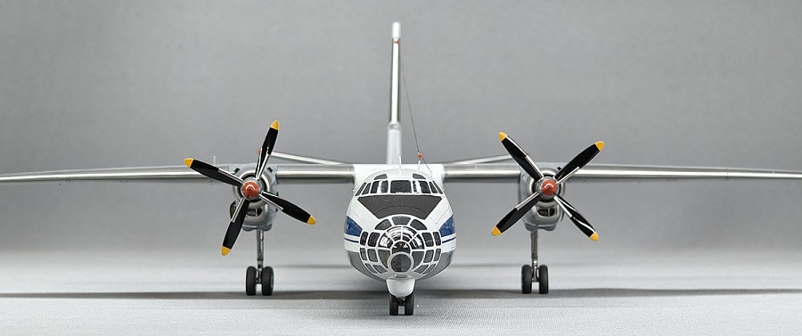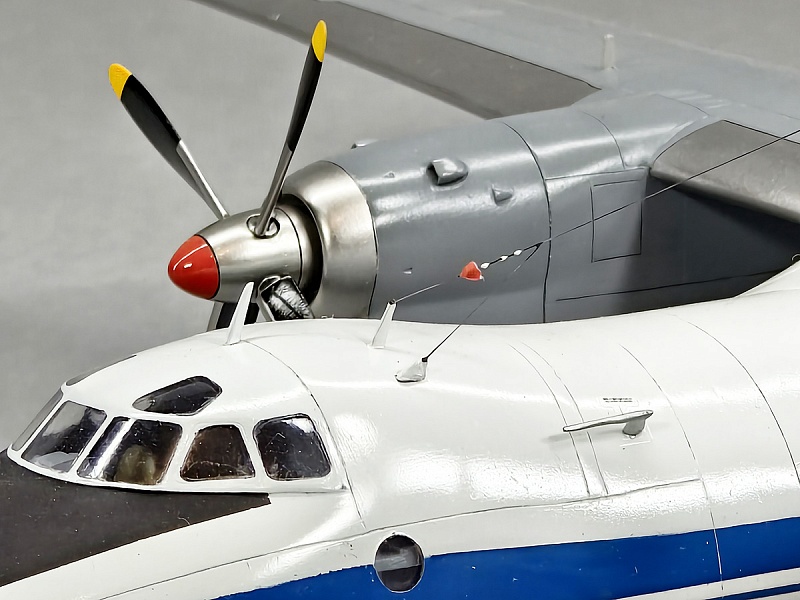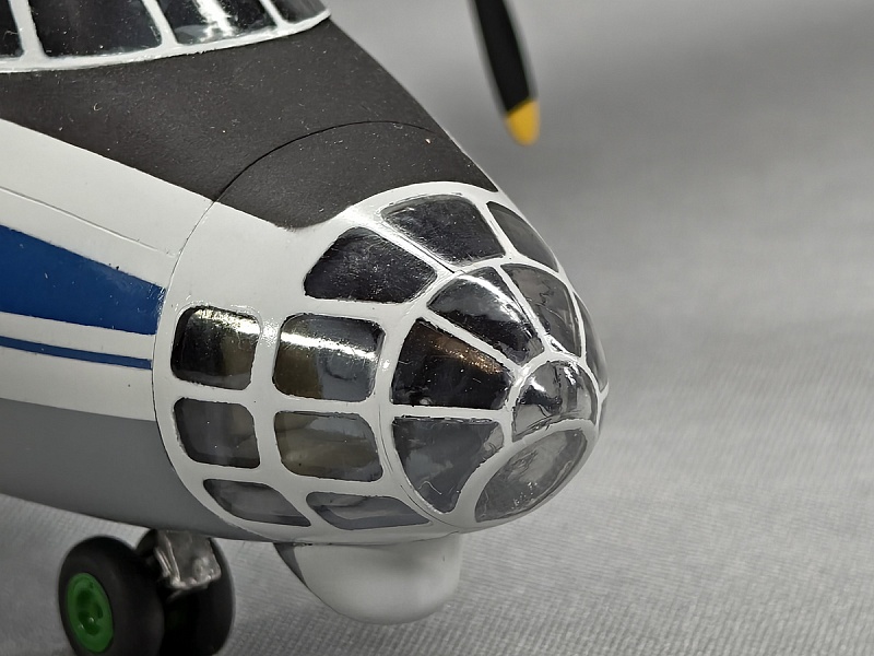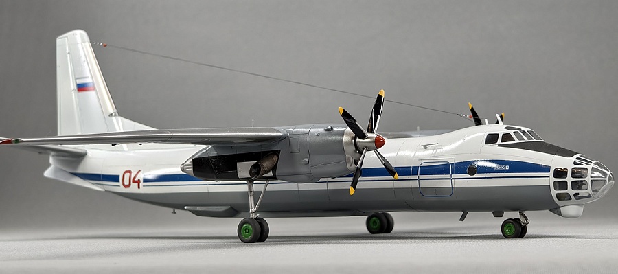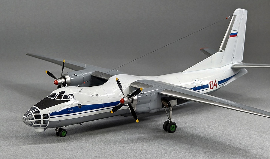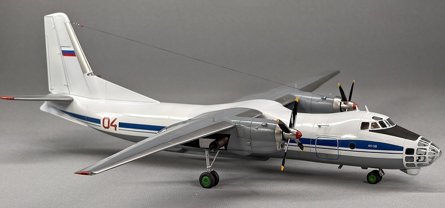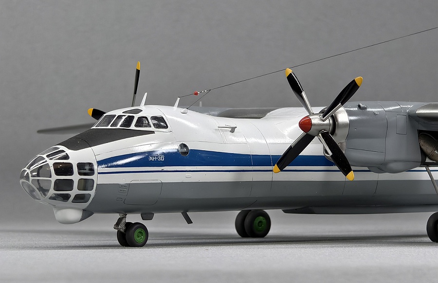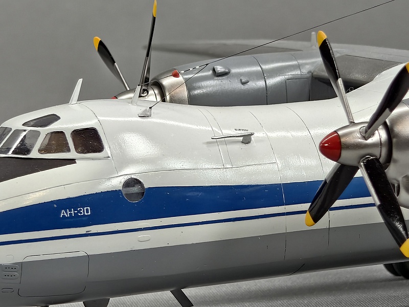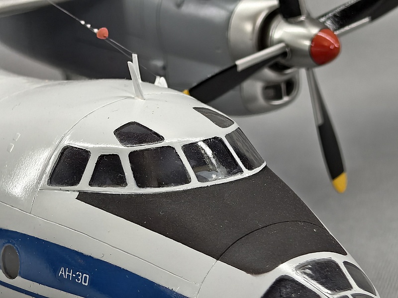 Модель собрана довольно давно, хотел иметь хотя бы одну модель из серии Ан-24 и модификаций на его базе, Ан-30 оказался самый доступный. Сборка несложная, практически полностью из коробки, исключение антенные тросики. Традиционные для Amodel шпаклёвка в большом количестве и зачистка, всё присутствовало. Краска спиртовый акрил от Mr.Hobby и его же металлики, грунтовка не использовалась, у краски довольно приличная адгезия. Окраска по реальному борту, полосы по борту окрашены по маскам из малярной ленты. Отснята модель на телефон.