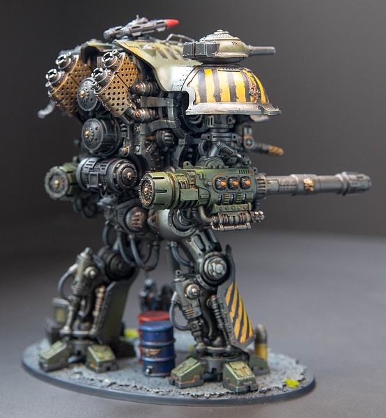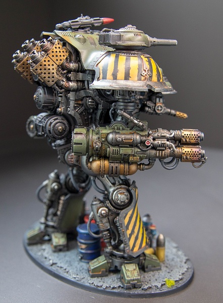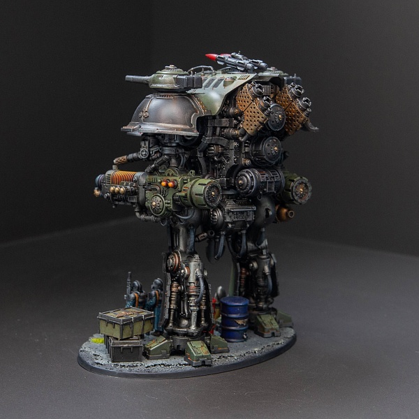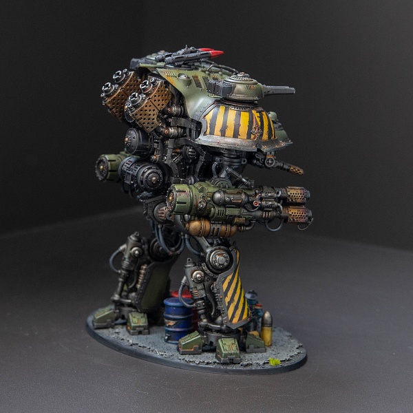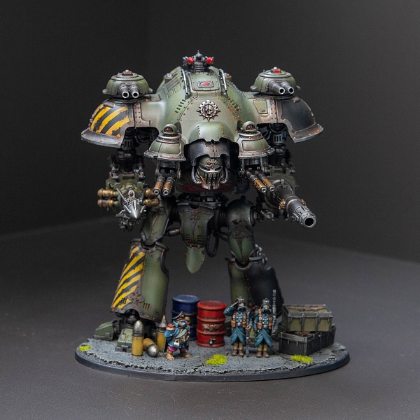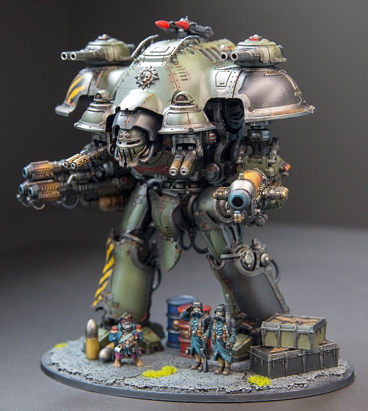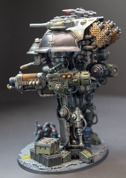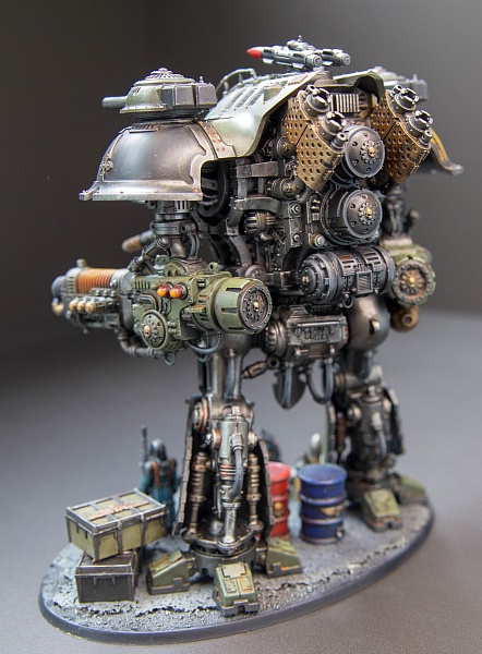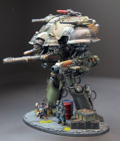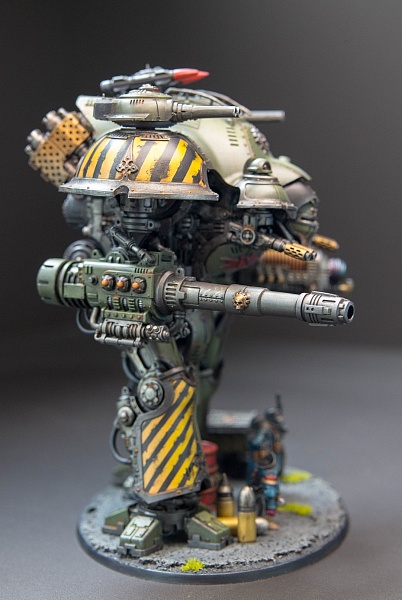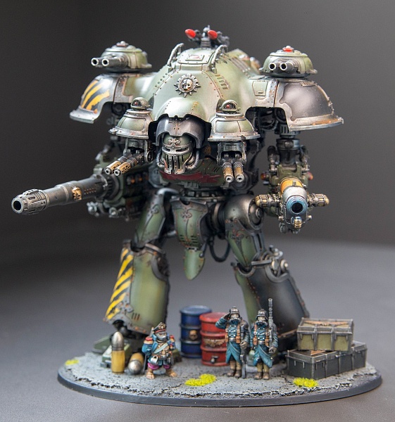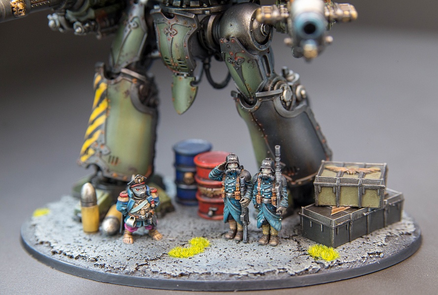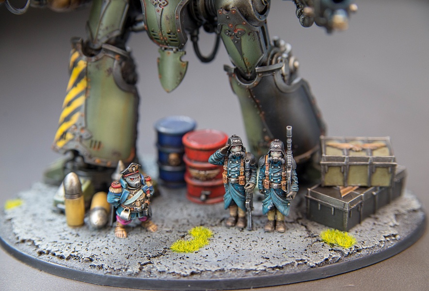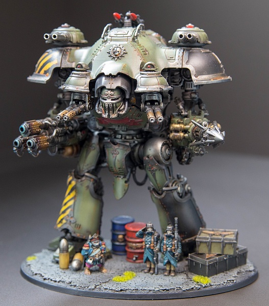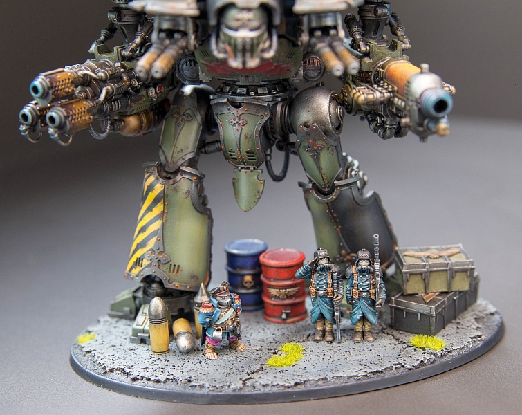 Давно хотел покрасить огромного человекообразного робота и вот случай представился. Для понимания масштаба и пафоса Imperial Knights родилась идея оформить базу в виде мини диорамы на тему приключений Пупы и Лупы. Пупа, Лупа и персонаж в малиновых штанах - 3Д печать, остальное - по сусекам наскреб.
