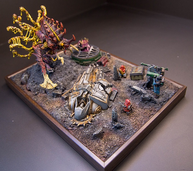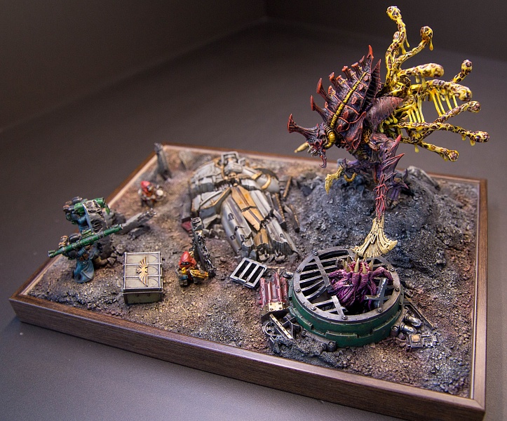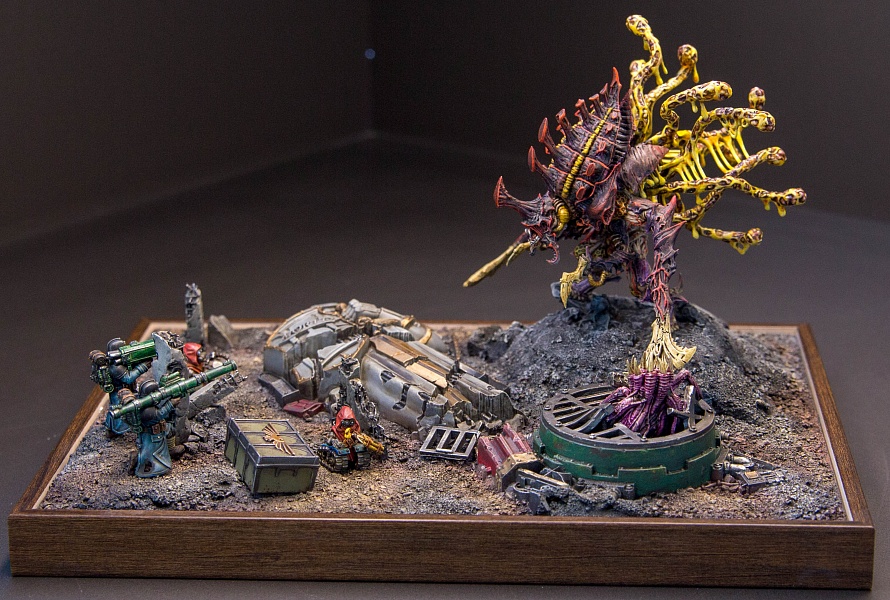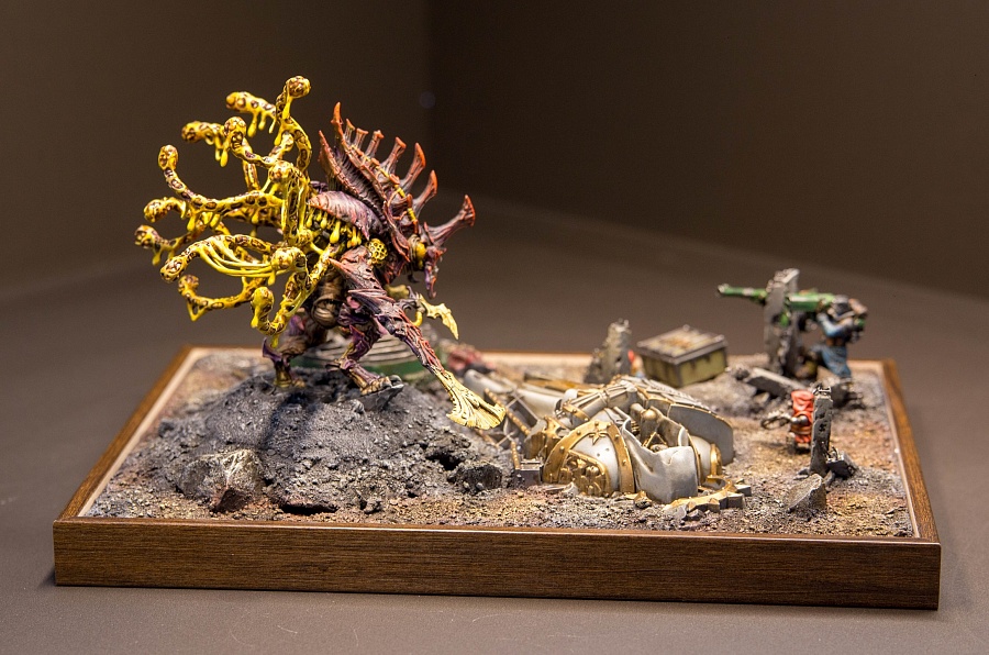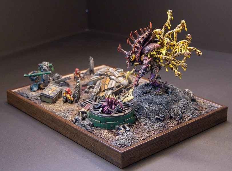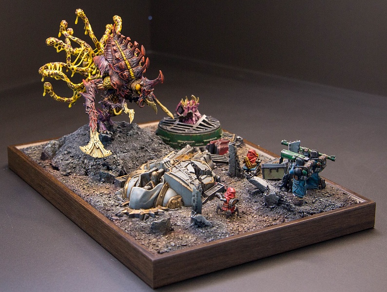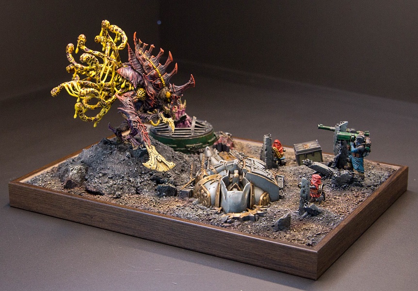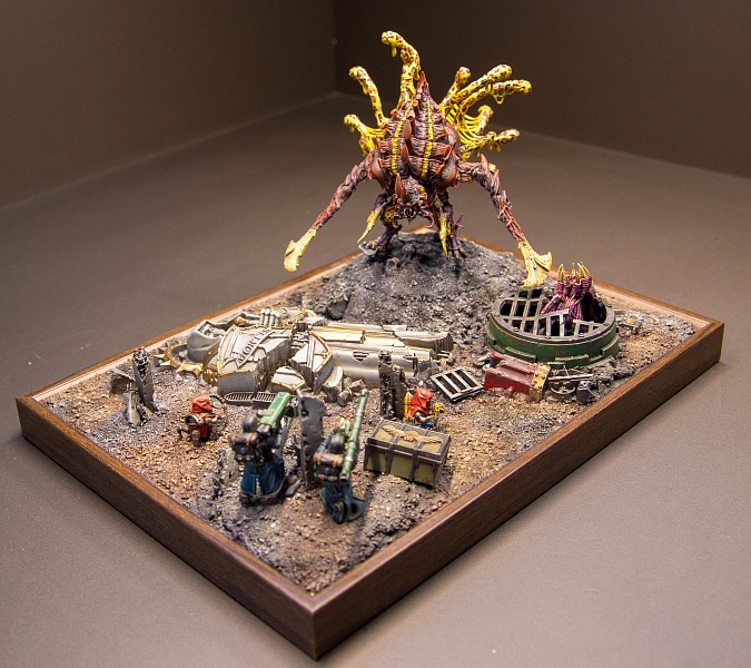 Пупа и Лупа опять в гуще событий. Шутка ли! Вторжение космических тараканов! С главным тараканом пришлось повозится со щупальцами. Перекрашивал 4 раза. Персонажи и антураж - 3D печать и фрагменты террейна для вахи. Подставка 24х17 Краски как обычно масло, Citadel, Paciffic, контрасты Speed paint.