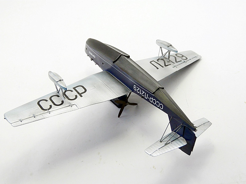 Красивенько так получилсь, хотя черным (то бишь "кузбасс-лаком") надо было бы покрасить весь низ до ватерлинии, а не только днище. И самое интересное. А вот действительно ли так было на самом деле? Ну если бы самолет был военный, то как бы логично, защитная окраска, под цвет моря. Но! Самолет то был гражданский. И ему наоборот в случае чего надо бы быть наиболее заметным на фоне моря. Ну не идиоты же были в тогдашнем "Аэрофлоте"! Никому такая мысль не приходила в голову? Вон ведь, например, кораблики, лодочки чаще бывают белымии.
