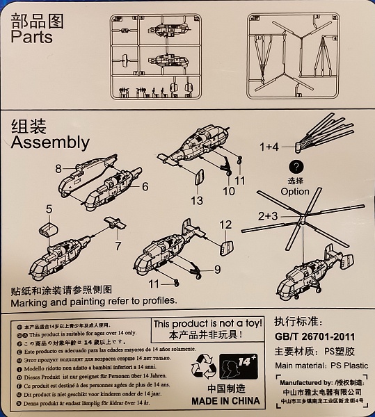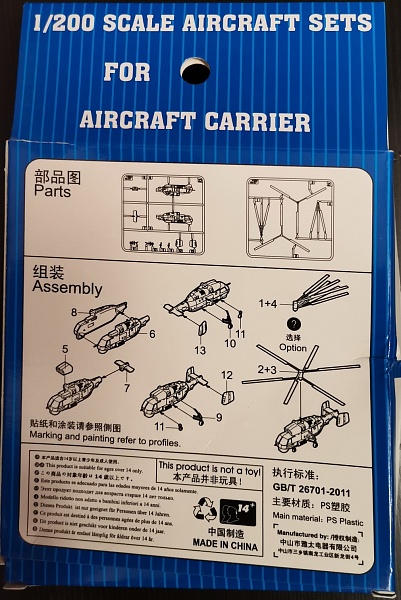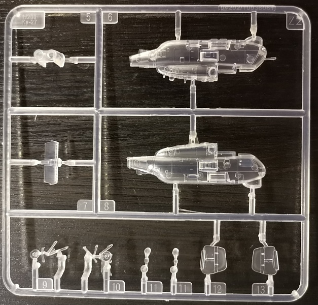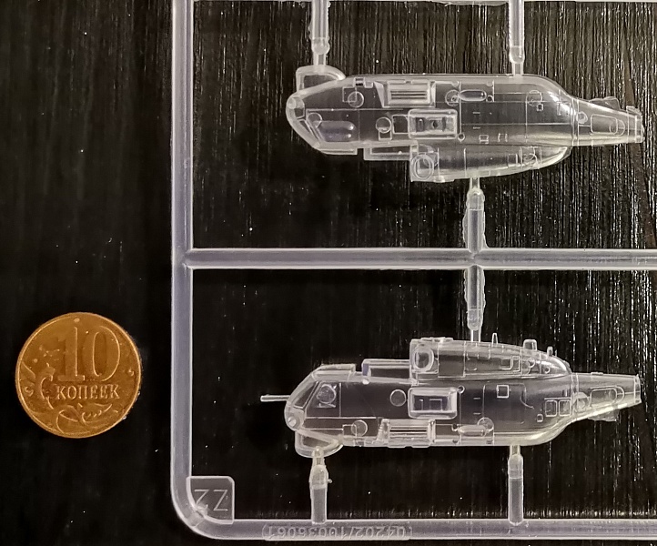 Эти мураши завелись у меня по воле заказчика на очередного "херпёныша". Я ожидал стать обладателем одного вертолётика, а получилась пятерня... Набор содержит отливки на 5 единиц вертолётов, оно и понятно теперь, ведь они не просто для полочки созданы, а для довольствия на каком-либо авианесущем корабле 200-го масштаба.Доставка в пункт одного их очень известного маркетплейса осуществлялась прямиком из Поднебесной, и коробка с трудом пережила этот путь - повело её изрядно, несколько мелких деталюшек слетели с литников и болтались в пакетиках.Инструкция по сборке нанесена прямо на тыльную часть коробки, и никаких листков внутри нет (кроме декали, конечно).На боковинке коробки есть цветные профили вертолёта для подбора окраски.Всего в наборе 10 литниковых рамок - по 2 на модельку, из которых одна рамка полностью посвящена несущим винтам. При этом, вертолёты можно собрать в 2-х вариантах: со сложенными лопастями, и разложенными.Литьё аккуратное и достаточно подробное для такого масштаба, расшивка тонюсенькая, внутренняя. Сам пластик прозрачный и напоминает по фактуре звёздовский прозрачный пластик - вязковатый и полуматовый. Прозрачность остекления не сравнить со слезой младенца, может конечно, офутуривание поможет...Если присмотреться на фото к рамкам с половинками фюзеляжа, то виден один принеприятнейший момент - на левой половинке один из толкателей пресс-форм попал в аккурат на боковое стекло, хотя может он и не будет сильно заметен на модели, так как это боковое стекло является блистерным и кругляш толкателя размывается.Что касается несущих винтов, то я сначала обрадовался тому, что винты уже имеют провис лопастей, но приглядевшись, оптимизм поубавился - лопасти изогнуты в разные стороны, какая куда... Но пластик довольно вязкий, думается, что выдержит испытания по изгибам в нужную нам сторону.Декалька достаточно простая - 10 ОЗ НОАК. И тут придётся заняться творчеством - заказчик сугубо гражданский коллекционер...
