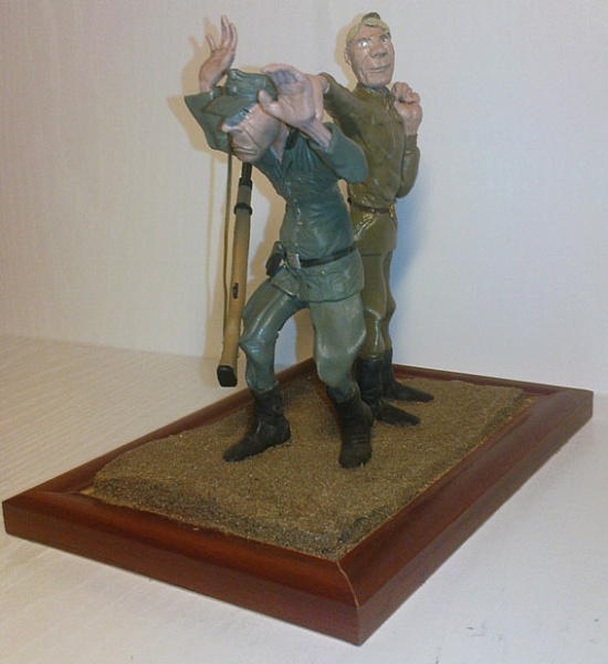 Доброго времени суток уважаемые коллеги! Выставляю на справедливый суд очередной шарж. Небольшая диарамка посвященная задержанию германского пехотинца соетским штрафником. (Собственно фриц тоже из этих печально знаменитых частей - по крайней мере за основу взята форма германского штрафника). Сами фигурки вышли более-менее, чего не скажешь о качестве снимков. Виной тому безвременно сдохший цифровик... Поэтому прошу табуретками сильно не швыряться - снимал на сотовый. (Всё же 3,2 МПкс маловато будет.) Красил тамией, аканом. Везеринг тамия. P.S. В связи с отвратным качеством фотоснимков работу выкладываю в песочницу.