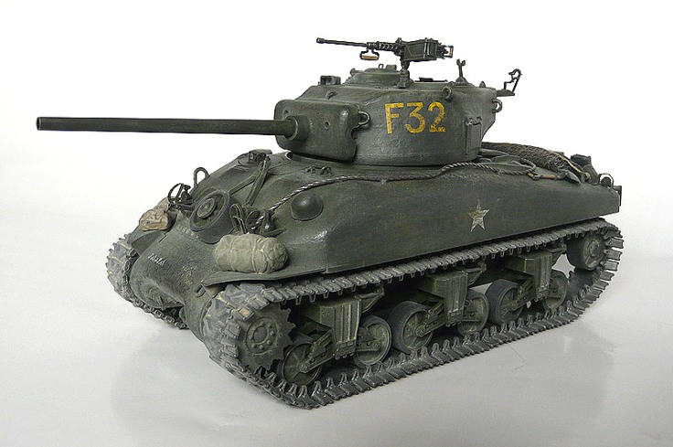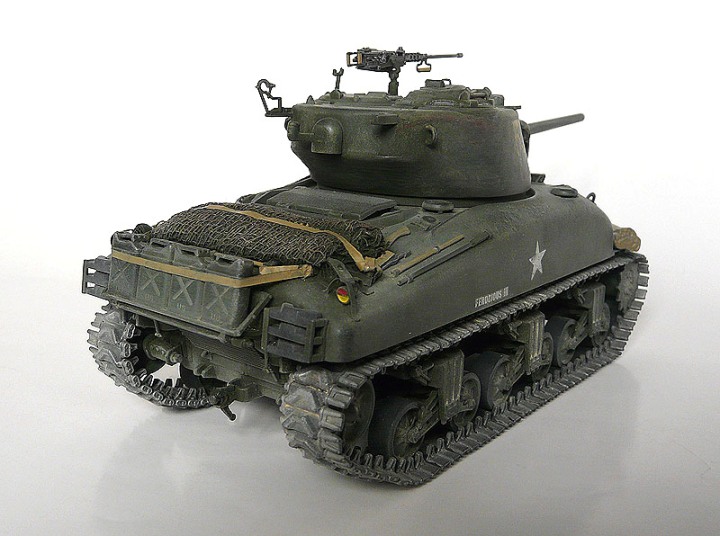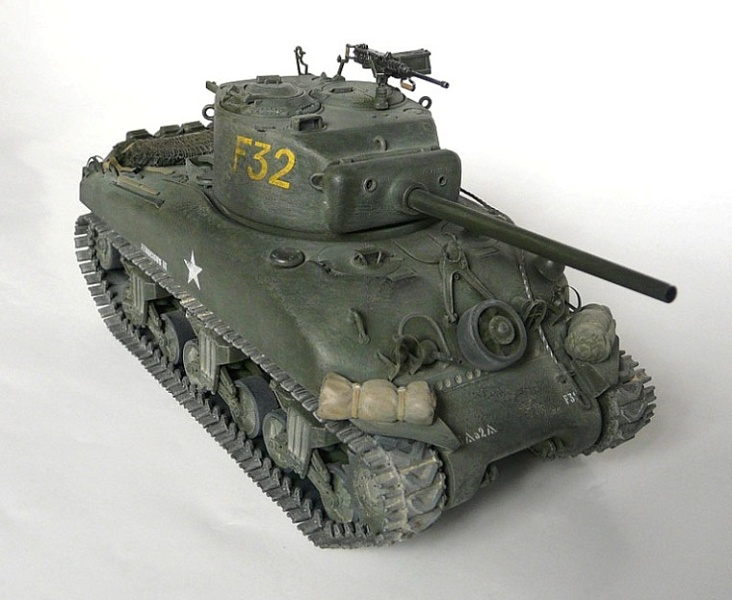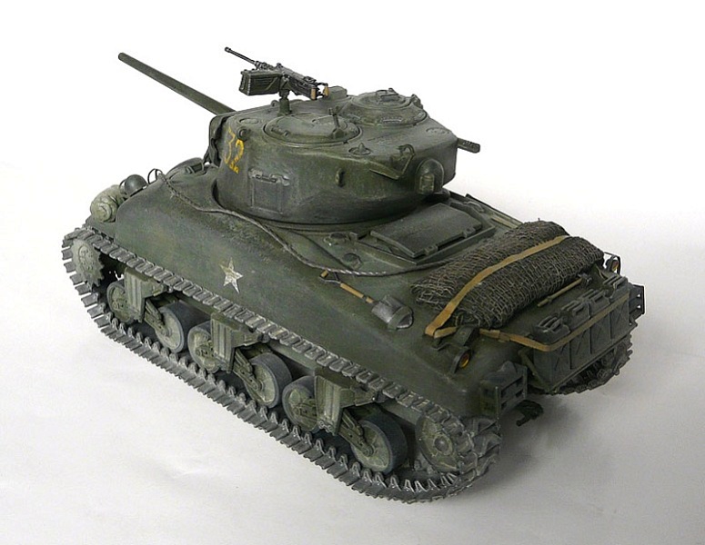 Как известно, в межвоенный период (20-30-е годы прошлого столетия) военное руководство США должного внимания развитию бронетехники не уделяло. Грянувшая Вторая Мировая по-новому заставила взглянуть на эту проблему, результатом чего стало создание в рекордно короткий срок одного из самых массовых и удачных для своего времени танков, по мнению ряда экспертов вошедшего в «десятку лучших». Повоевать танку с именем знаменитого генерала довелось на разных континентах и в разных армиях (СССР исключения не составил, но рассматриваемая модель в Красную Армию не поступала). А теперь о 35-й копии знаменитого Шермана. Поздний Дрэгон не перестает радовать моделистов как качеством и комплектностью, так и относительно демократичными ценами на свою продукцию. По крайней мере, от многих весьма искушенных в теме людей доводилось слышать, что аналогичная качественная модель, снабженная набором фототравления и металлическим стволом пушки, выпущенная западным производителем, стоила бы на полпорядка (если не на порядок) дороже. Хочу отметить возможность воспроизведения гусеничной ленты в различных вариантах (обрезиненная с шевронообразным грунтозацепом либо необрезиненная, стандартной ширины либо расширенная). Я лично остановился на варианте обрезиненной расширенной гусеницы. Радует большое количество прозрачных деталей (к примеру, объективы смотровых приборов), значительно «оживляющие» модель. Из прозрачного же пластика сделаны и фары. Их пришлось красить в 2 этапа (вначале с обратной стороны покрыл алюминиевым металликом от Тамийи, по мере высыхания поверх был нанесен цвет хаки от той же фирмы). К применению «травла» из коробки отнесся критически. К примеру – ограждения головок перископических приборов (в реальной жизни изготовлялись из прутка круглого сечения, а не плоского). От себя добавил 4 канистры на корме и 2 скатки на передних крыльях (спальный мешок и какой-то свернутый чехол, все из академовского наборчика для конверсии), а также свернутую масксеть из медицинской марли на крыше МТО. Все это имущество «закрепил» ремнями из пищевой фольги. Также нельзя не отметить большое количество «запчастей», остающихся после сборки (ситуация, знакомая еще по сборке «Айшермана» от того же Дрэгона). В хозяйстве все может пригодиться… Окраска – мало встречающийся (по крайней мере в статьях) китайский «Модел Кинг» (отдаленно напоминает АКАН). Сверху для имитации потертостей краски (не до металла) местами прошелся сухой кистью (Суперзвезда, «немецкий желто-оливковый»). Мелкие детали выделил тамийевской эмалью. Тонировка – графитная пудра (проще – измельченный грифель мягкого простого карандаша) и измельченные же пастельные мелки. Специально придал модели лишь слегка запыленный вид (по декалям, исходя из инструкции по сборке, машина использовалась во Франции с ее развитой сетью дорог с твердым покрытием, как никак, Европа-с…). Декали «приваривал» обычным столовым уксусом. По крайней мере, для Дрэгоновских наклеек – вполне жизнеспособный рецепт, даже без предварительного нанесения лака). А теперь – Ваше слово…