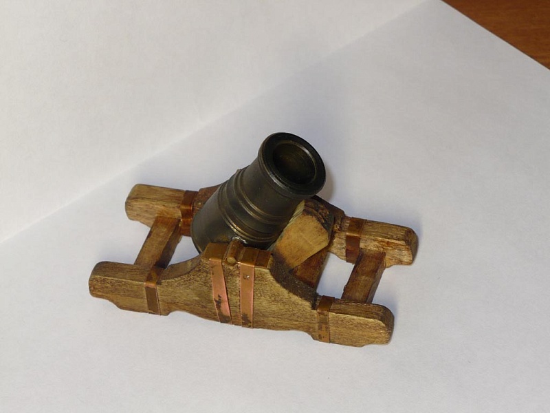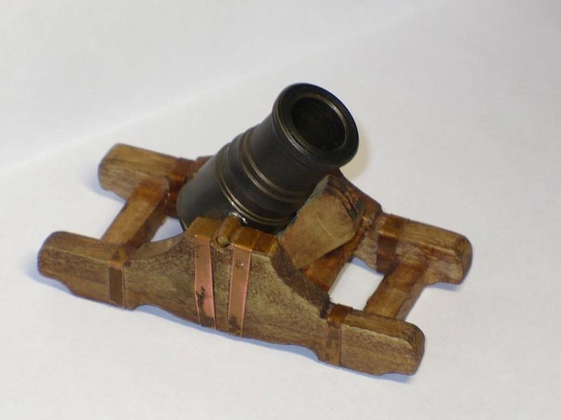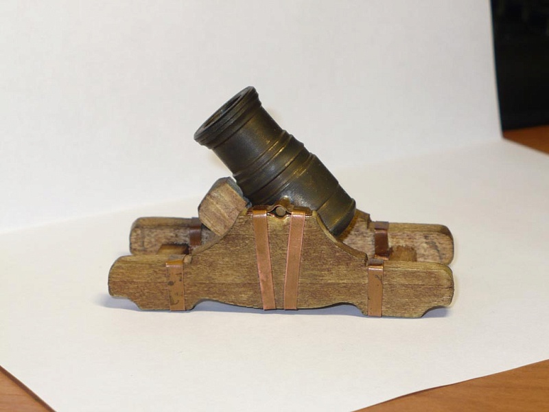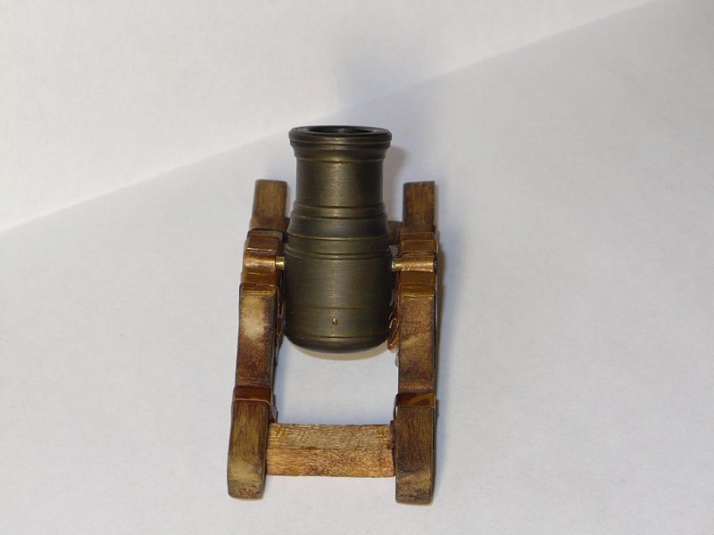 | Я выставляю вам на суд ещё одну модель.Это-осадная мортира XVII века, ствол из бронзвого прутка, лафет-дубовый. Ленты, прижимающие цапфы к лафету-медные. За качество фоток не ругайте. Пинайте, каску надел. |